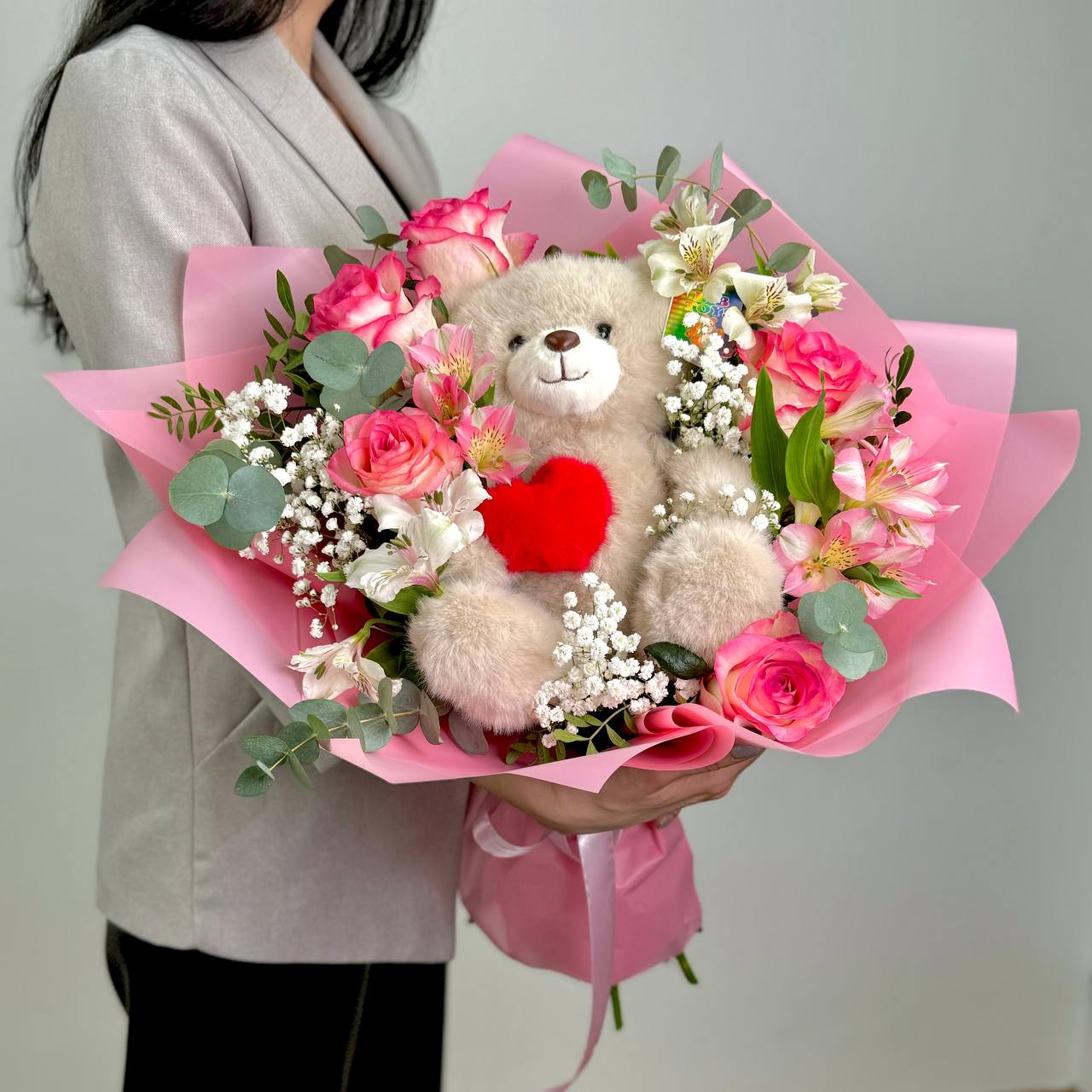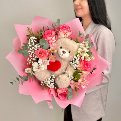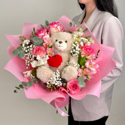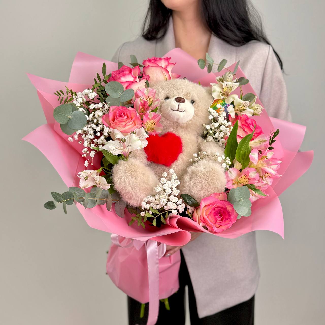 Зелень и эвкалипт дополняют композицию, придавая ей свежести и объема, а мягкая игрушка "Мишка" - это милый акцент, который добавит букету очарования и юмора.