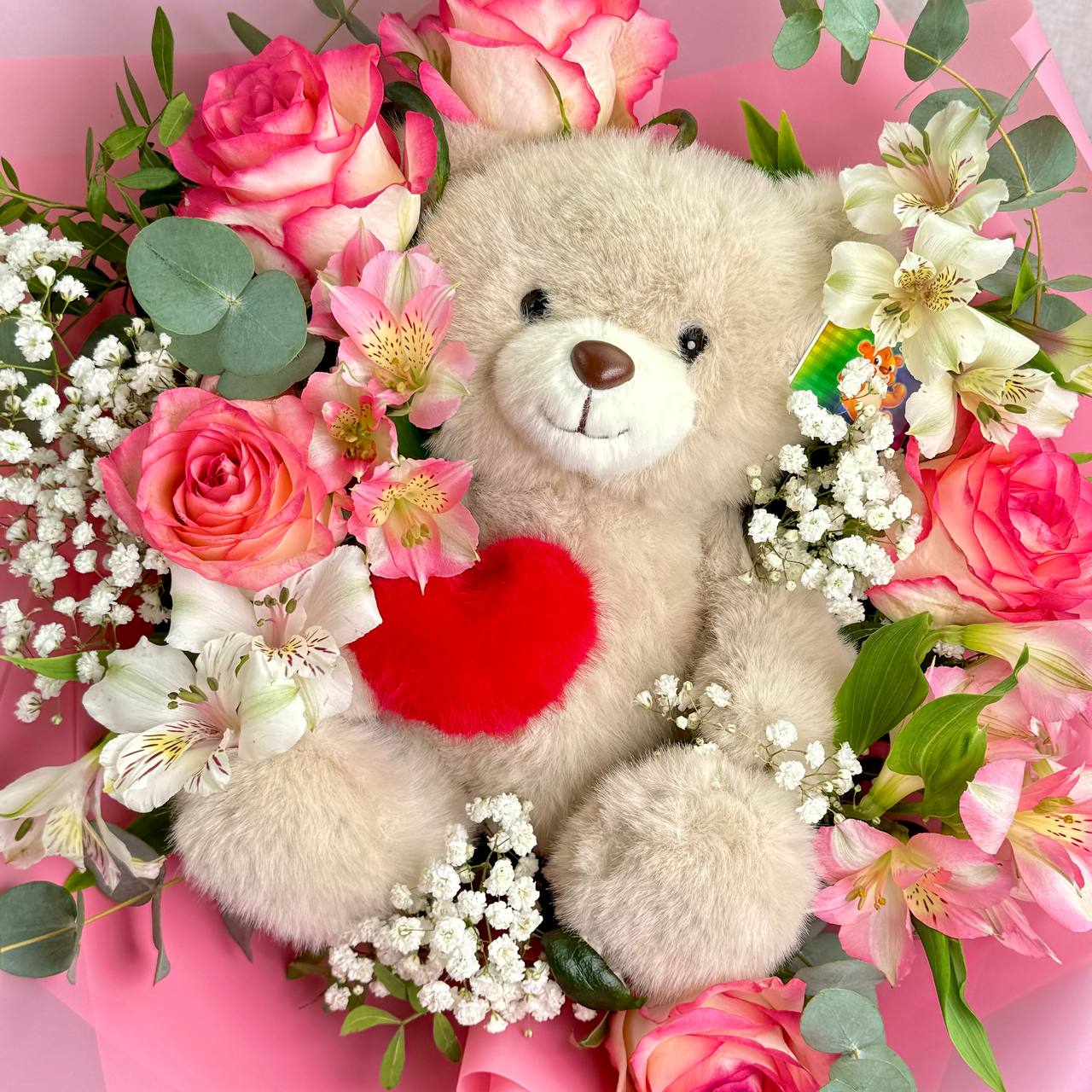 Роза «Россия Джумиля» — 5 шт., альстромерия — 4 шт., гипсофила — 1 шт., зелень, эвкалипт, мягкая игрушка «Мишка» — 1 шт., фирменная упаковка, атласная лента.