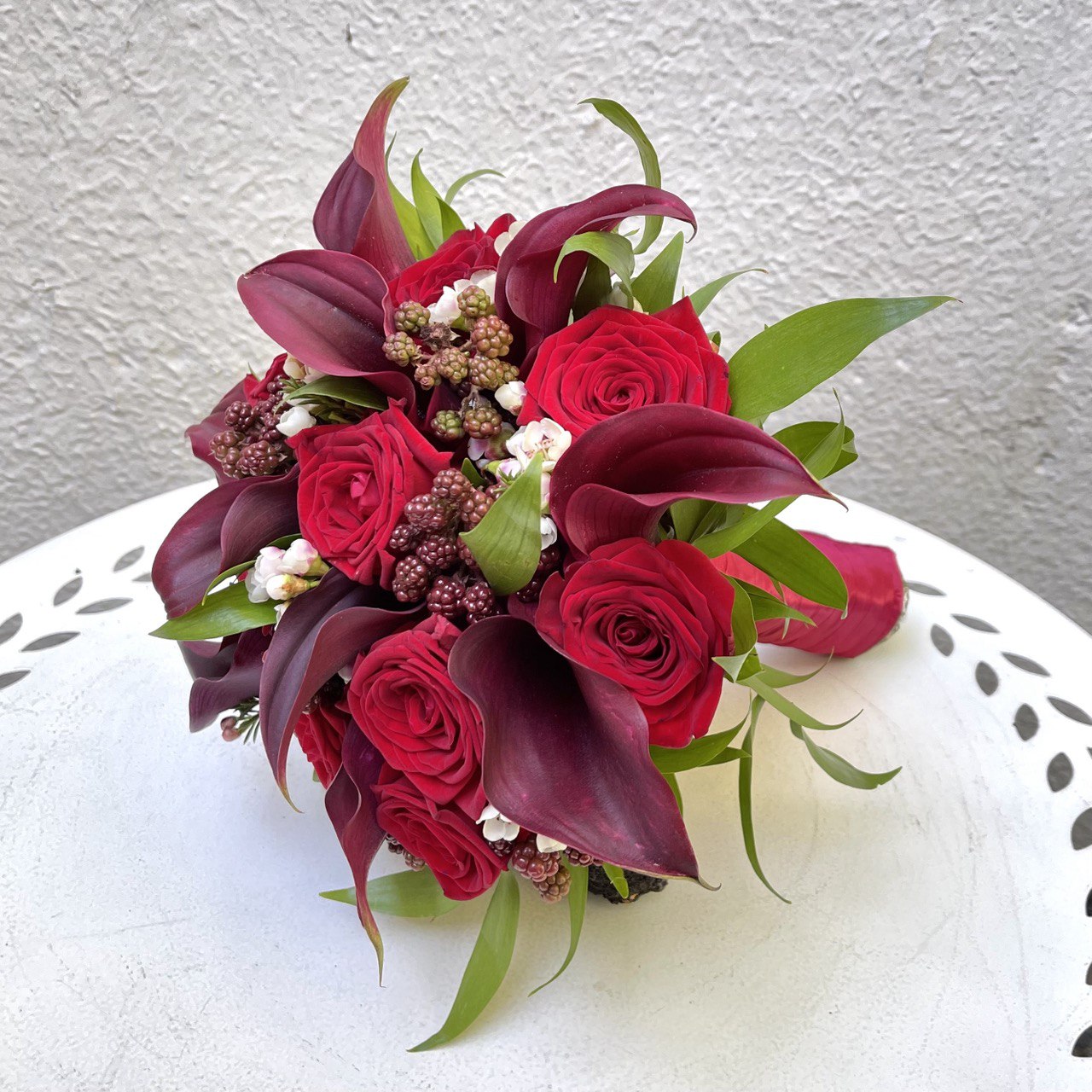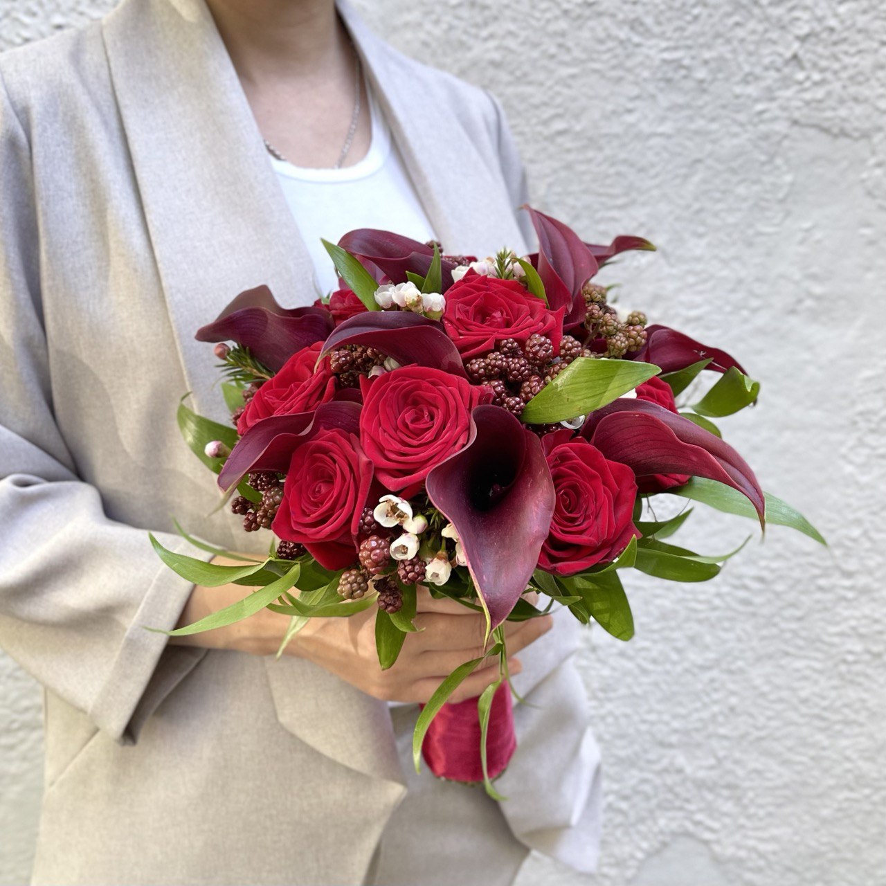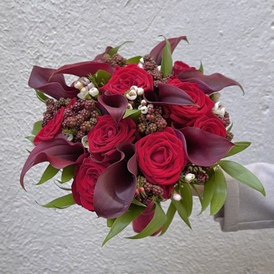 Роза «Ред Наоми» — 9 шт., калла — 9 шт., малина — 9 шт.,хамилациум, рускус, атласная лента.