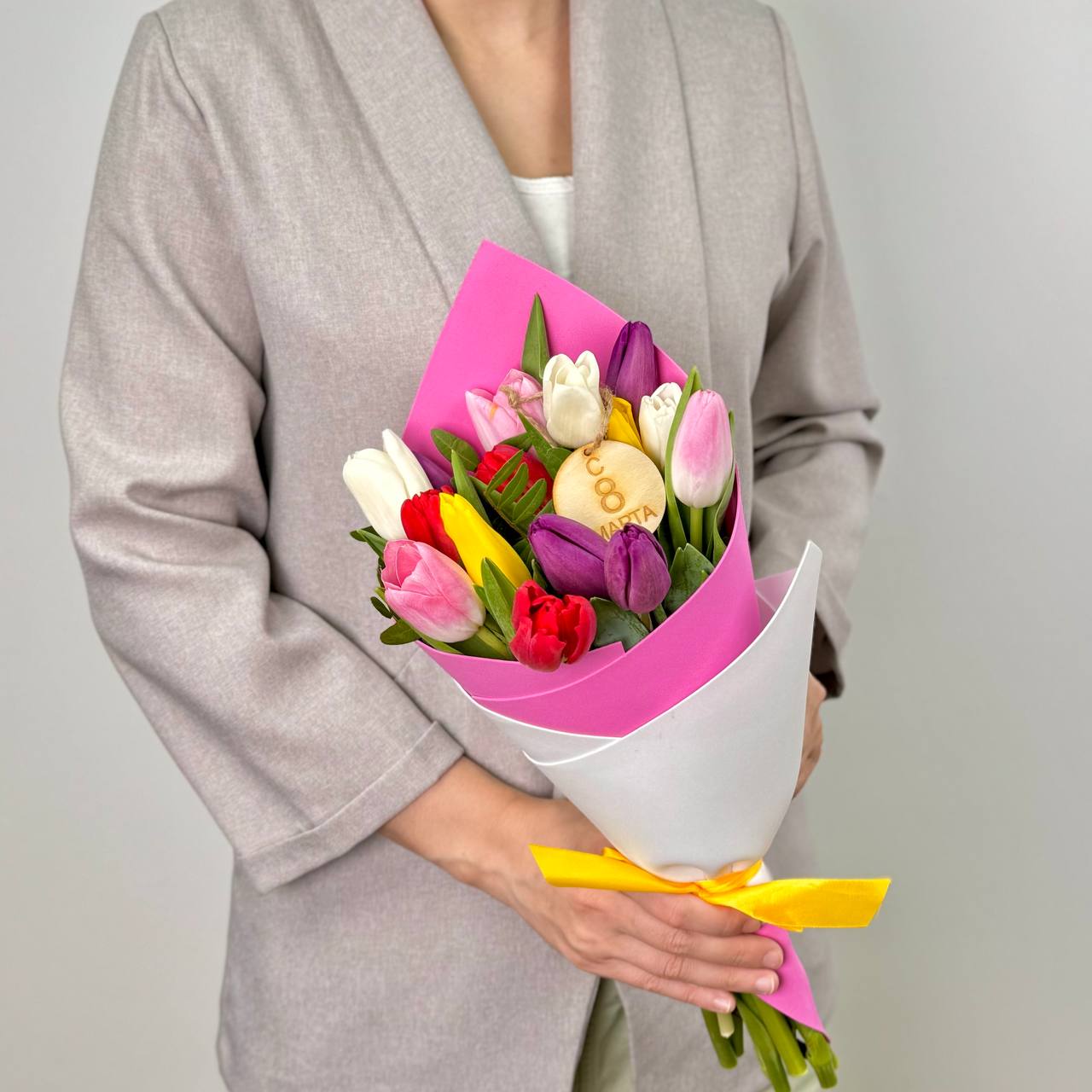 - Прекрасное сочетание: 15 пышных тюльпанов разных оттенков создают поистине восхитительный цветочный ансамбль.