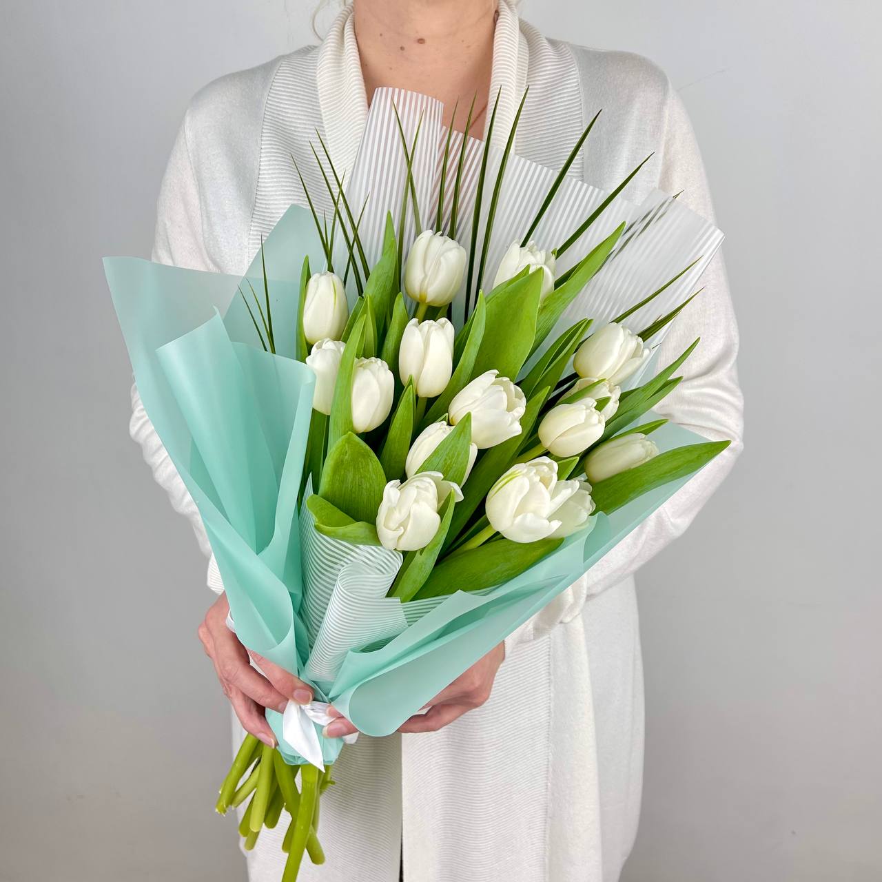 Тюльпан — 15 шт., рабелини — 1 шт., фирменная упаковка, атласная лента.