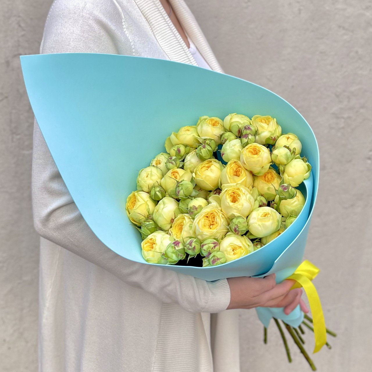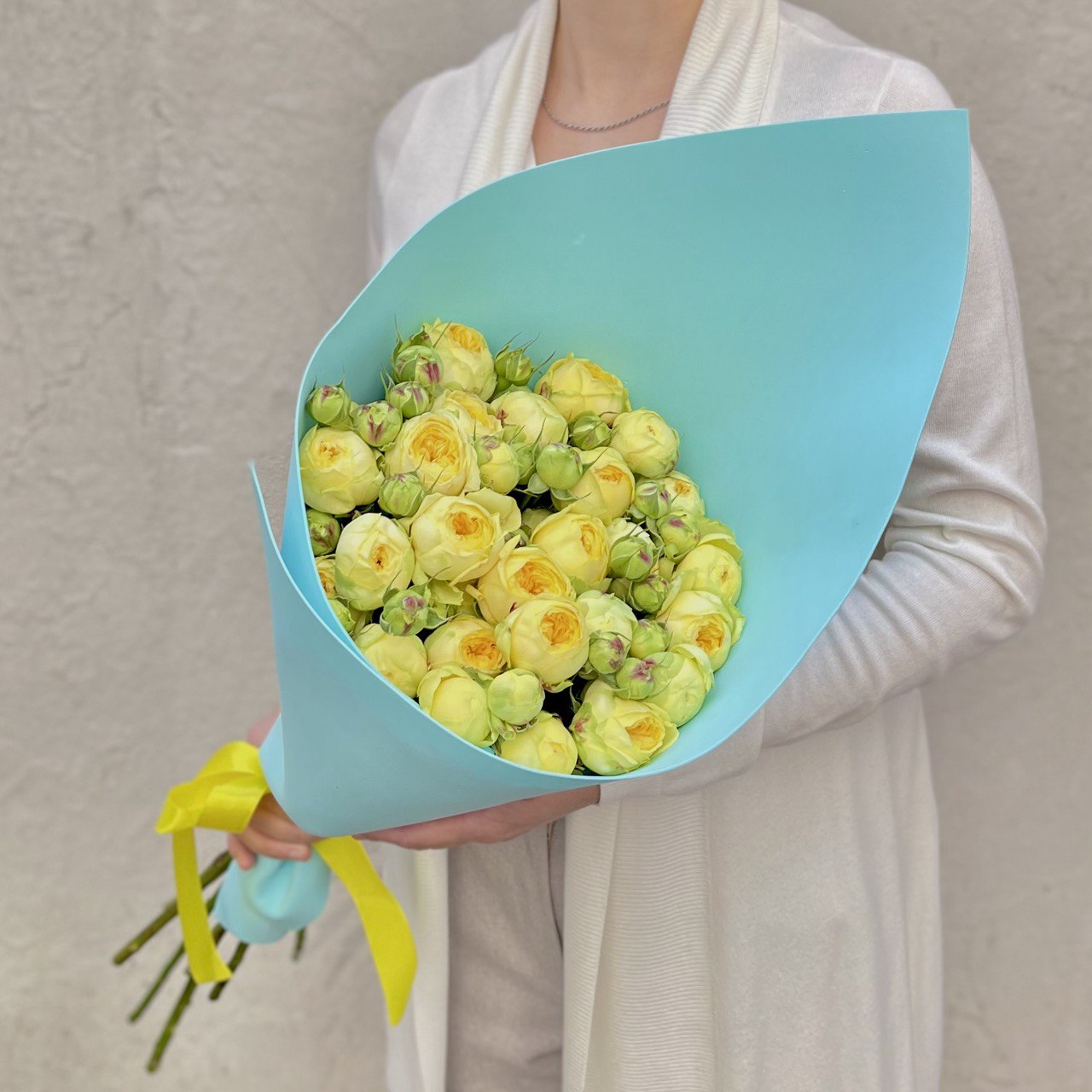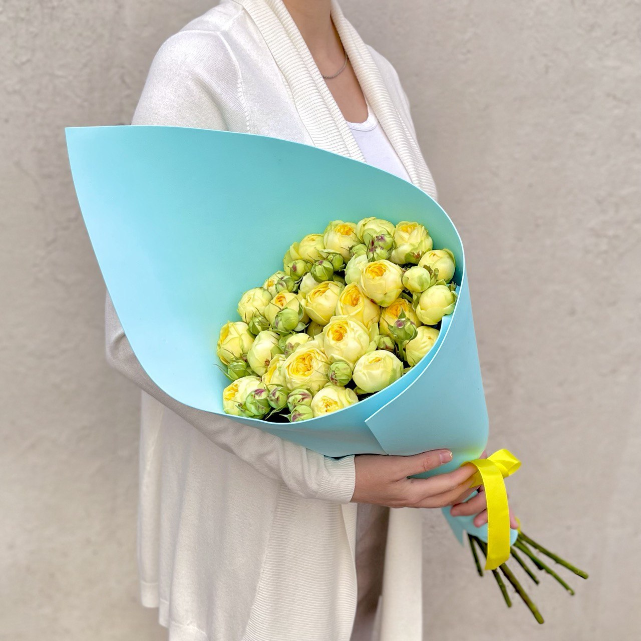 Роза пионовидная, кустовая «Пиони Баблс» — 9 шт., фирменная упаковка, атласная лента.