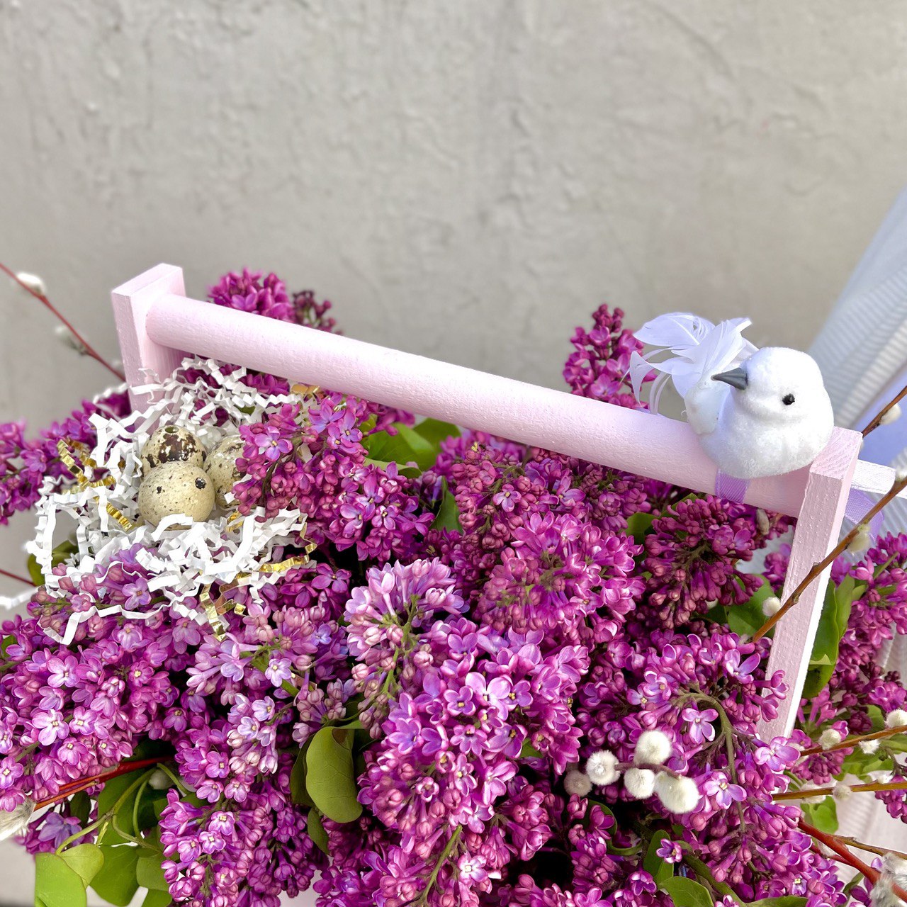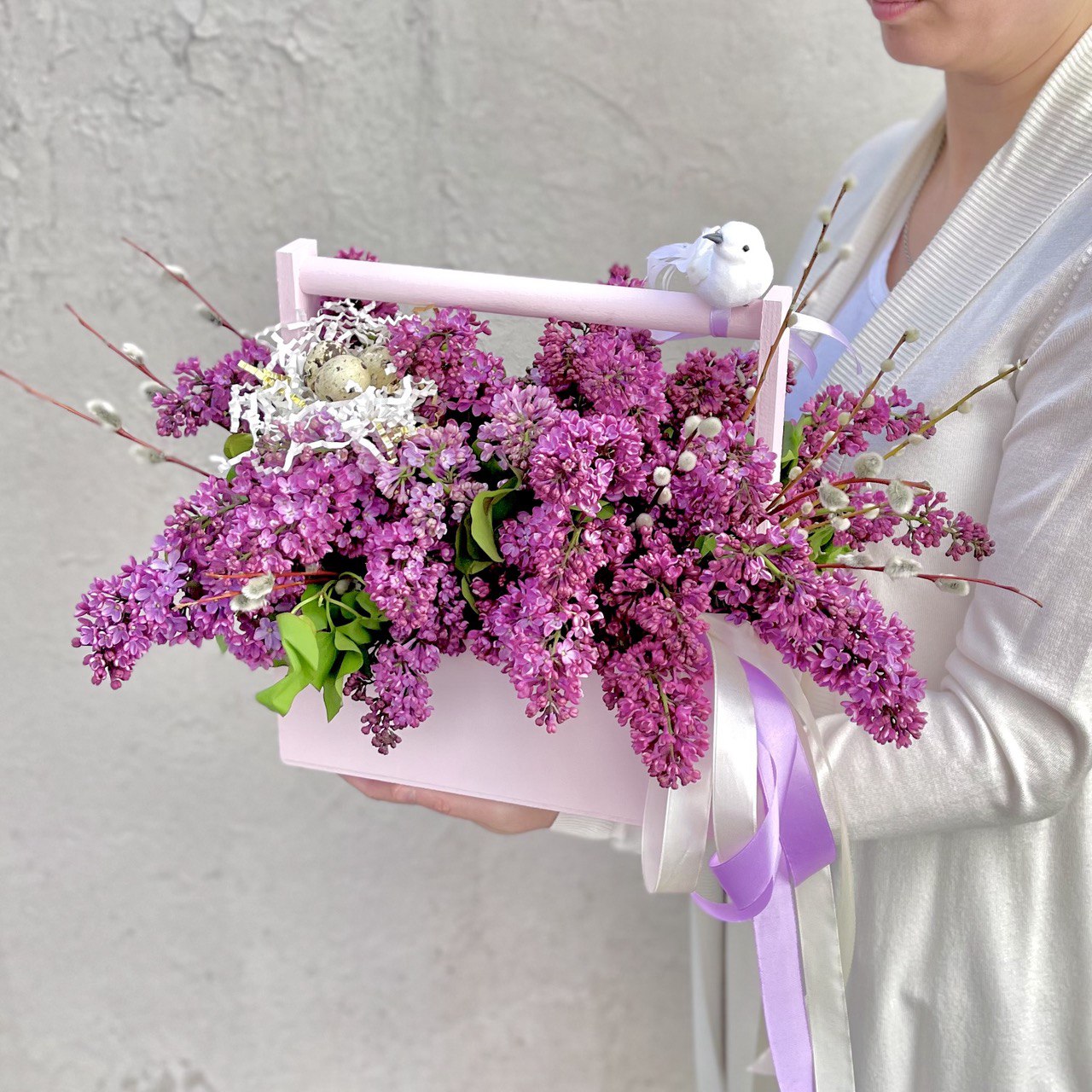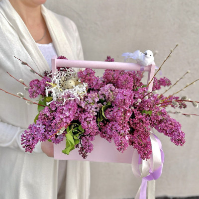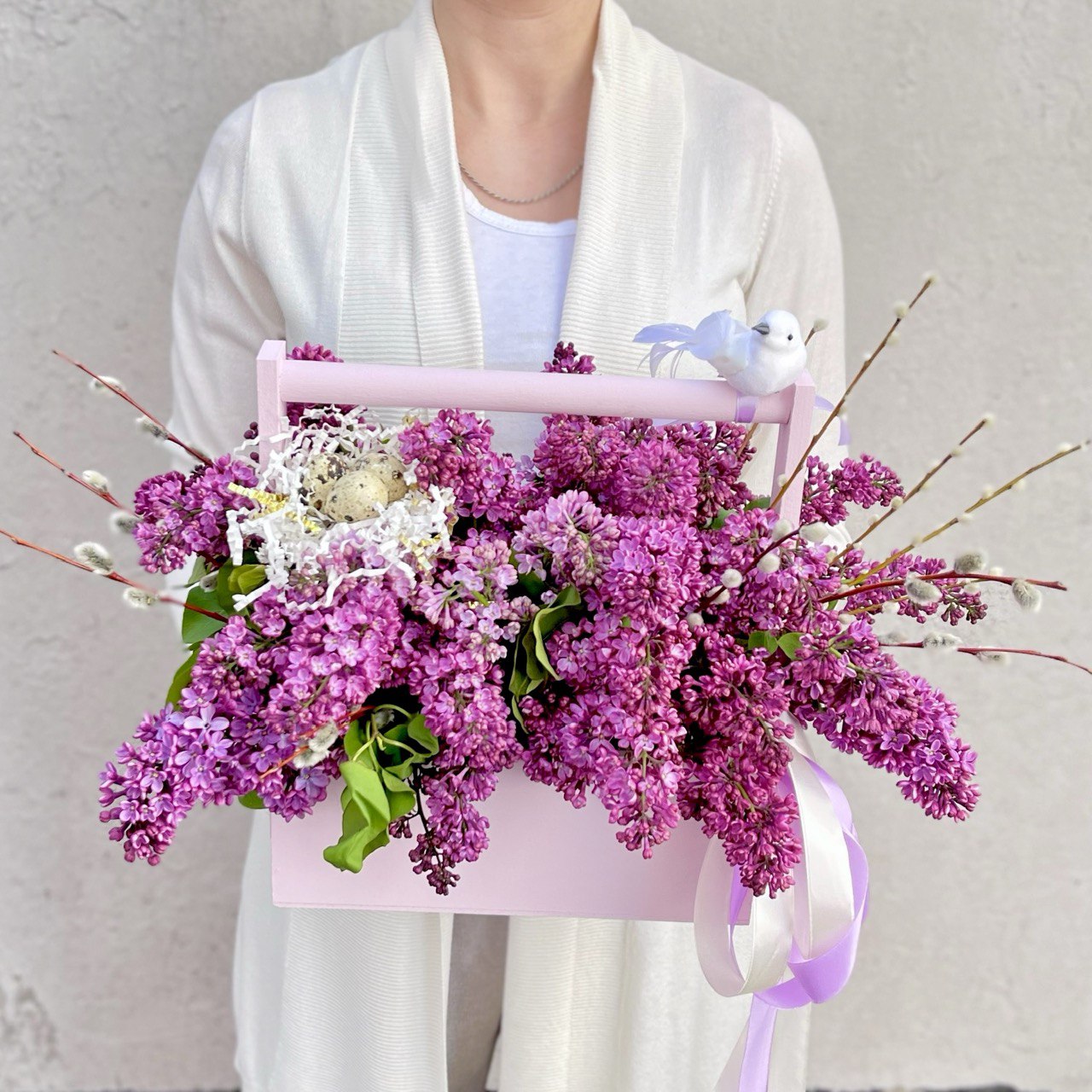 Сирень — 1 пучок, верба — 9 шт., птичка, декоративное гнездо, яйцо — 3 шт., ящик, флористическая губка, атласная лента.