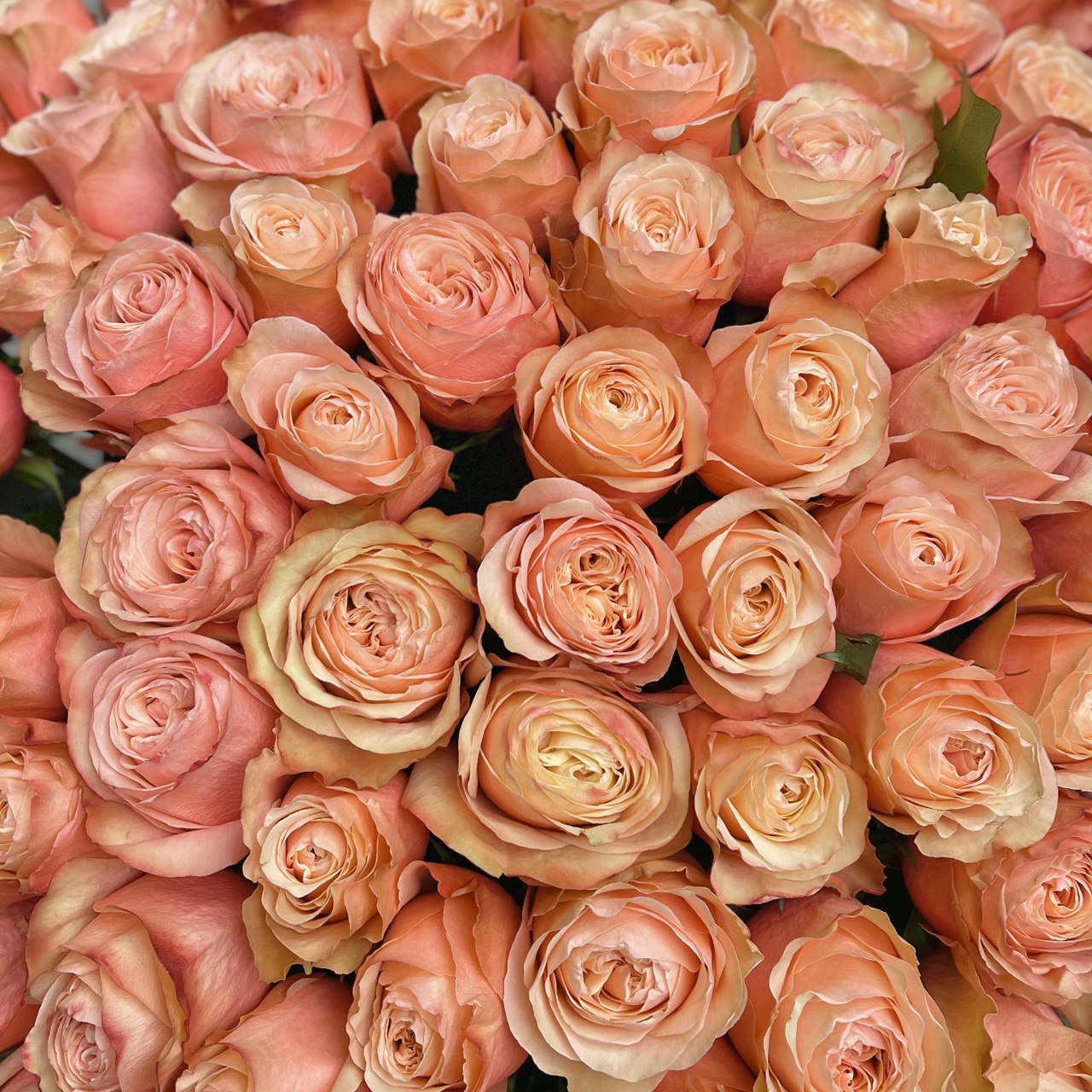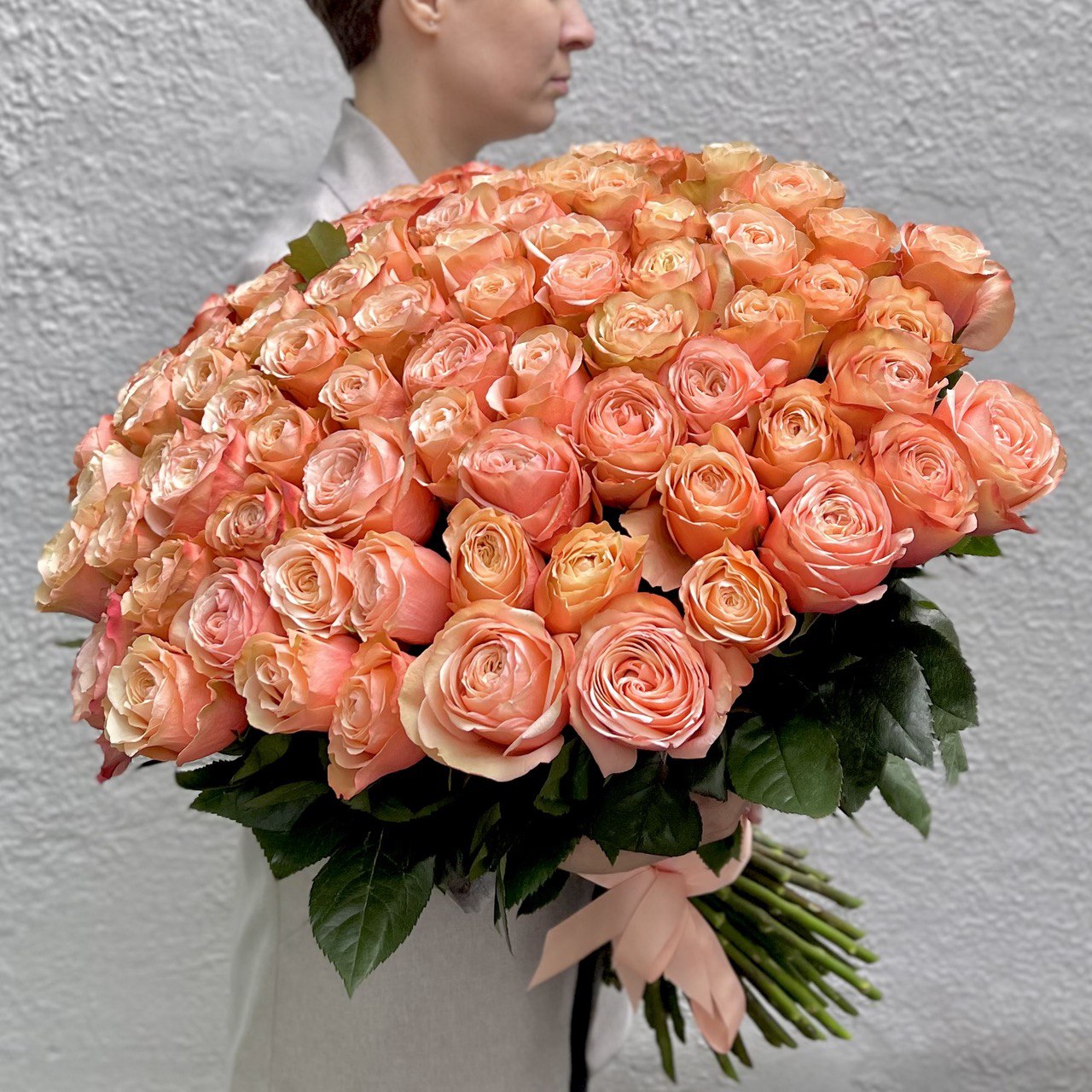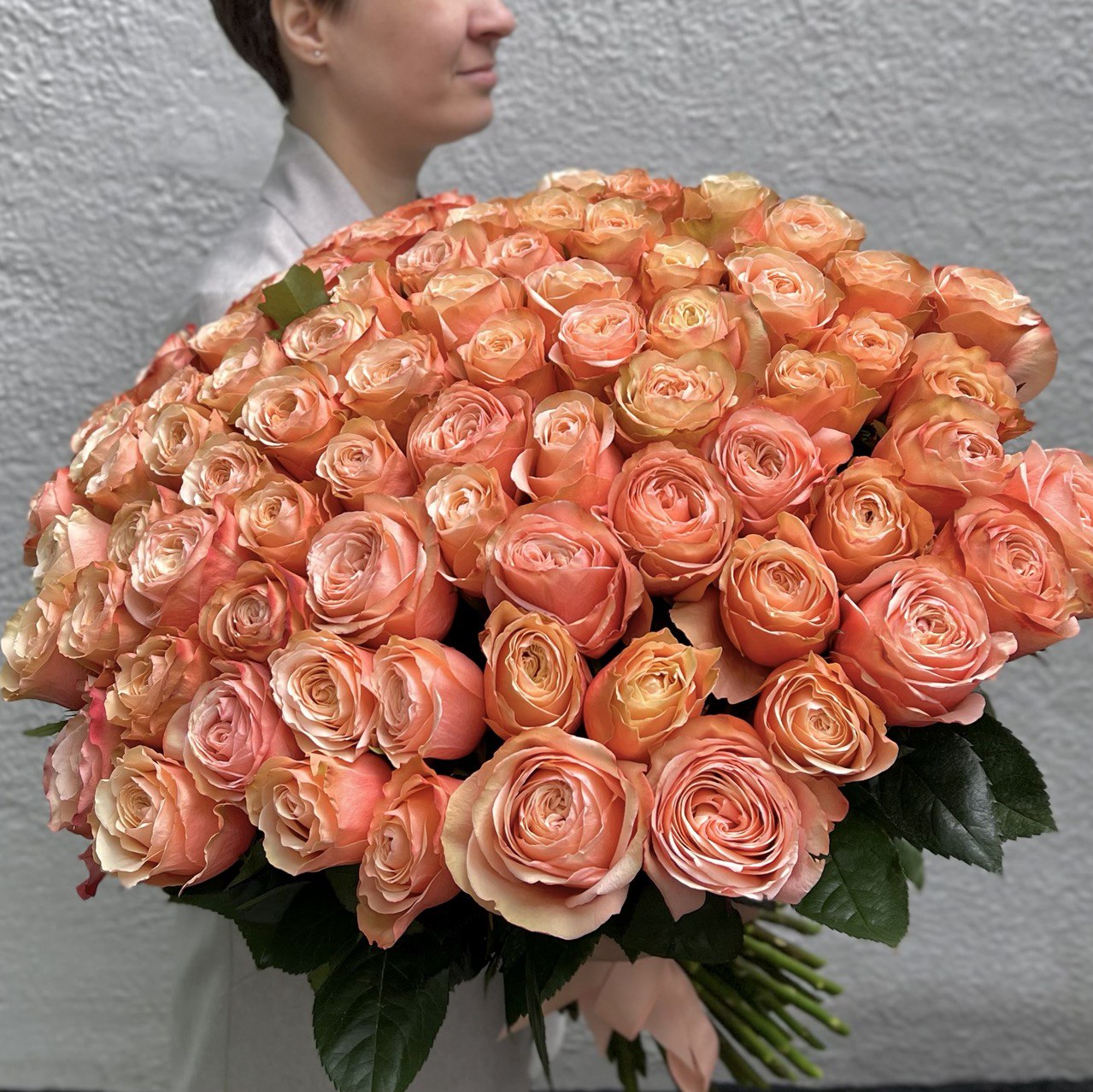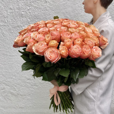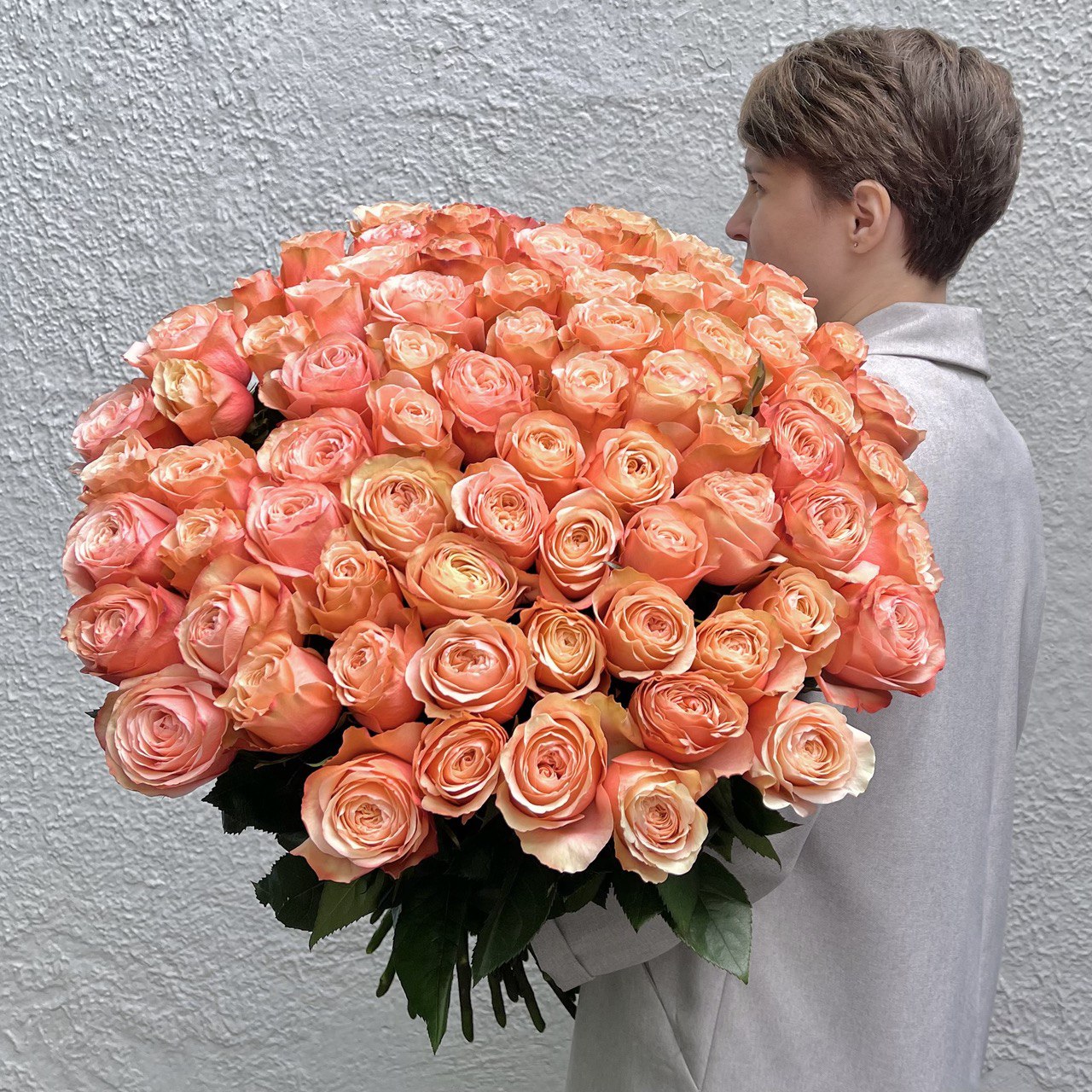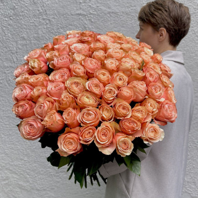 Величественная композиция из 75 пионовидных роз сорта «Эквадор Кахала» — это настоящий шедевр флористического искусства, способный покорить даже самое взыскательное сердце. Словно драгоценная корона, этот букет сияет благородством и изысканностью.