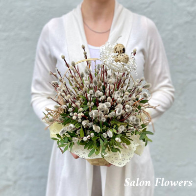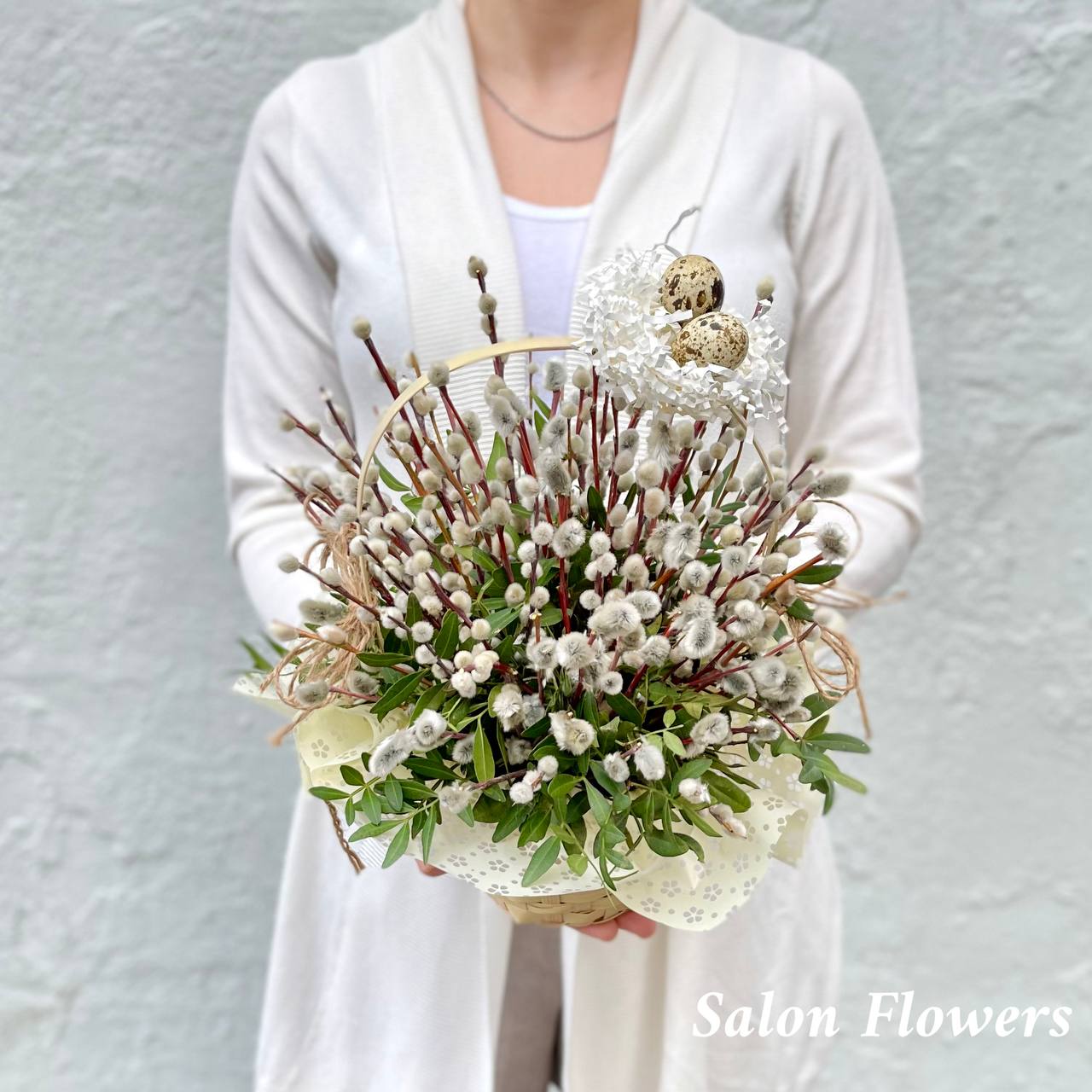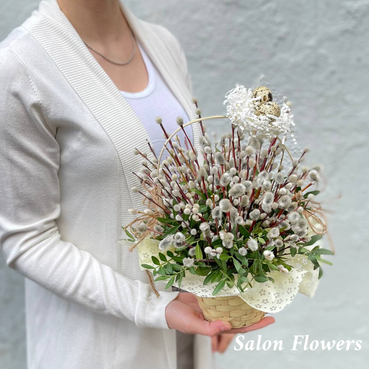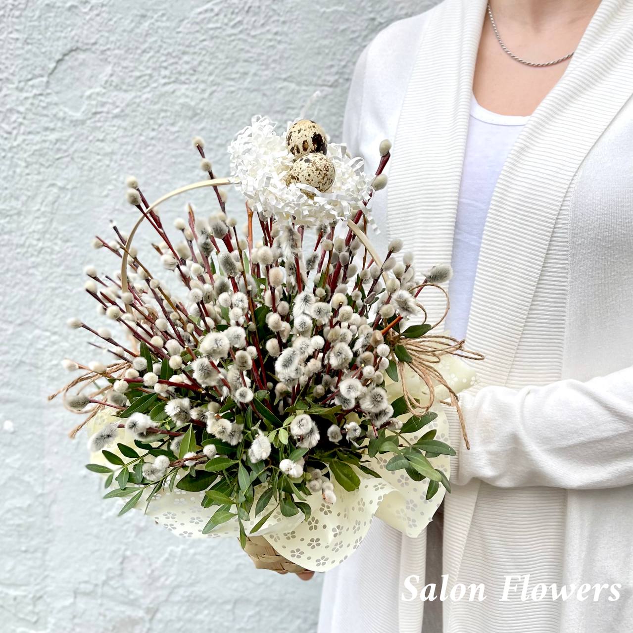 Верба — 51 шт., зелень, гнездо, яйцо — 3 шт., кашпо, флористическая губка, атласная лента.