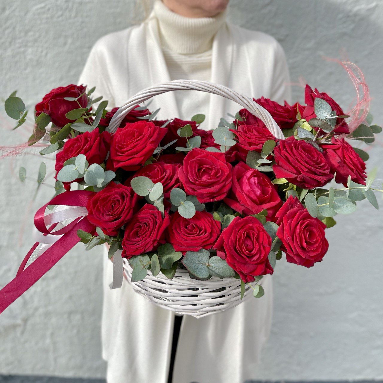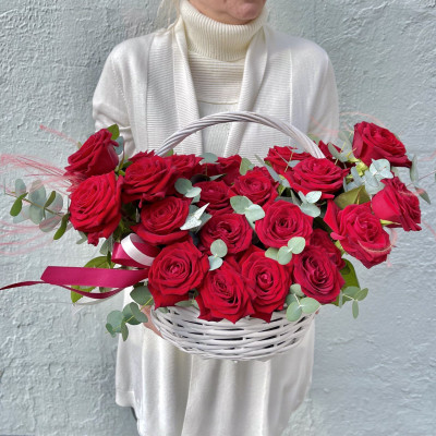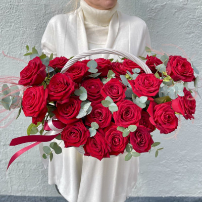 Роза «Россия Ред Наоми» — 35 шт., стифа — 3 шт., эвкалипт, корзина, флористическая губка, атласная лента.