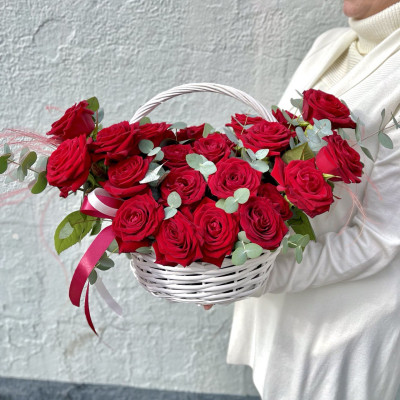 «Корзина Ред Лав» — это симфония страсти и элегантности, воплощённая в роскошной композиции из 35 роз сорта «Россия Ред Наоми», обрамлённых изящным эвкалиптом. Словно созданный для самых торжественных моментов, этот букет покоряет с первого взгляда благородством линий и глубиной чувств, заложенных в каждой детали.