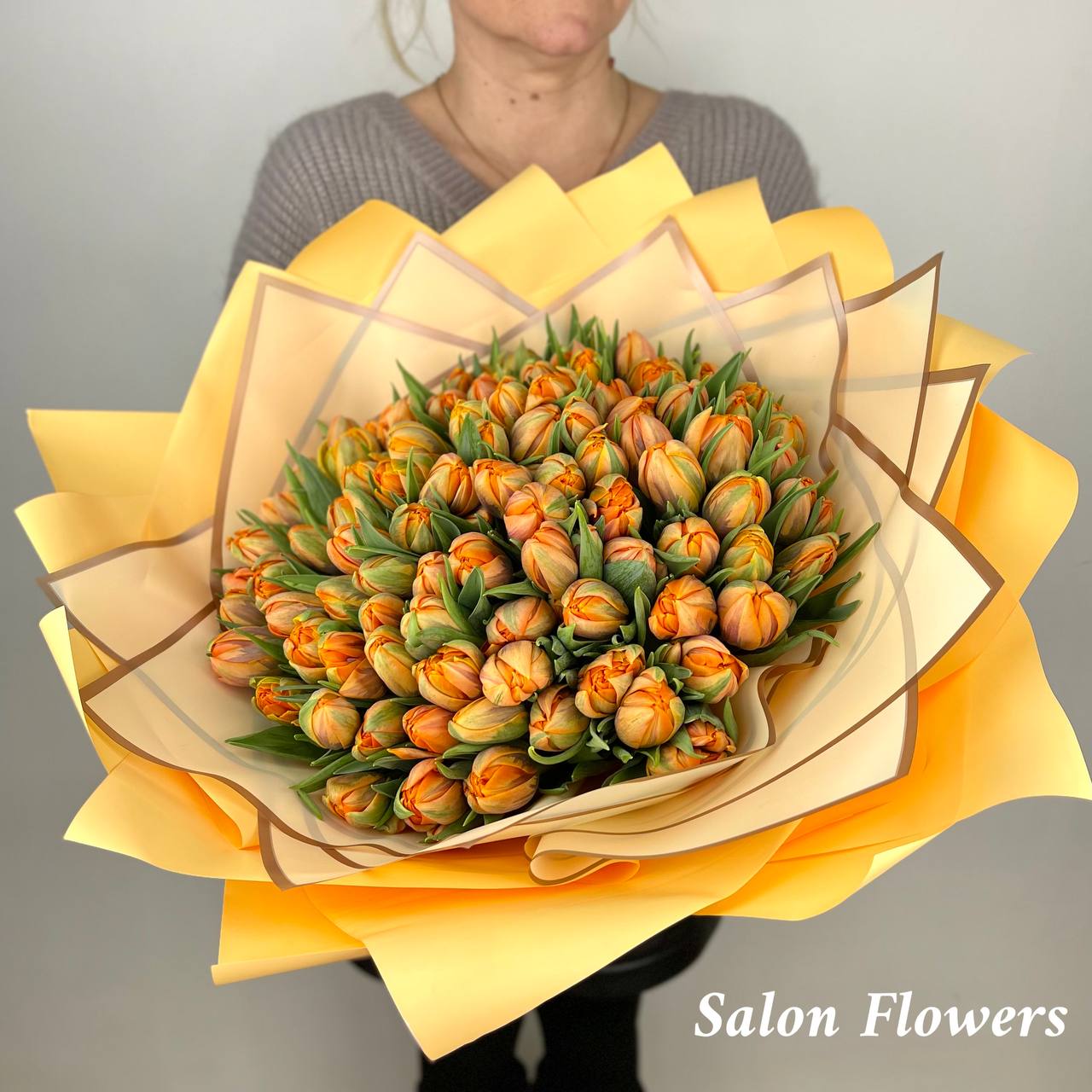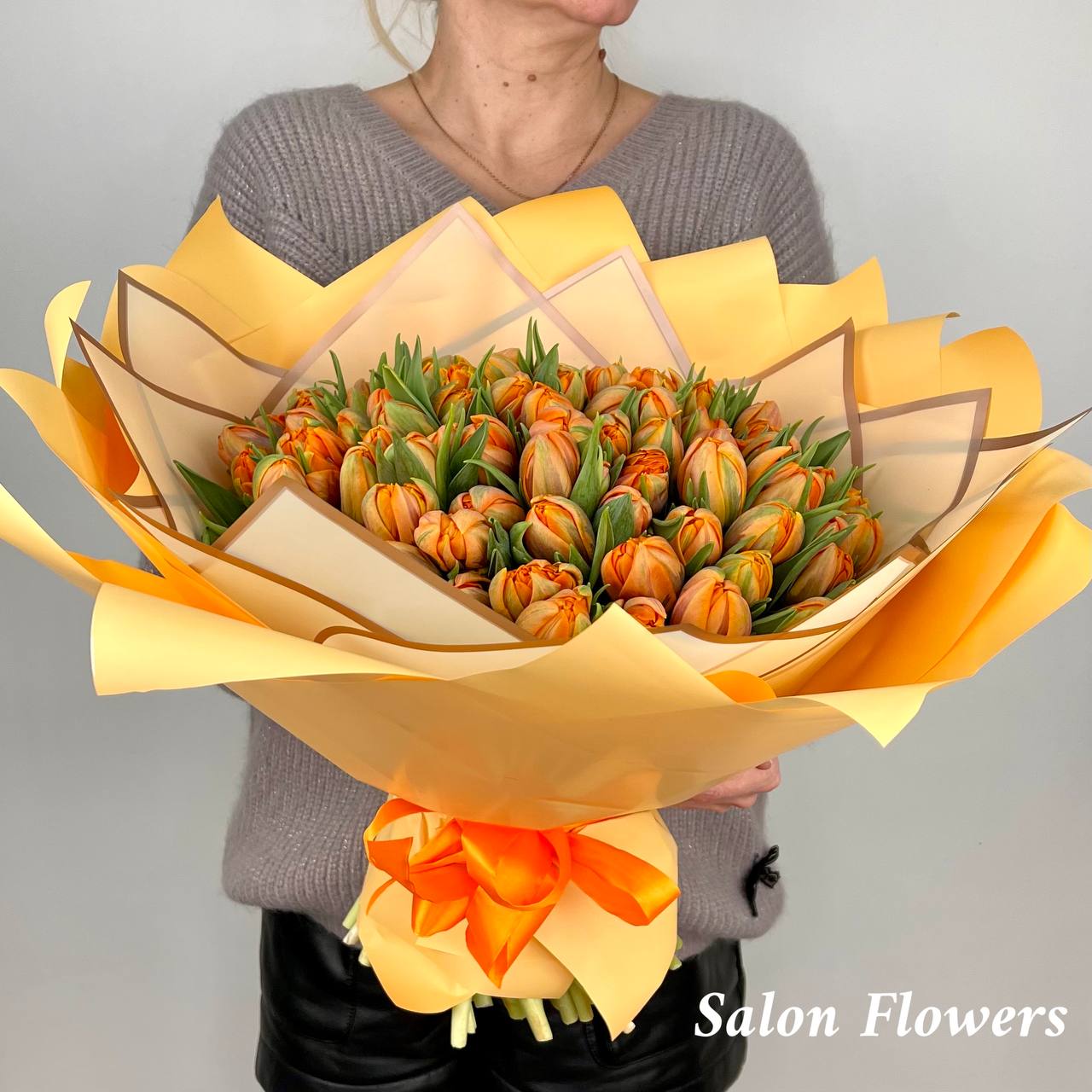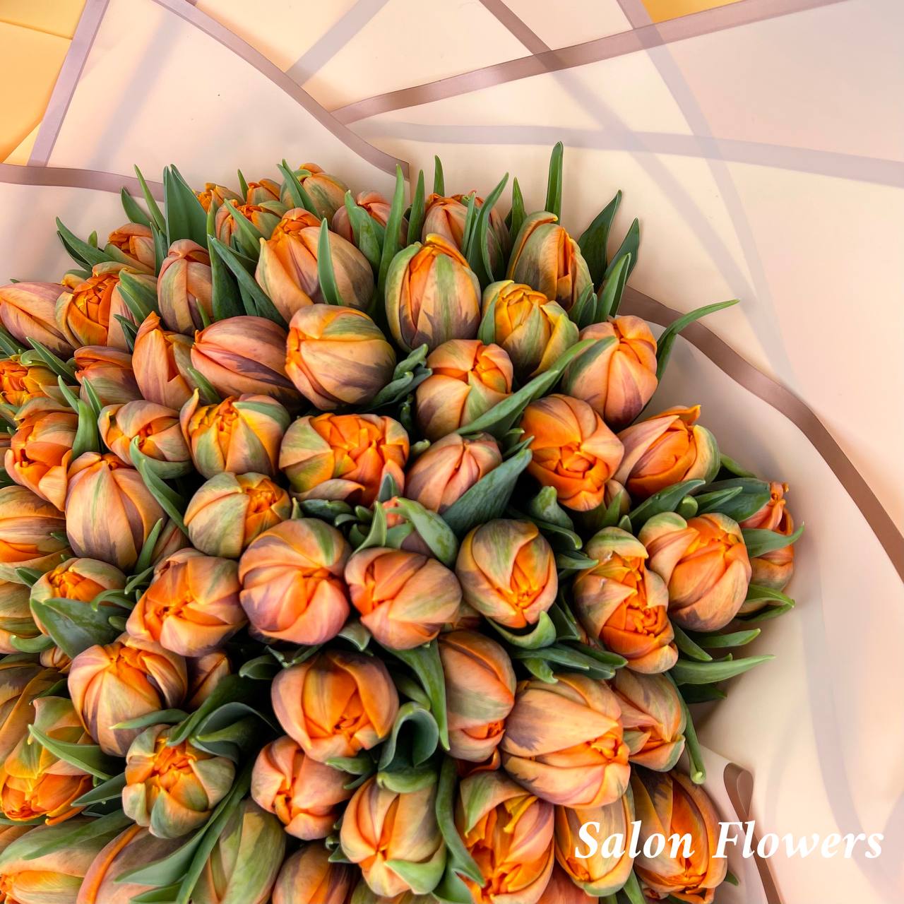 Тюльпан пионовидный — 99 шт., фирменная упаковка, атласная лента.