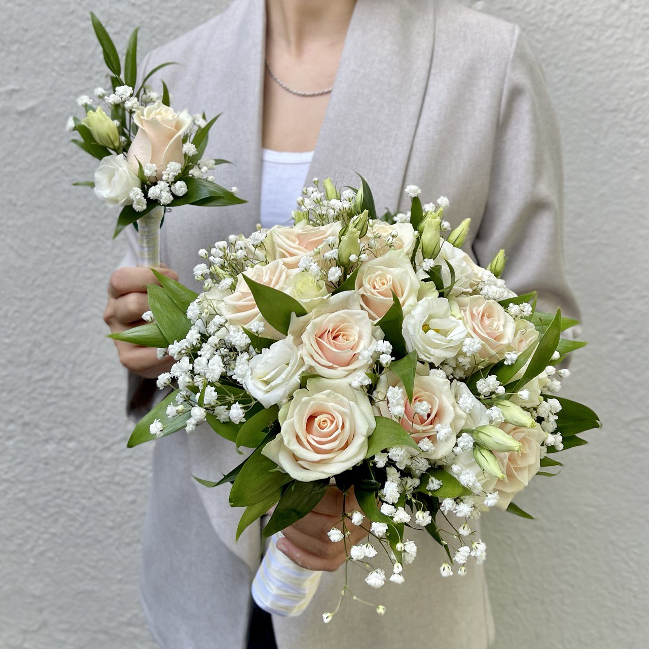 В этом шедевре флористики гармонично слились элегантность и душевная теплота. В центре композиции — 17 роскошных роз сорта «Россия Талея». Их пышные бутоны, будто отлитые из утреннего света, излучают благородство и женственность. Нежные оттенки создают ощущение невесомости и чистоты, окутывая невесту аурой очарования.