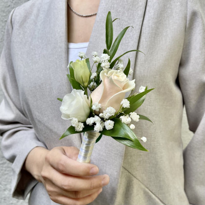 Бутоньерка: роза «Россия Талея» — 1 шт., эустома — 1 шт., гипсофила — 1 шт., рускус, булавка, атласная лента.