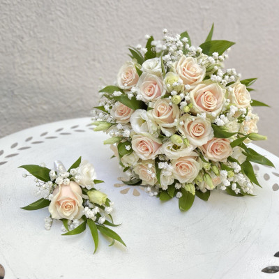 В комплекте с букетом идёт бутоньерка для жениха, повторяющая изысканное сочетание цветов. Она станет идеальным дополнением к образу будущего супруга, создавая единый стилистический ансамбль для пары.