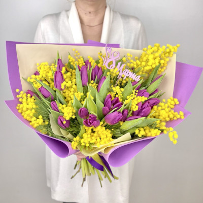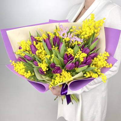 Удивите свою возлюбленную роскошным букетом "Яркий март" с нежной мимозой из Италии и яркими тюльпанами! Этот букет - идеальный способ выразить свои чувства и подарить весеннее настроение в Международный женский день.