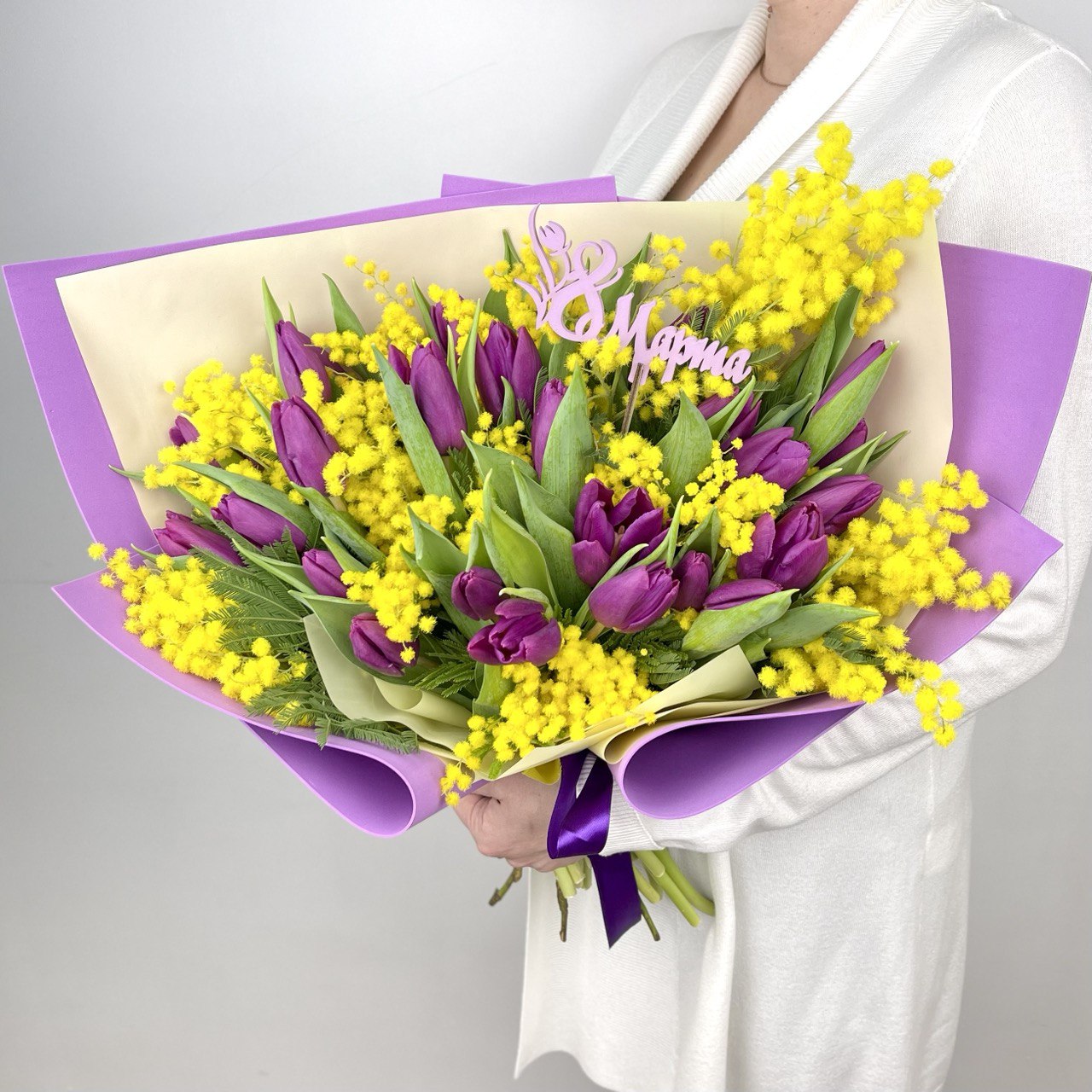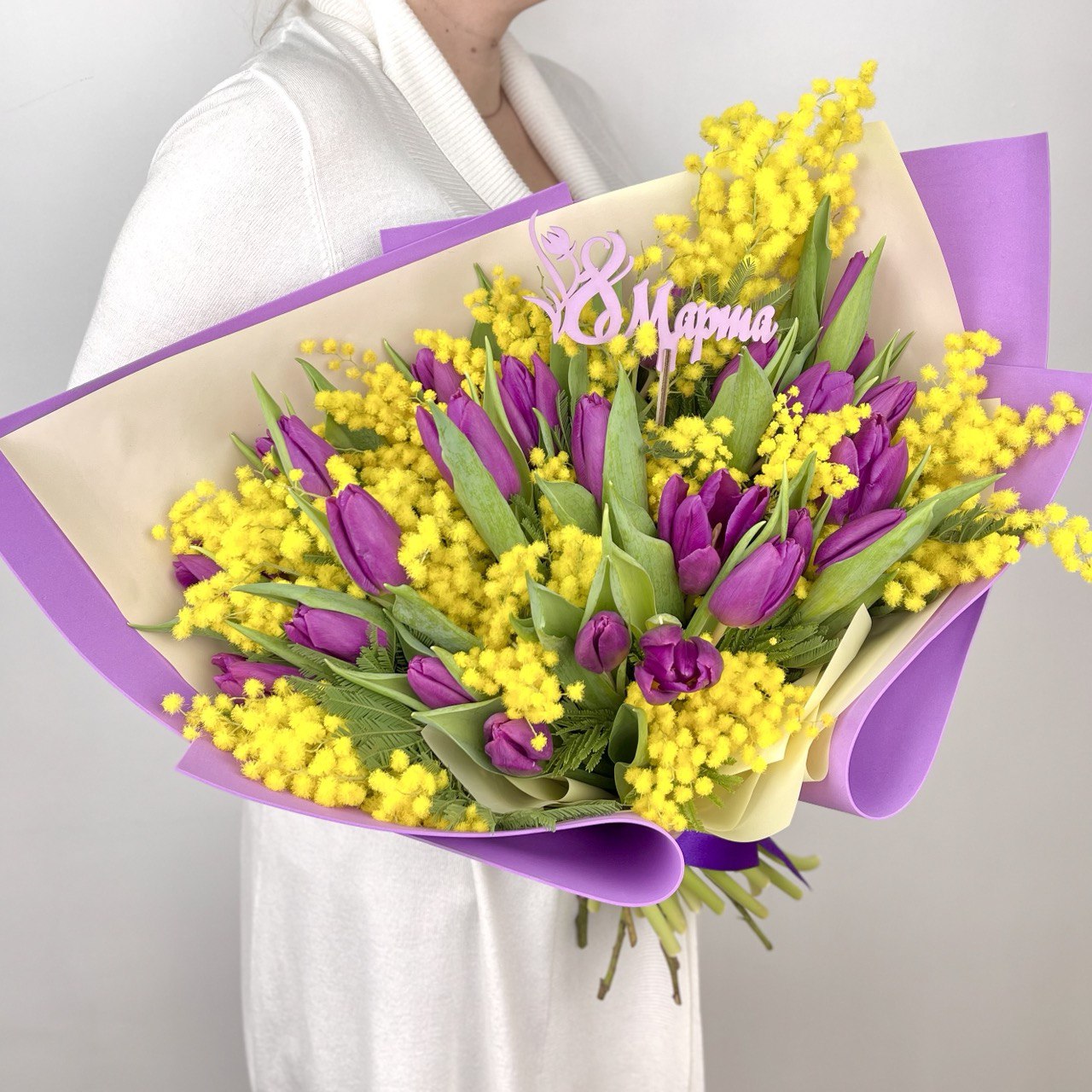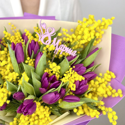 Тюльпан — 25 шт., мимоза — 1 шт., топпер «8 Марта», фирменная упаковка, атласная лента.
