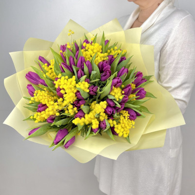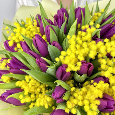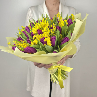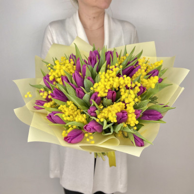 Тюльпан — 49 шт., мимоза «Италия» — 0,5 банча, фирменная упаковка, атласная лента.
