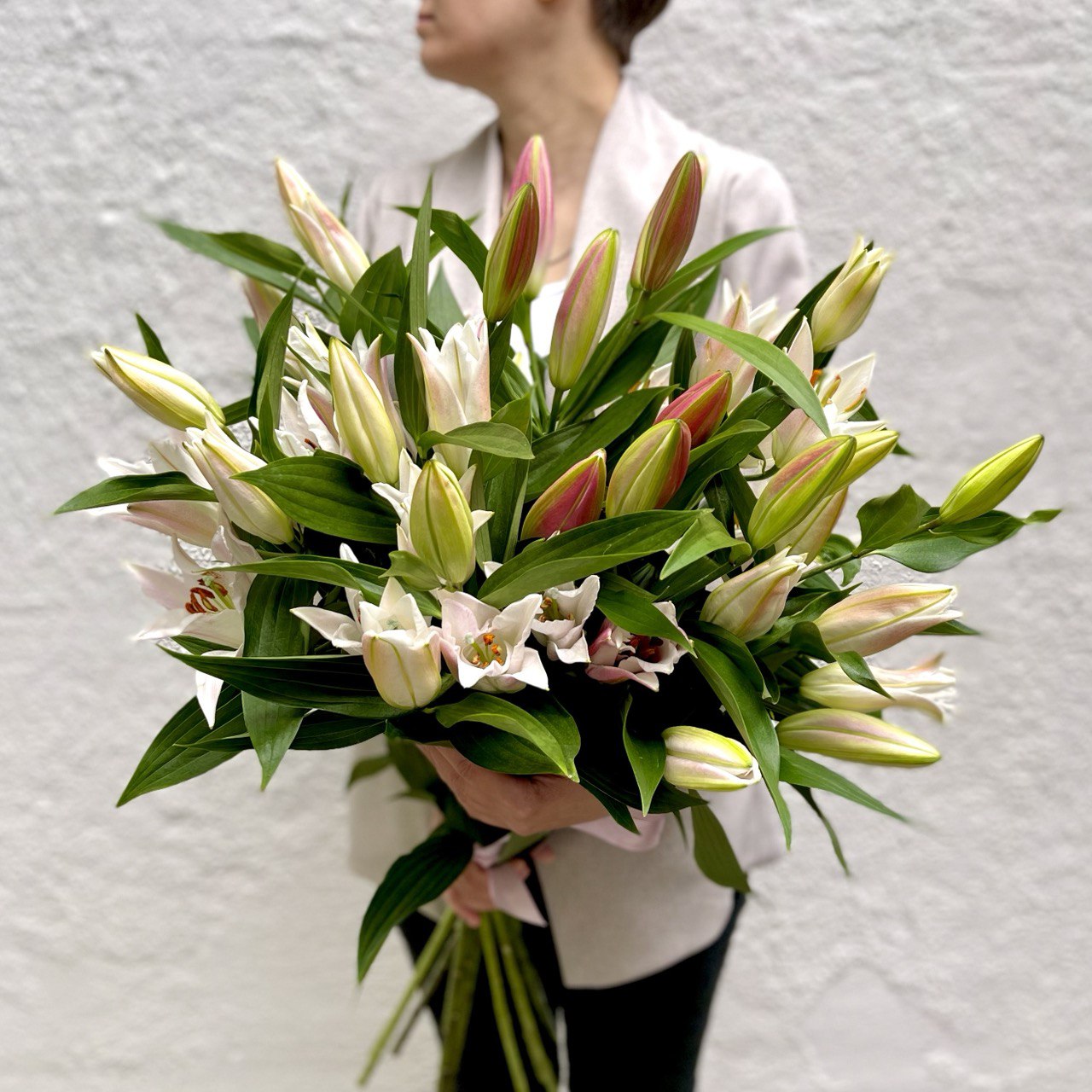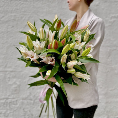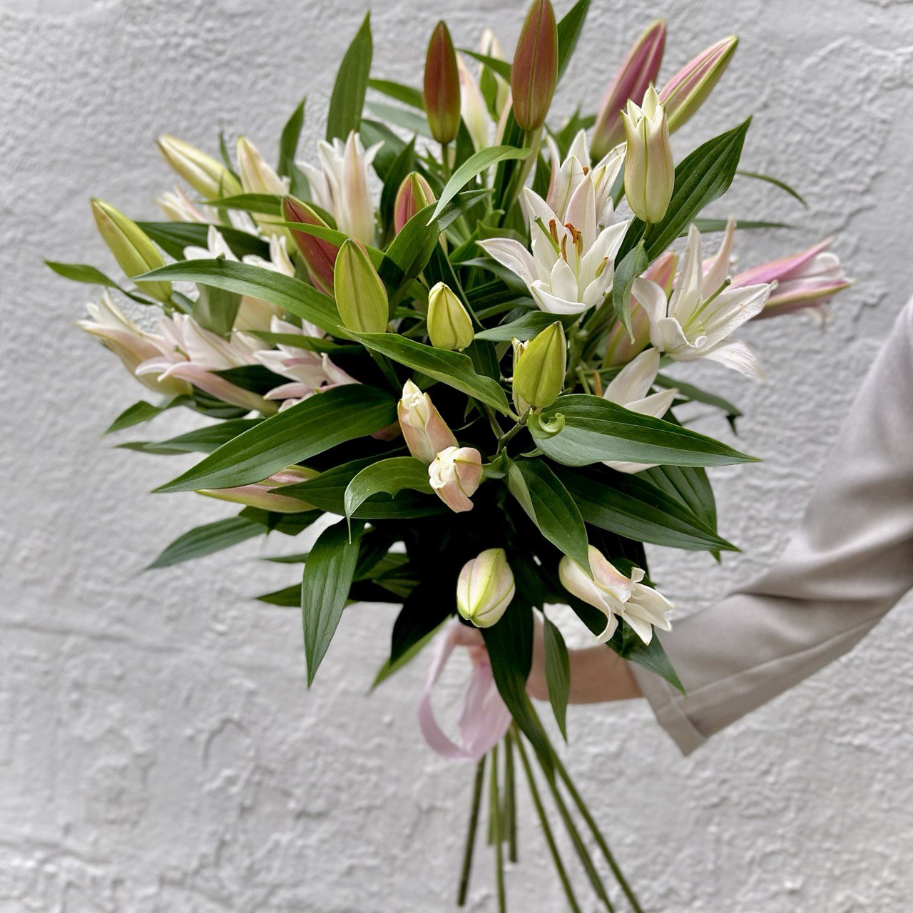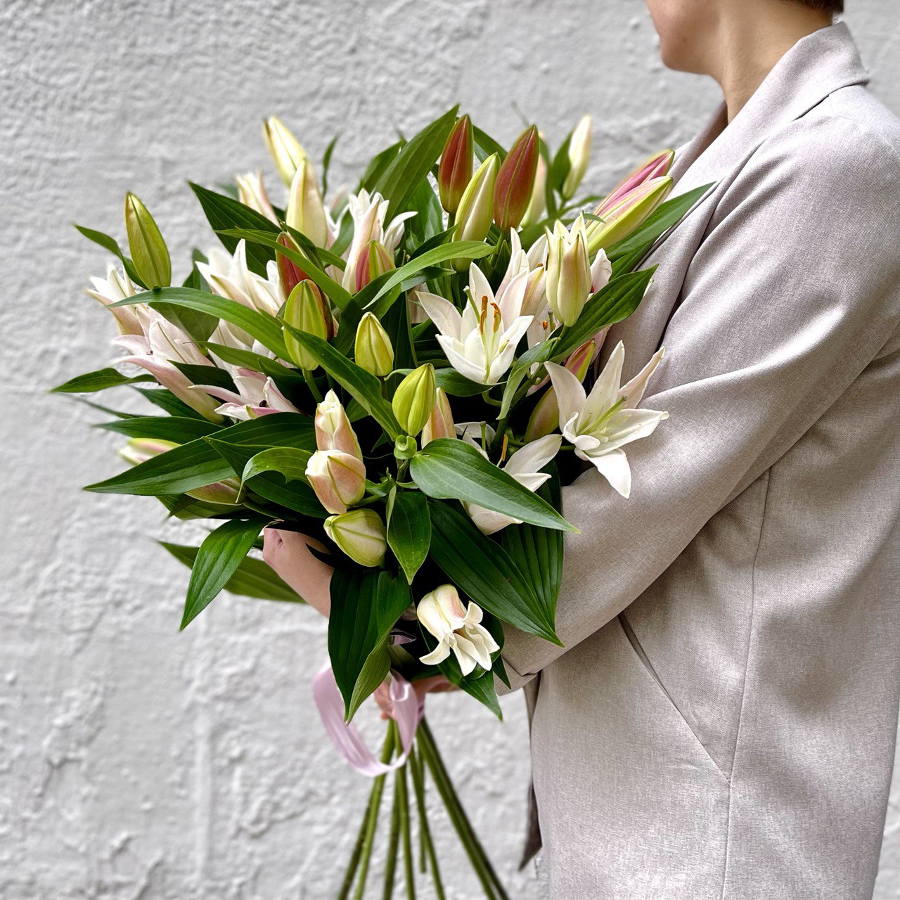 Каждый цветок в этом букете — как произведение искусства. Пышные, но изящные соцветия будто застыли в нежном танце, а их розовый оттенок переливается от едва заметного перламутра до сочной, но деликатной гаммы. Благородная простота лилий дополнена элегантной атласной лентой, которая обвивает стебли, придавая композиции завершённость и праздничный шик.