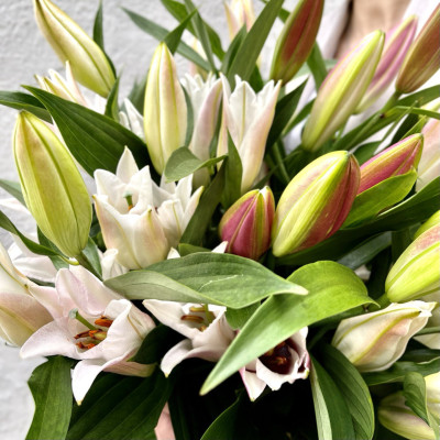 Тонкий, изысканный аромат лилий наполняет пространство теплом и романтикой, словно тихий шёпот искренних чувств. Высота букета в 60 см и ширина в 45 см создают эффект объёмной, величественной композиции — но при этом она не выглядит громоздкой, а, напротив, кажется лёгкой, почти воздушной.