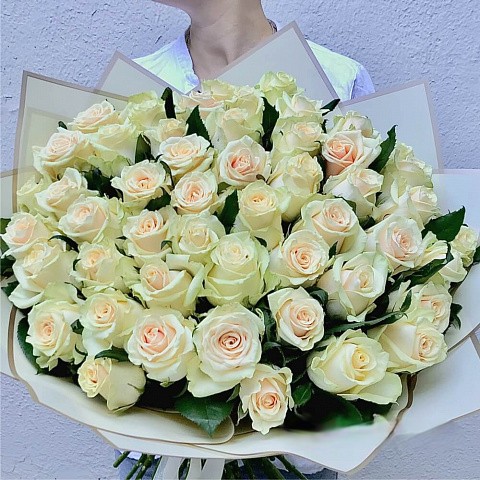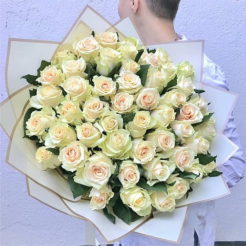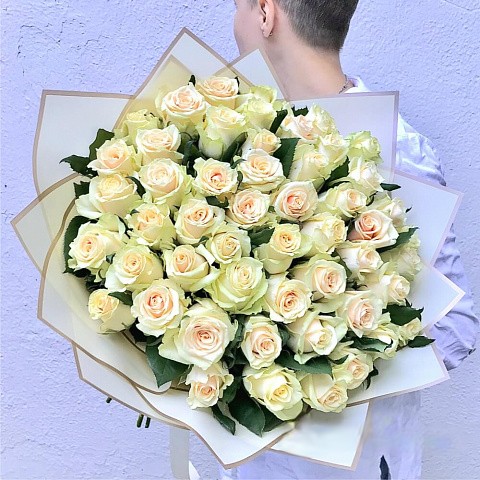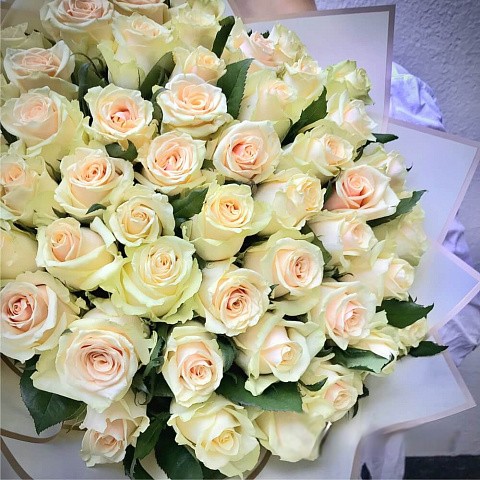 Нежно-кремовый оттенок роз, напоминающий цвет айвори, окутывает букет аурой благородства и утончённости. Пышные, безупречно сформированные бутоны, обрамлённые сочной тёмно-зелёной листвой, выглядят как произведение искусного флориста. Их изысканная форма и сладкий, свежий аромат наполняют пространство атмосферой уюта и безмятежного счастья.