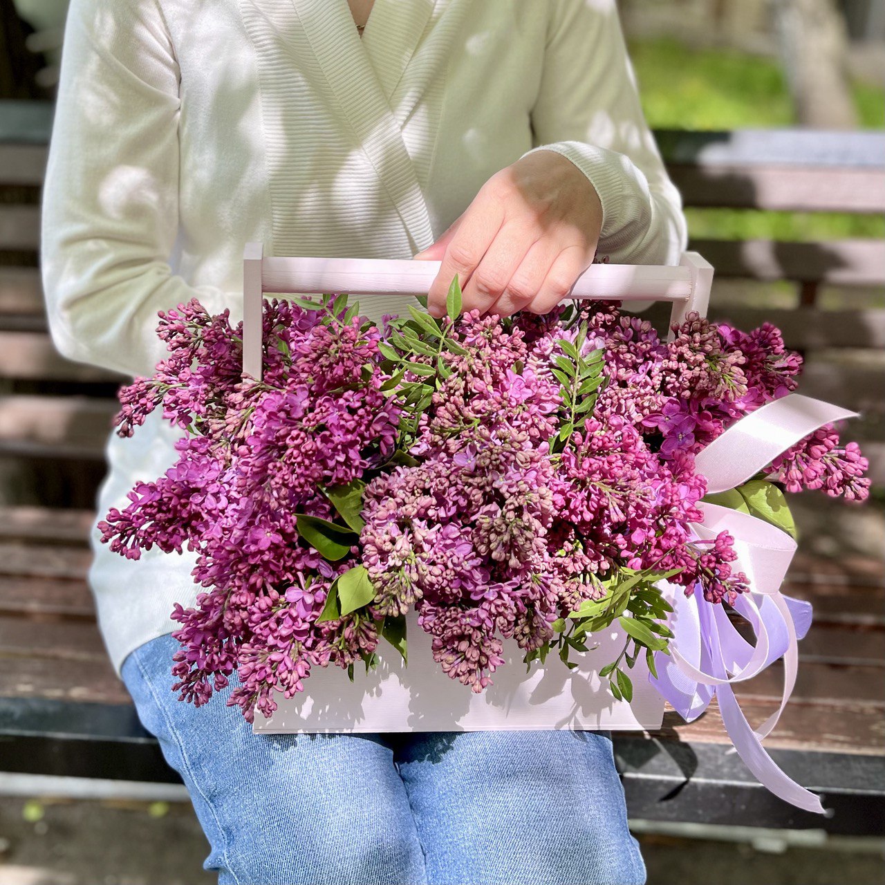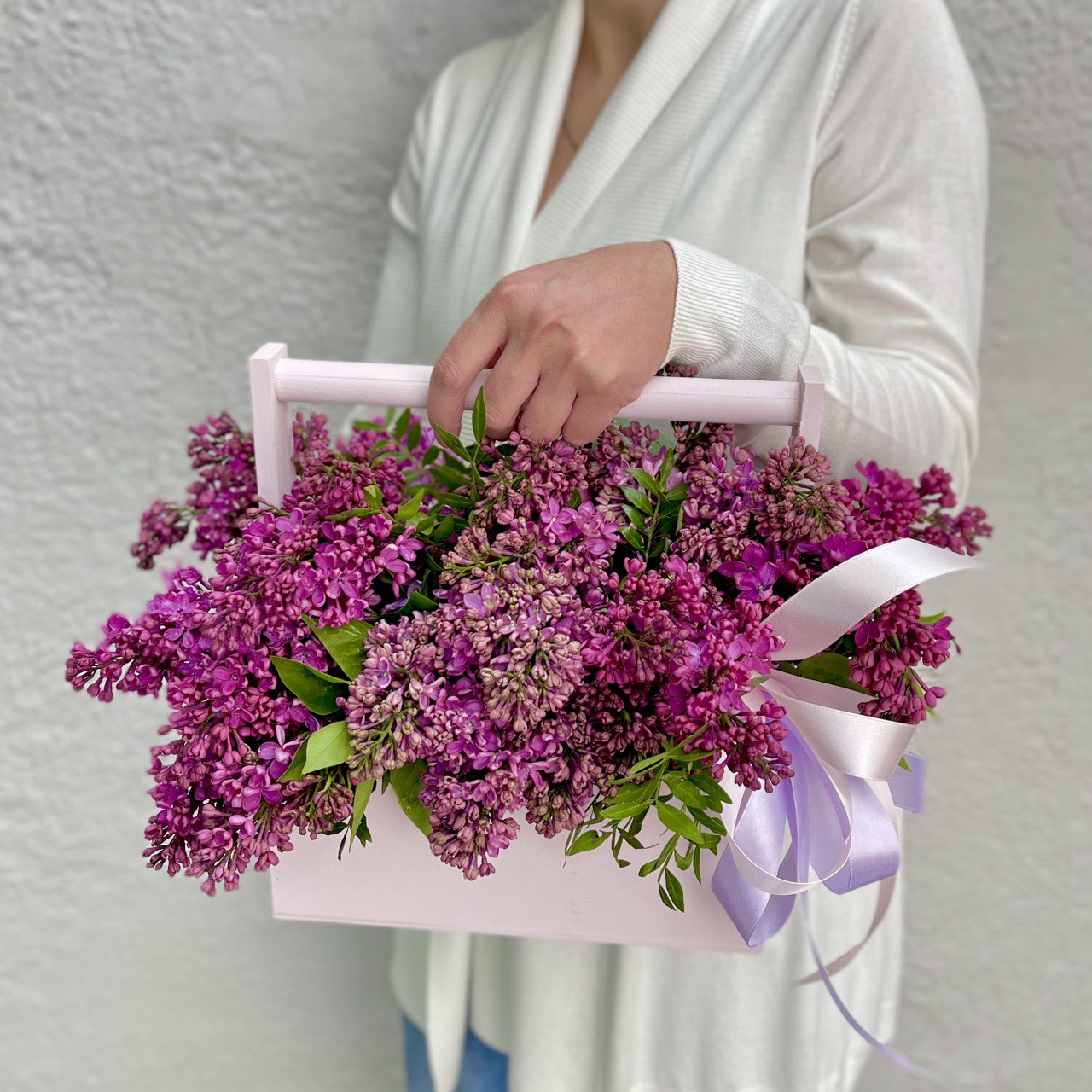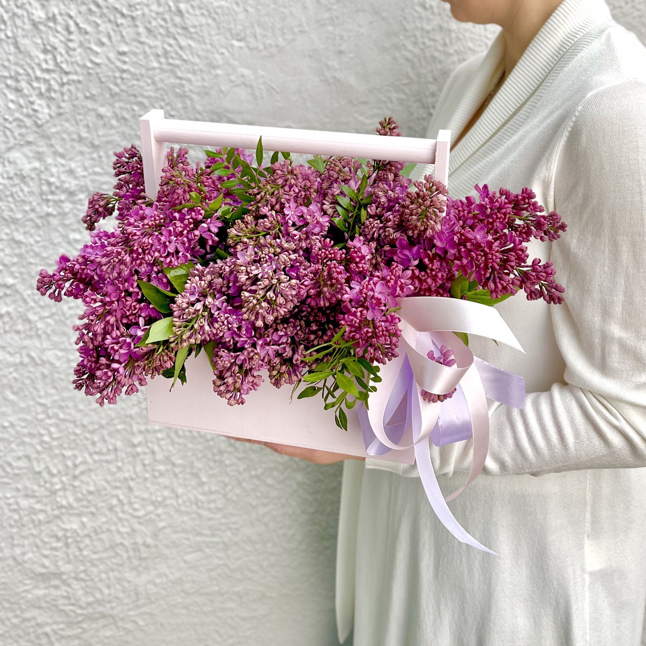 Сирень — 1 пучок, ящик 24х27 см, флористическая губка, атласная лента.