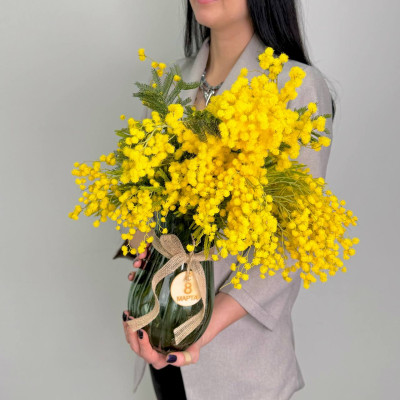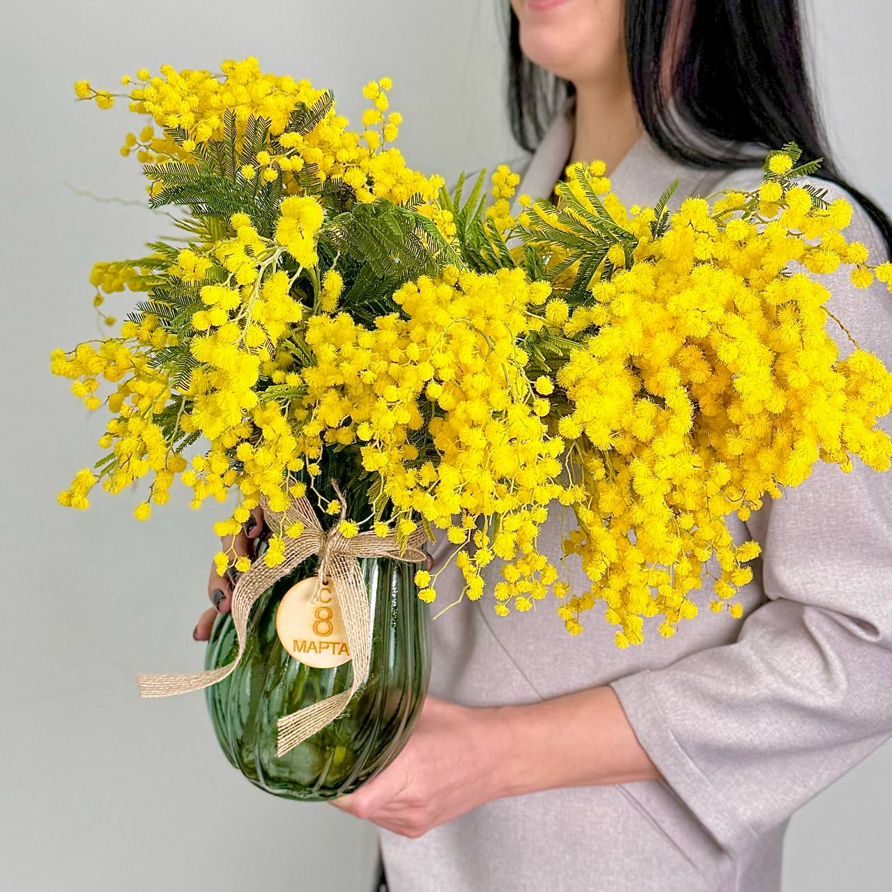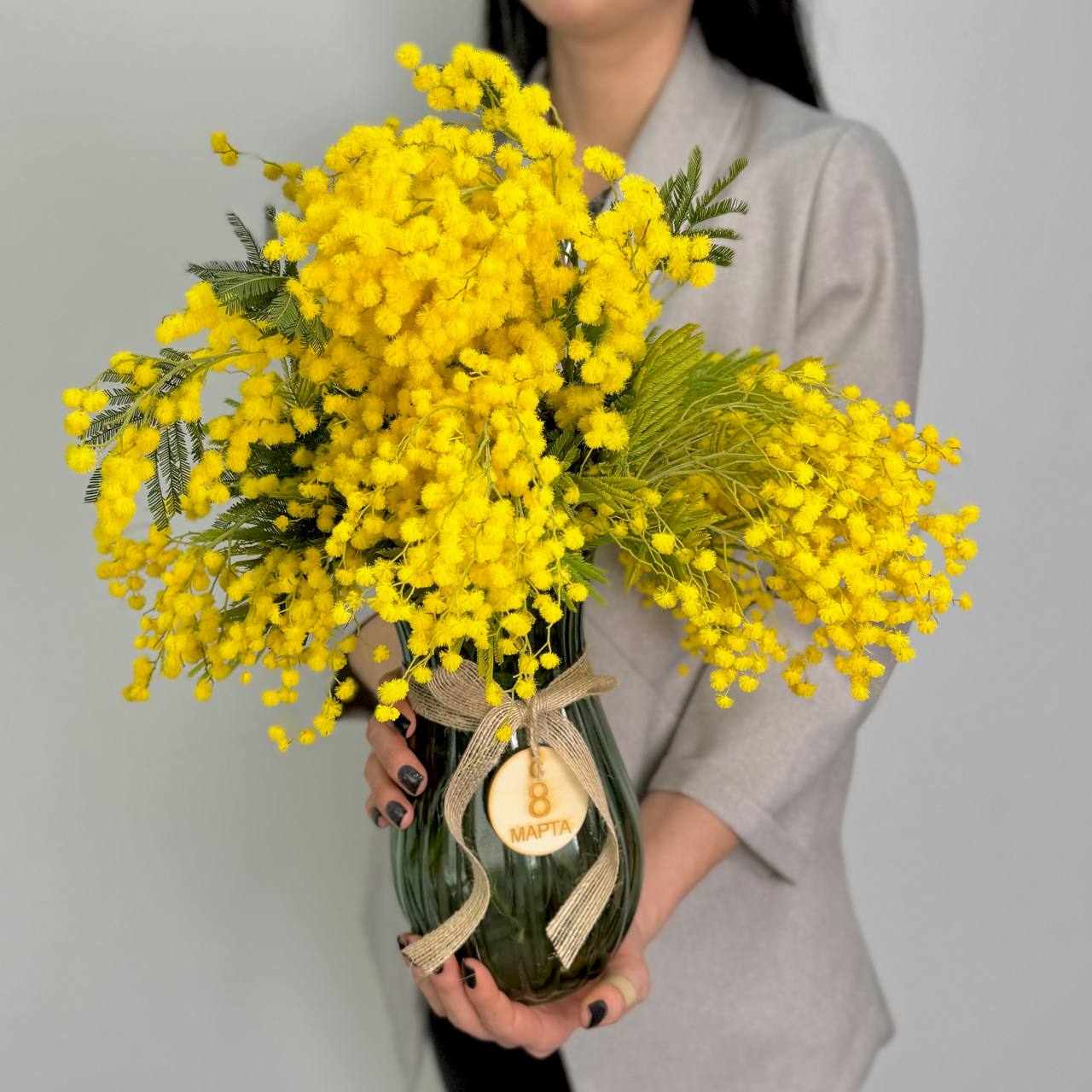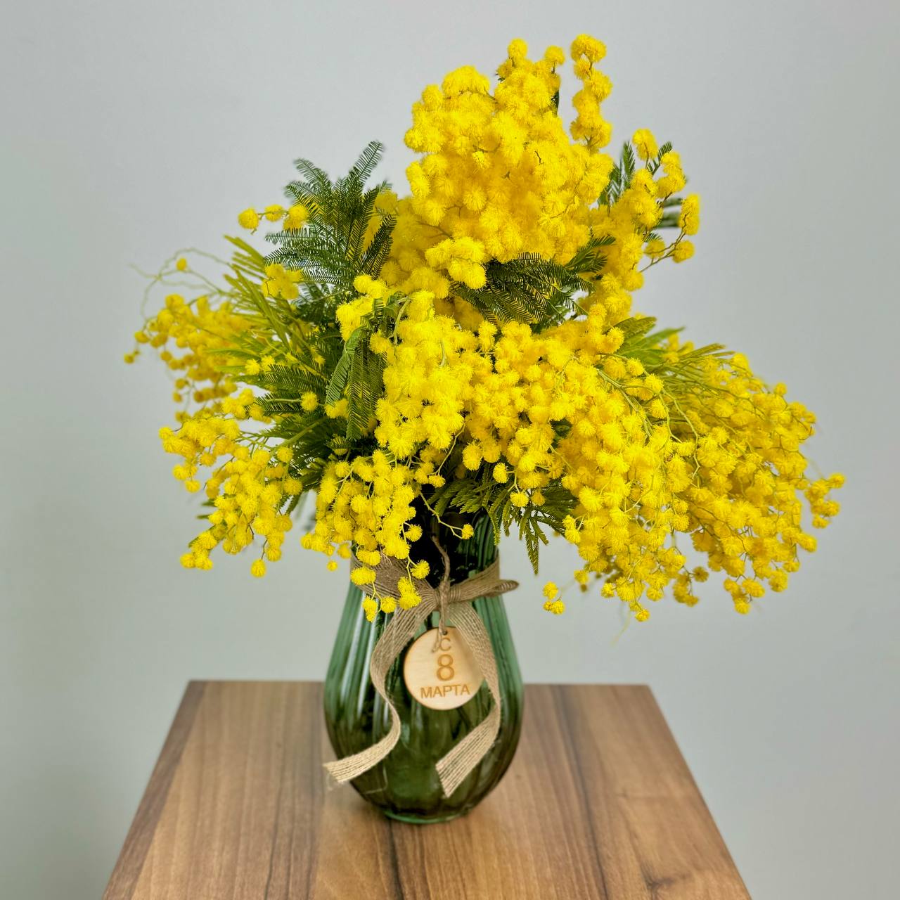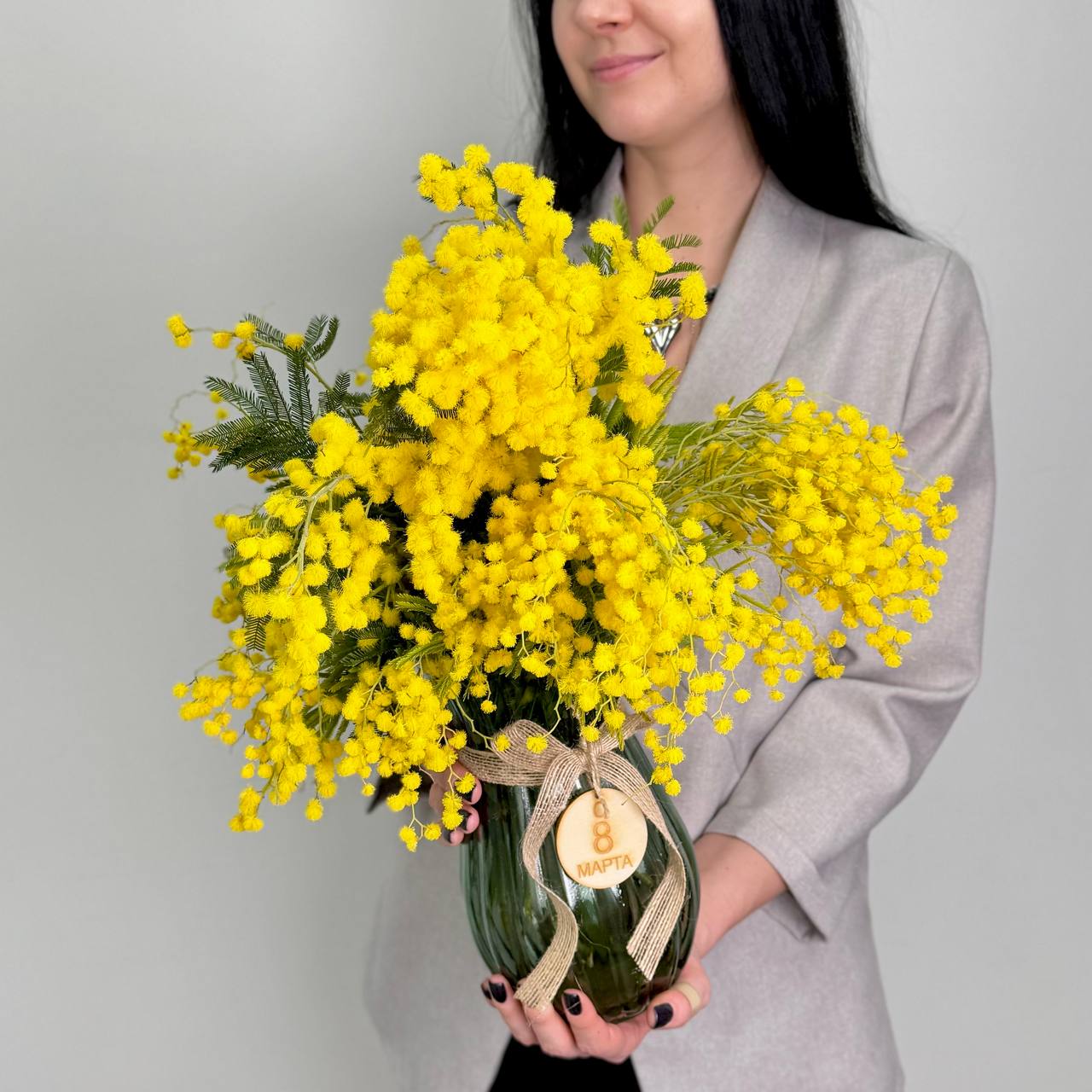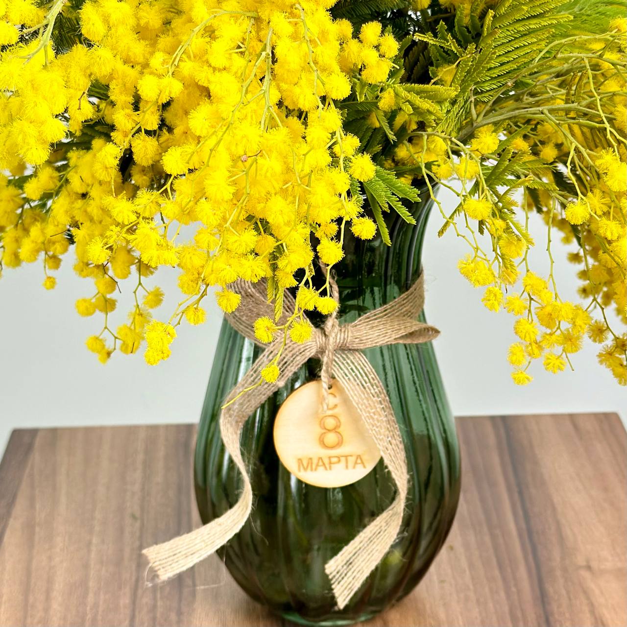 Мимоза итальянская — 1 банч., ваза (11 х 22 см) — 1 шт., шильдик «8 марта».
