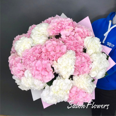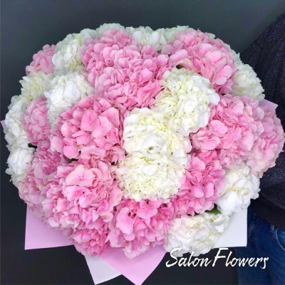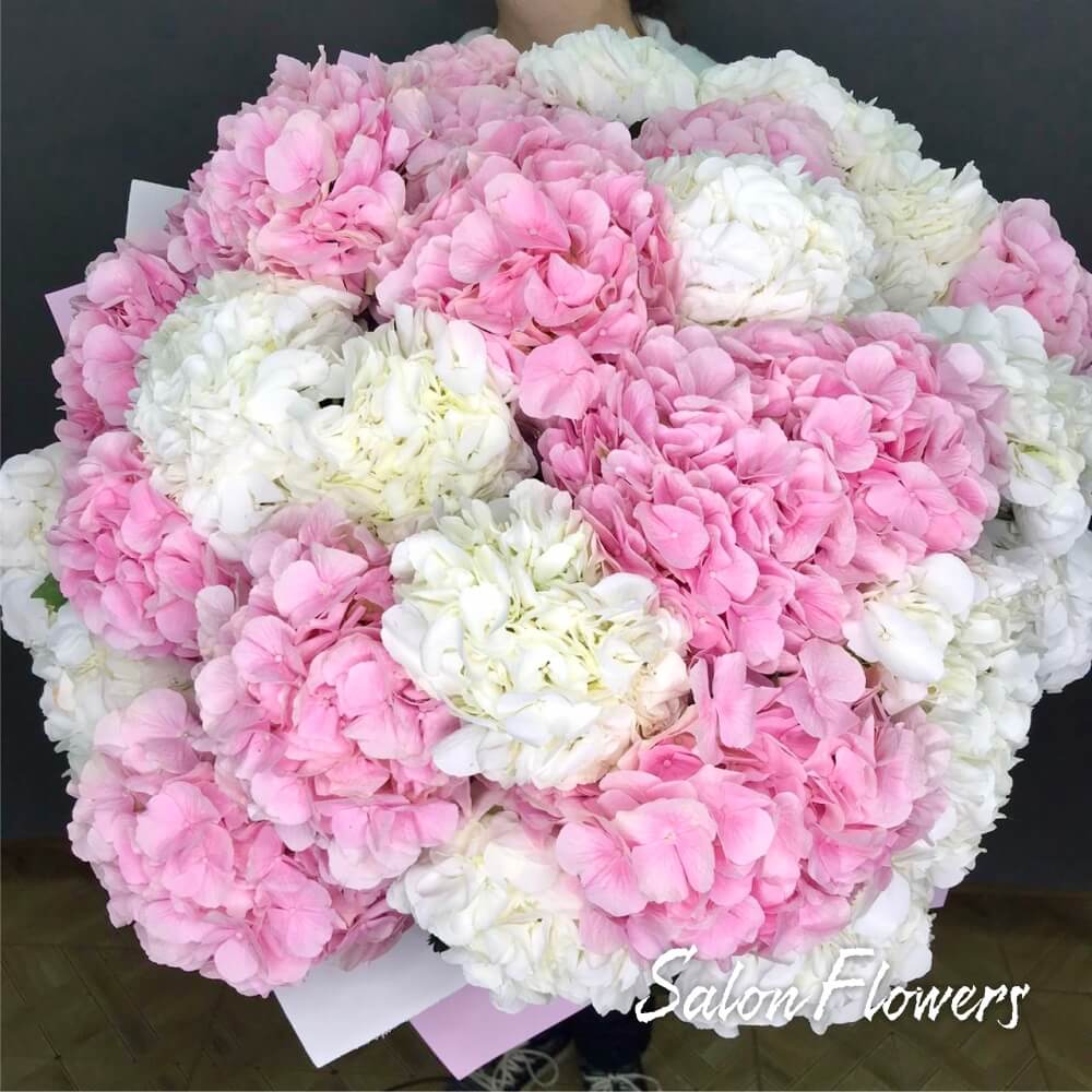 Гортензия розовая — 15 шт., гортензия белая — 14 шт., фирменная упаковка, атласная лента.