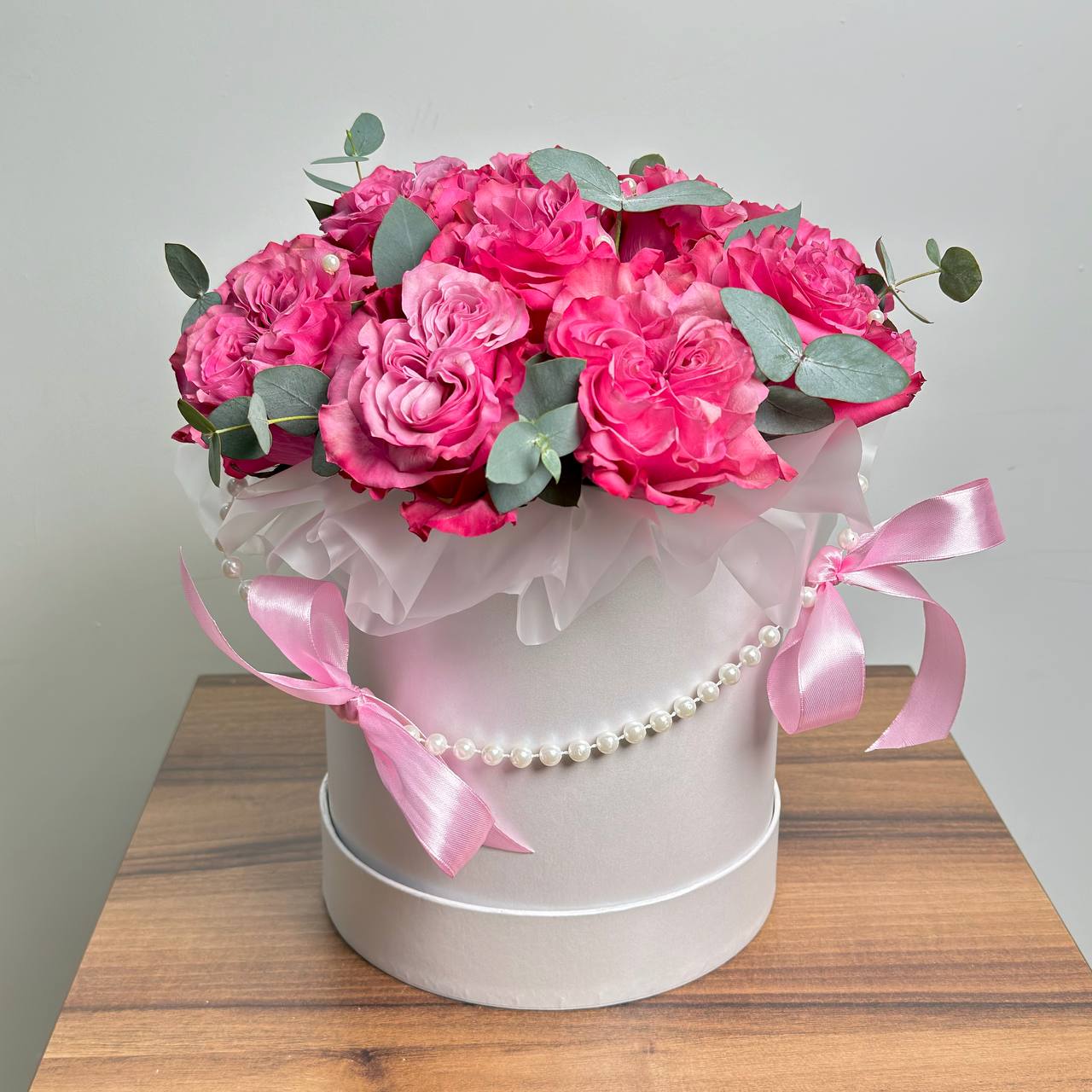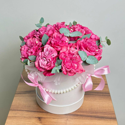 Цветы в шляпной коробке "Розовая жемчужина" (15 роз)