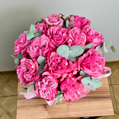 Роза пионовидная «Эквадор Кантри Блюз» — 15 шт., эвкалипт, шляпная коробка 18х20 см, флористическая губка, декор-бусы, атласная лента.