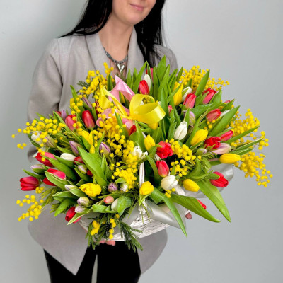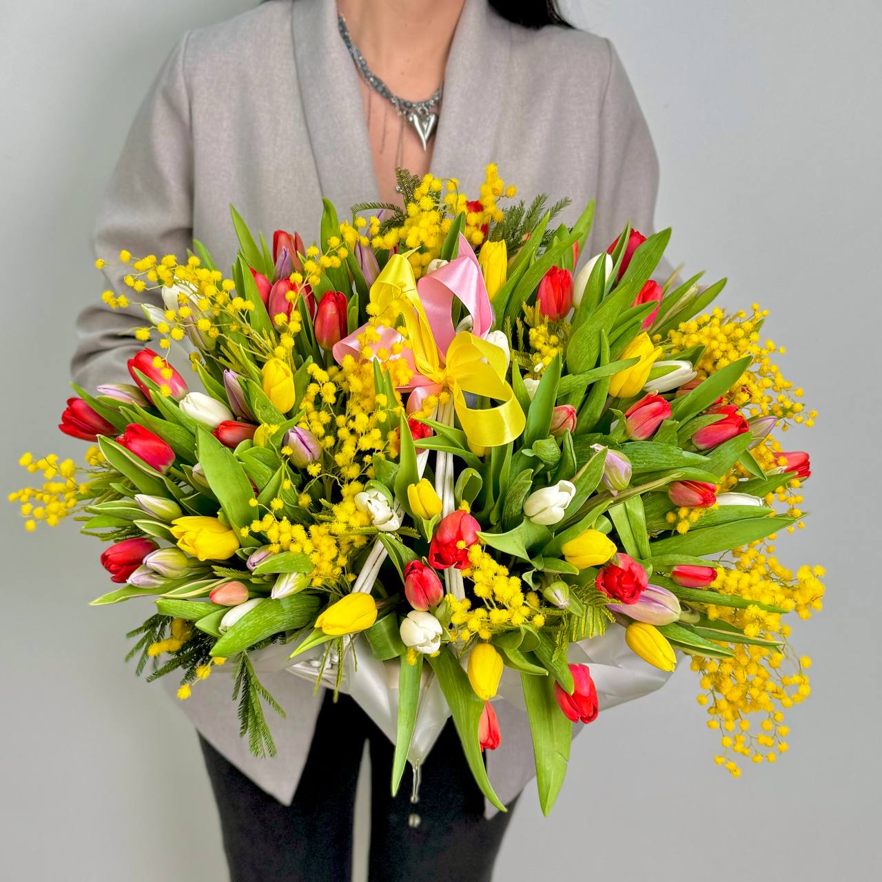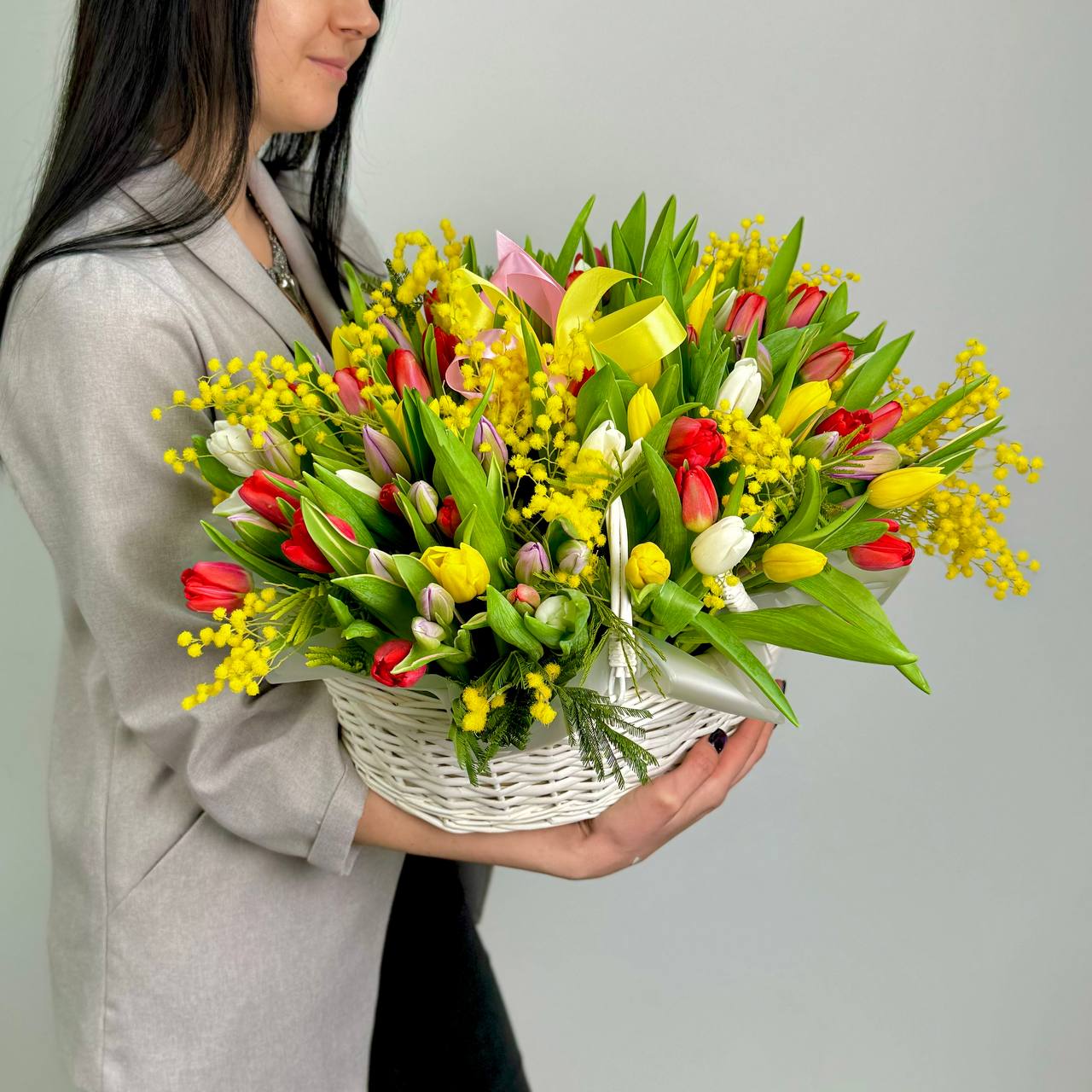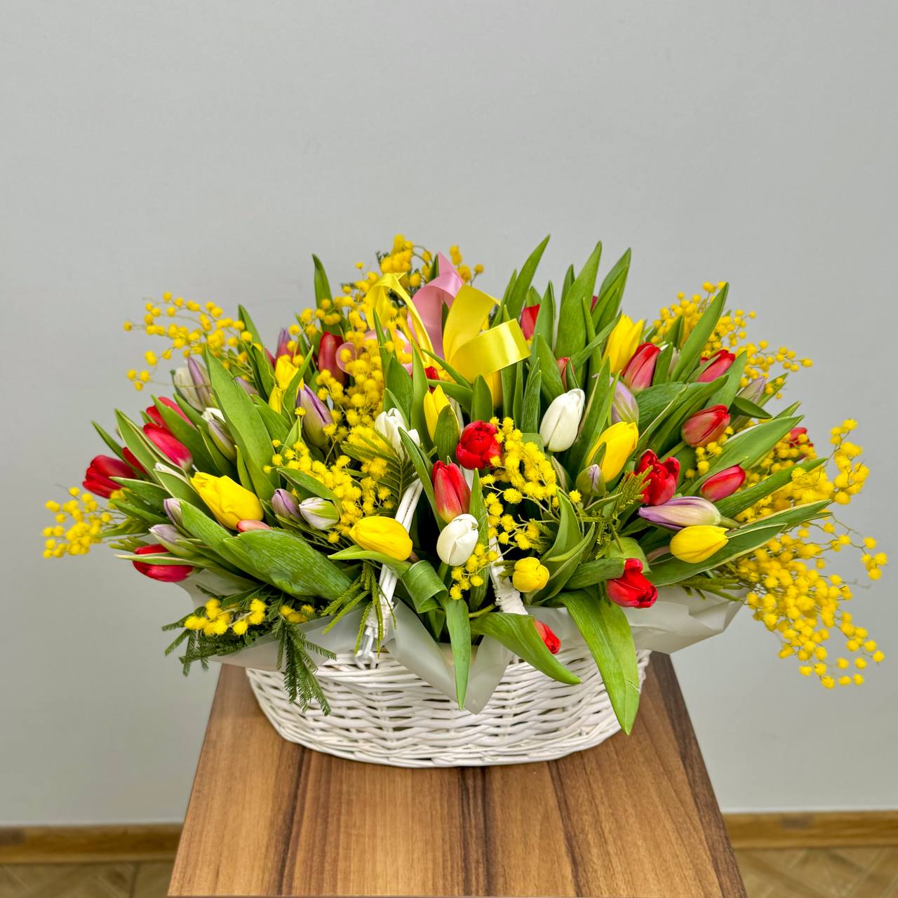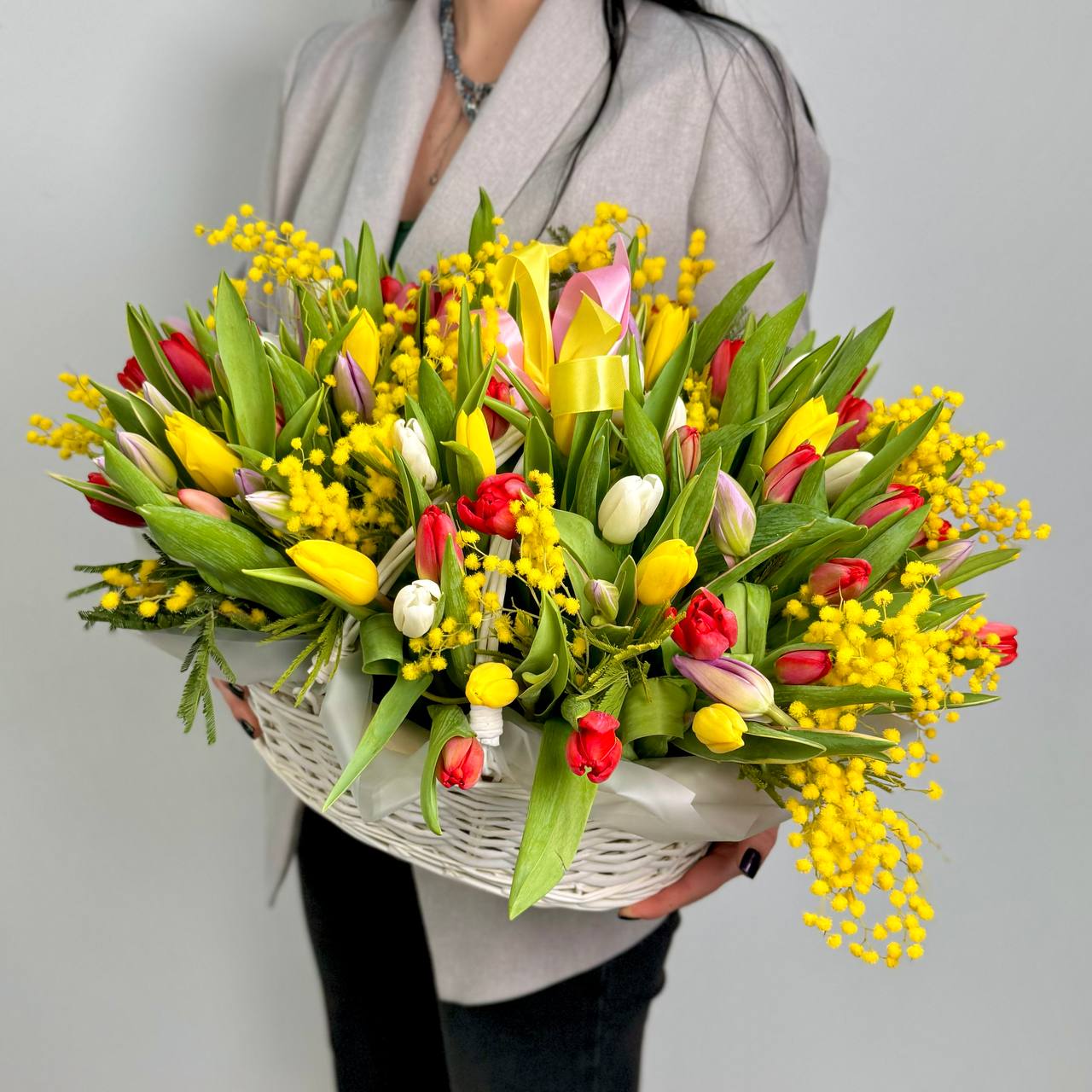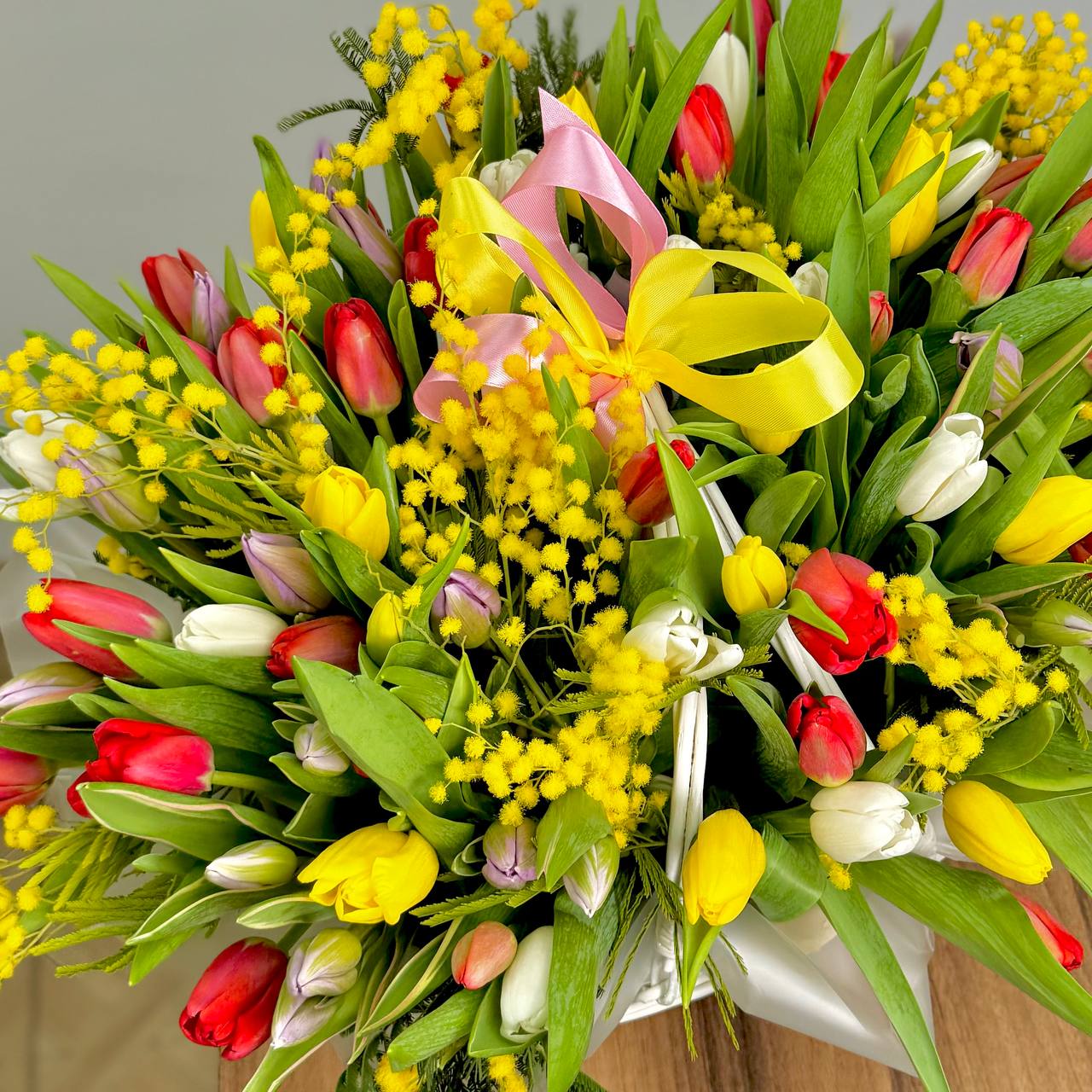 Тюльпан микс — 75 шт., мимоза итальянская — 4 ветки, корзина, флористическая губка, юбочка, атласная лента.