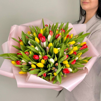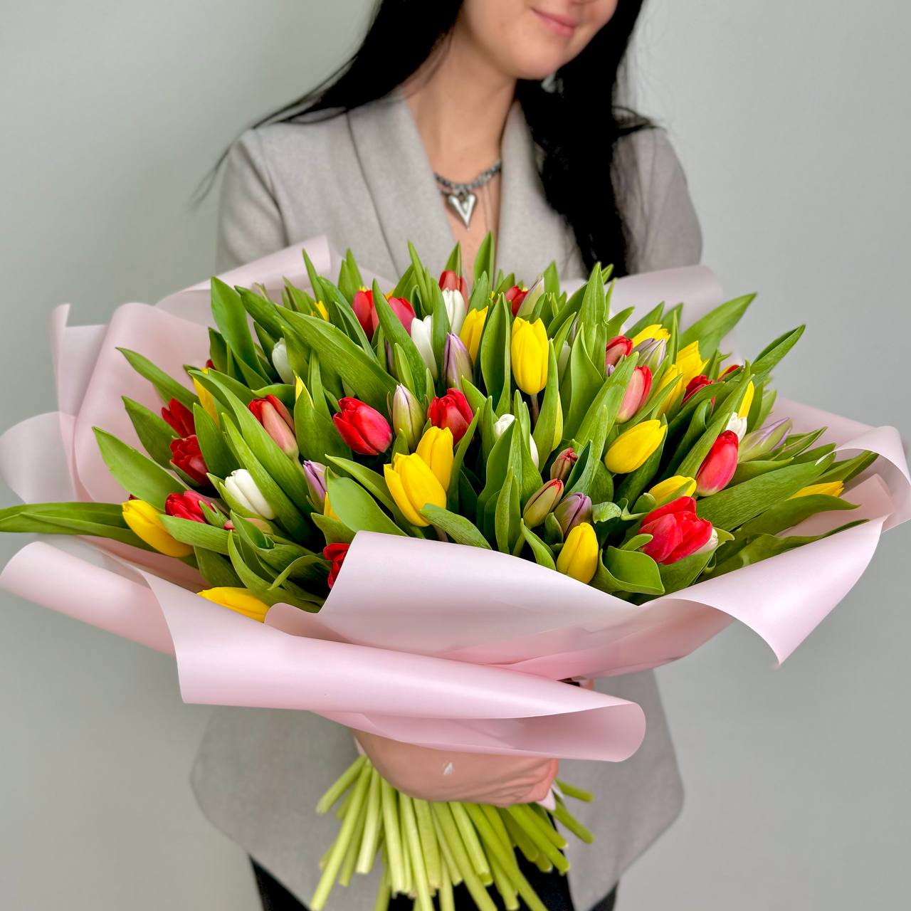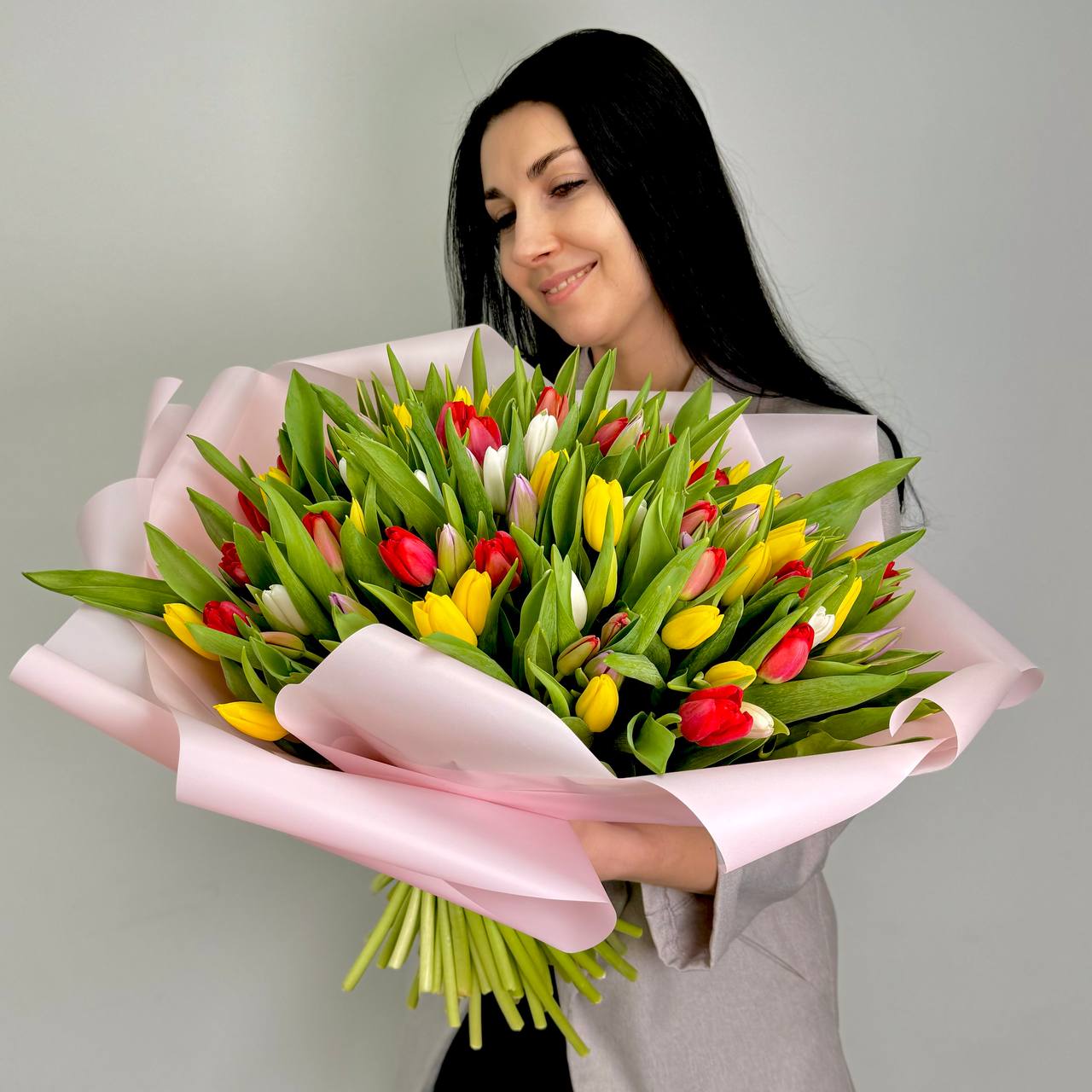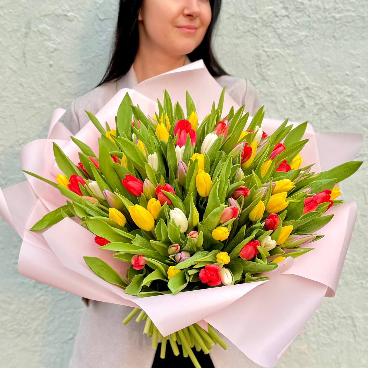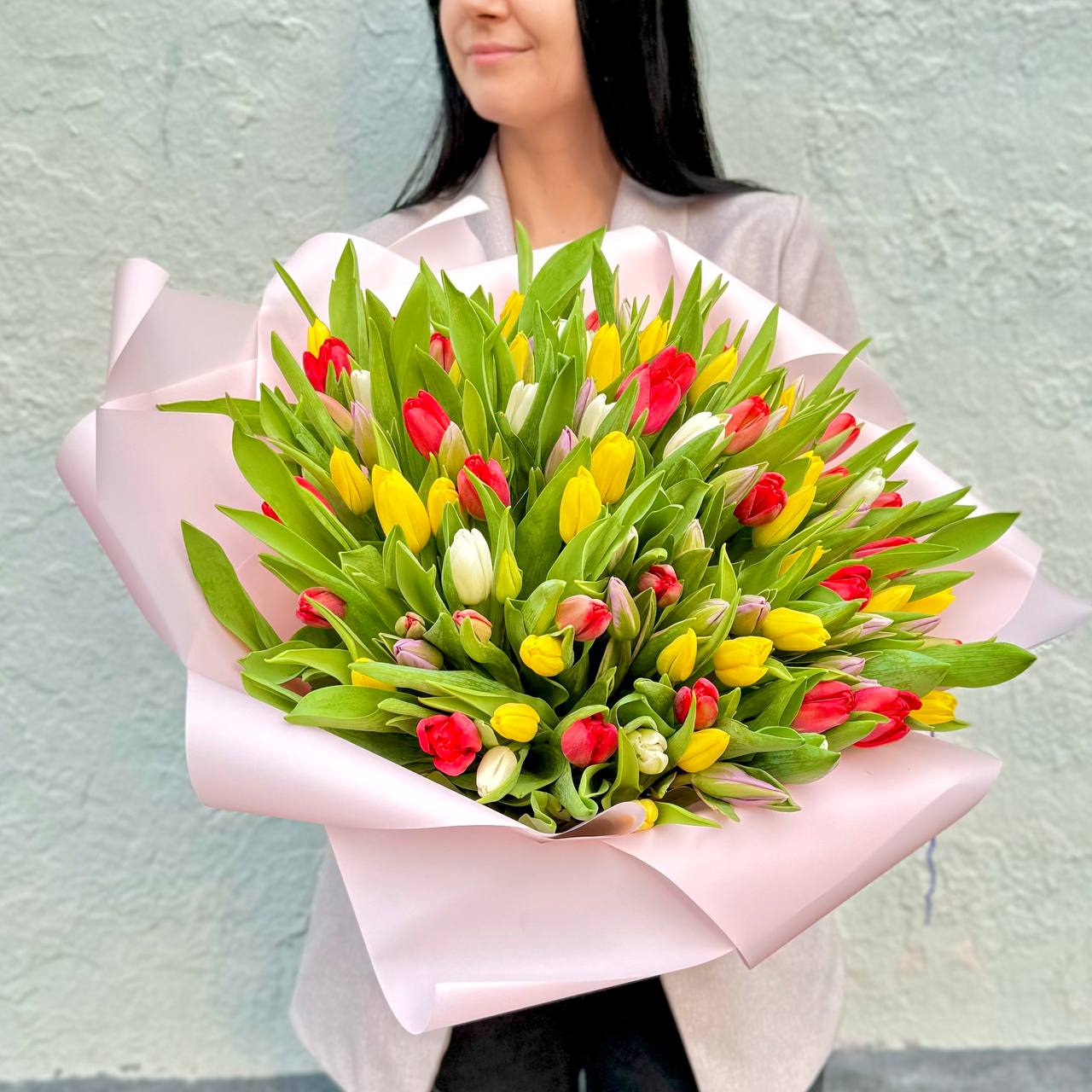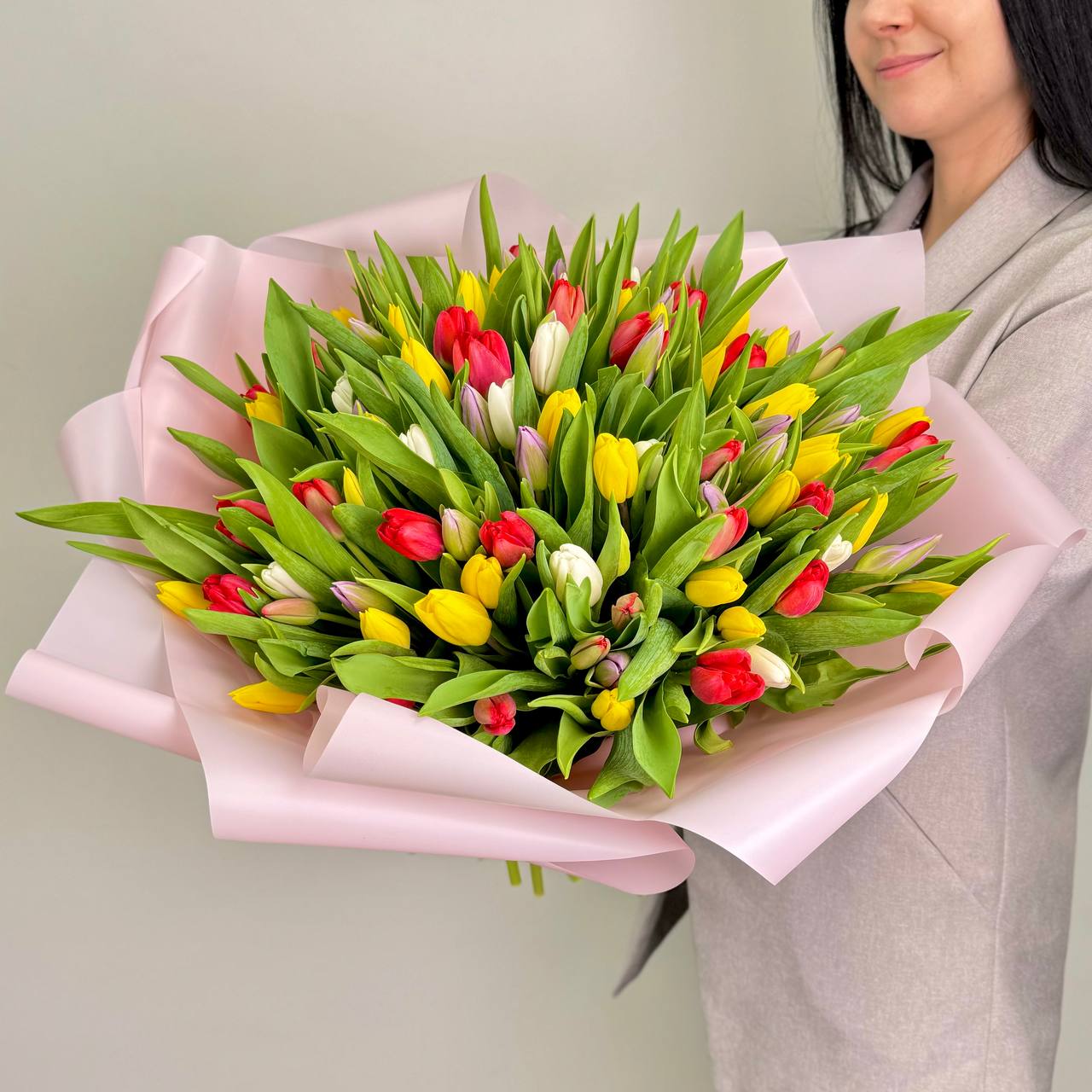 Тюльпан микс — 101 шт., фирменная упаковка, атласная лента.