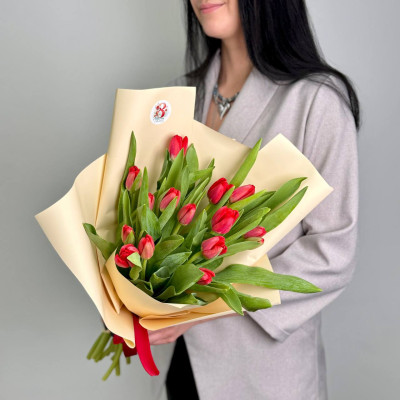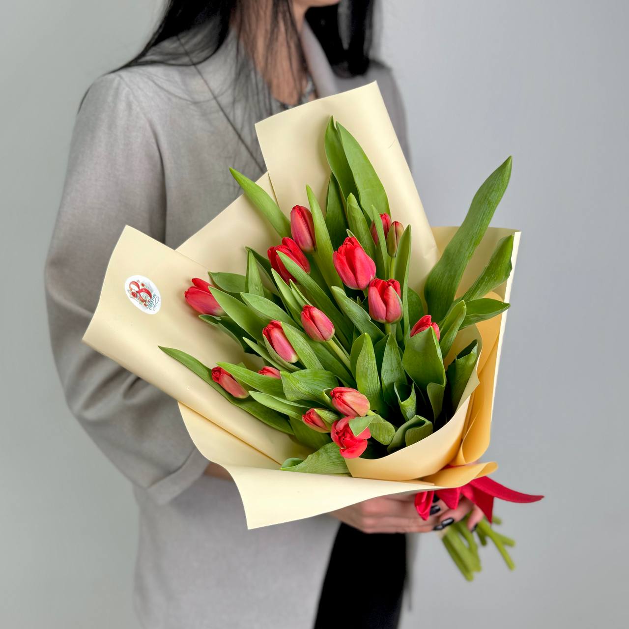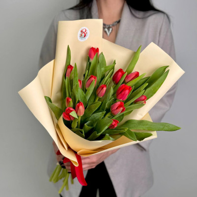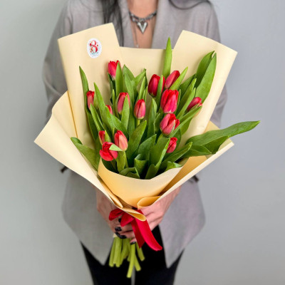 Тюльпан красный — 15 шт., фирменная упаковка, атласная лента.