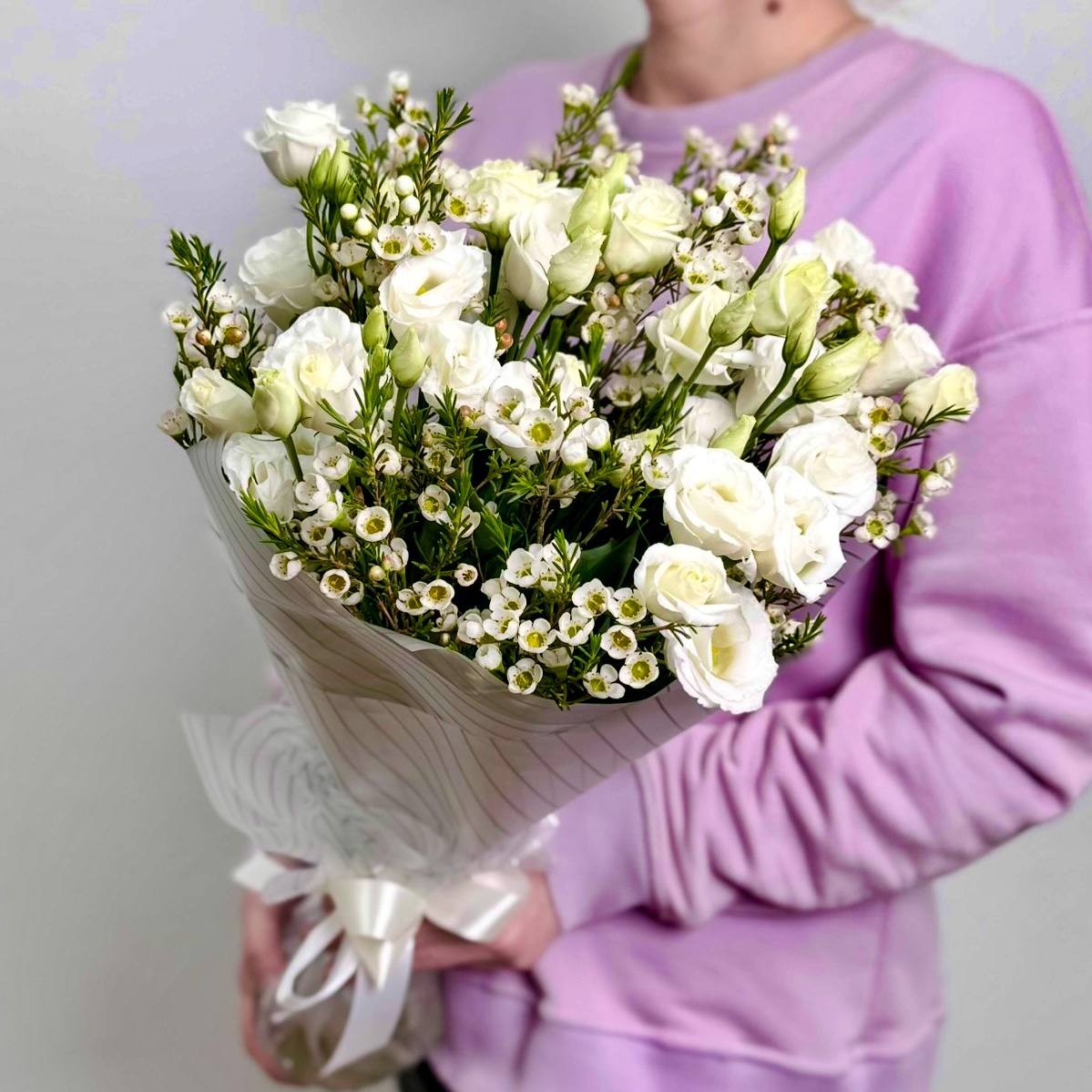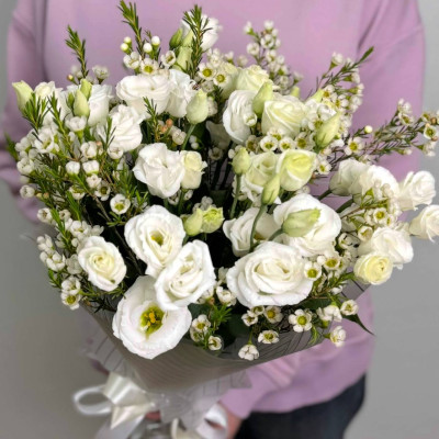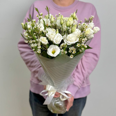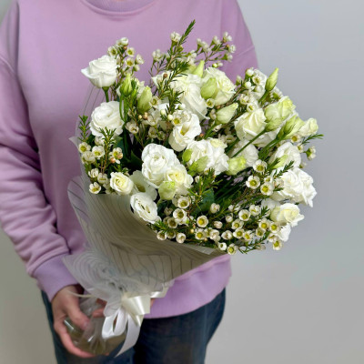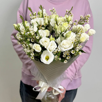 Хамелациум, с его изящными веточками и мелкими белыми цветами, создаёт воздушный, романтичный фон для эустомы. Его нежные соцветия добавляют композиции объём и лёгкость, словно окутывая букет вуалью нежности.
