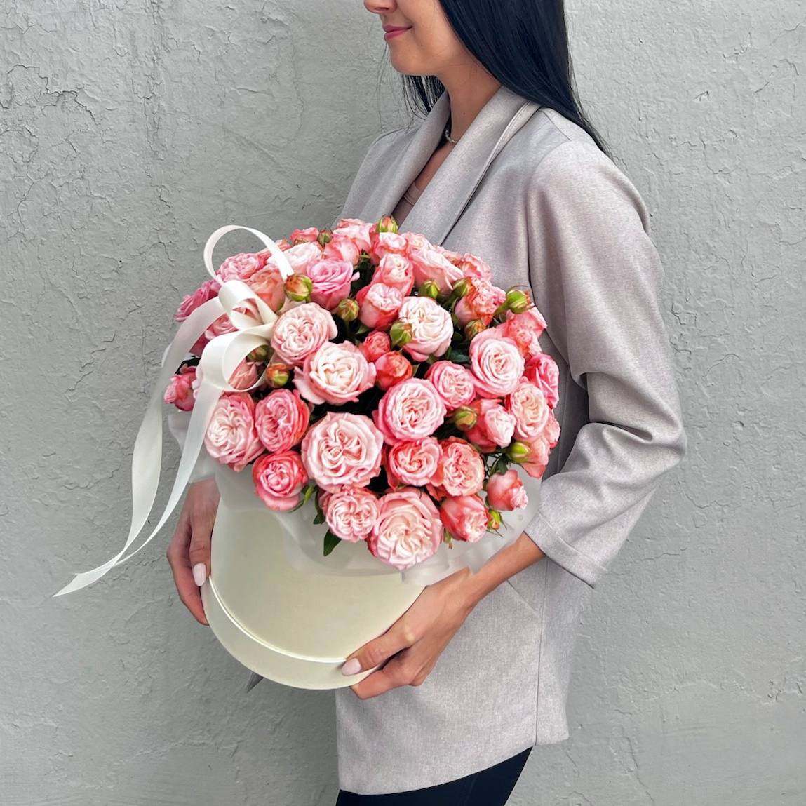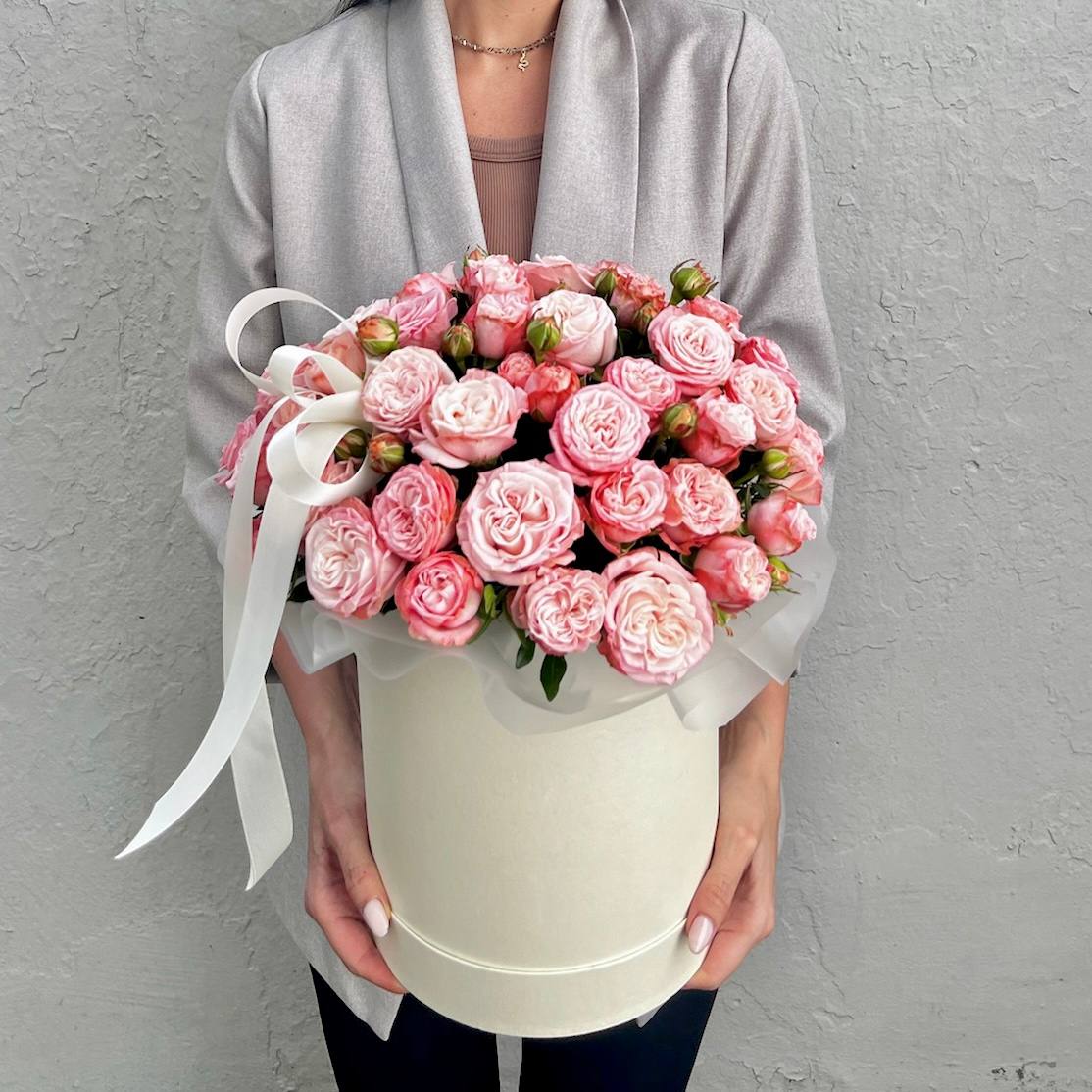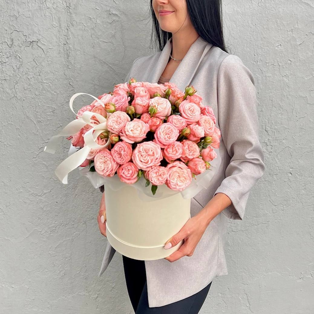 Роза кустовая пионовидная «Мадам Бомбастик» — 15 шт., шляпная коробка 20х25 см., флористическая губка, атласная лента.