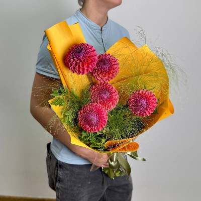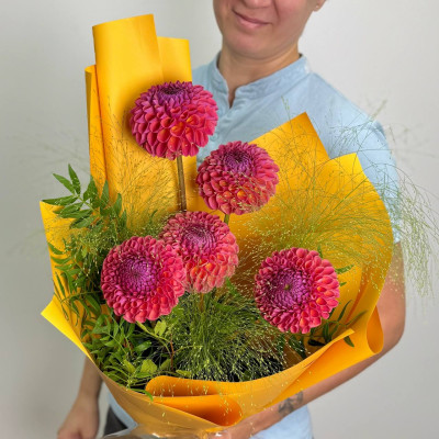 Яркий и выразительный букет, созданный для того, чтобы подарить радость и восхищение. В нём гармонично сочетаются пять пышных георгин, добавляющих букету насыщенности и глубины, три стебля паникума, которые привносят динамику и лёгкость, а зелень освежает композицию и придаёт ей естественность. Всё это упаковано в стильную фирменную упаковку, которая подчёркивает изысканность букета. Этот букет станет прекрасным подарком для любого случая.