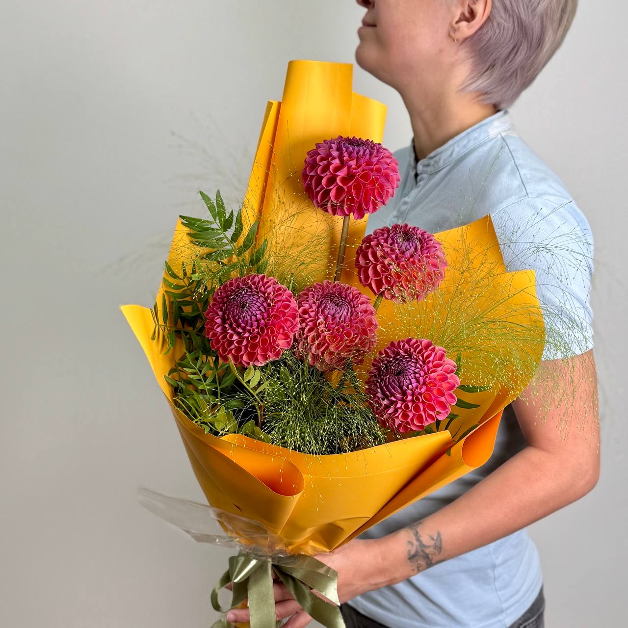 Георгина — 5 шт., паникум — 3 шт., зелень, фирменная упаковка, атласная лента.