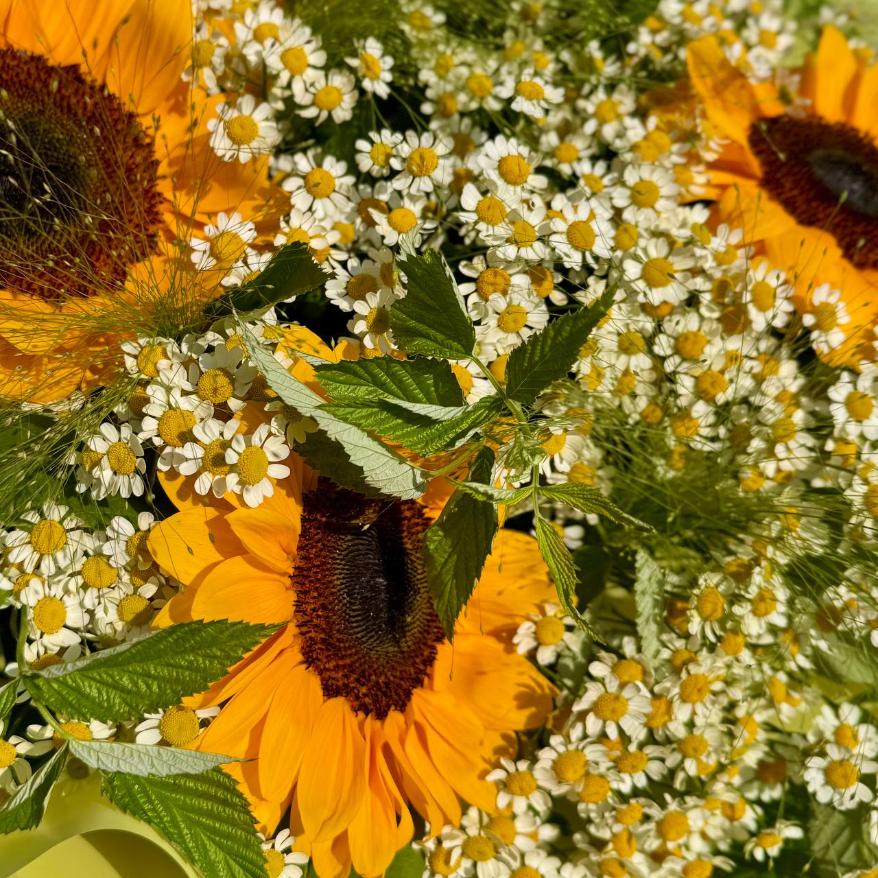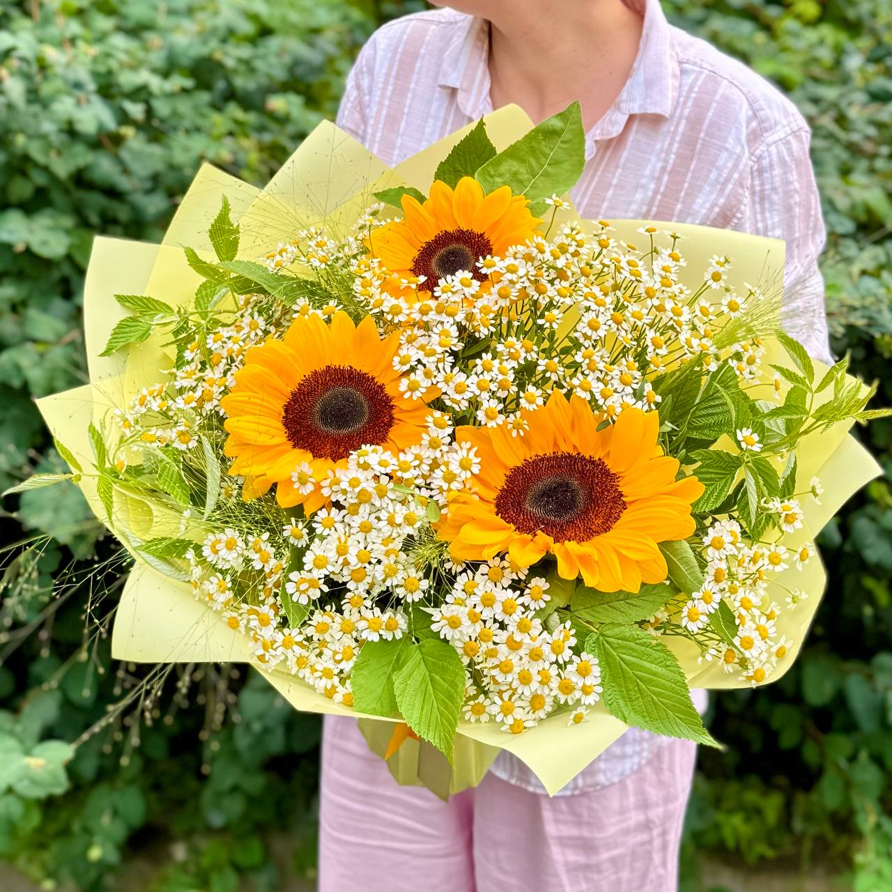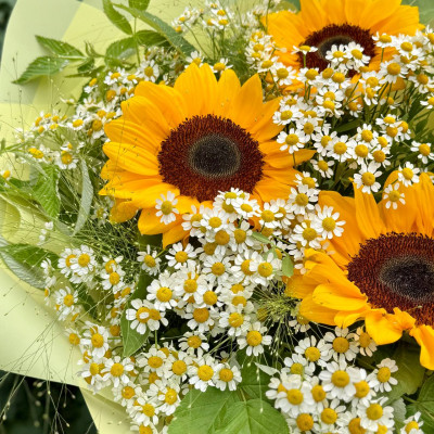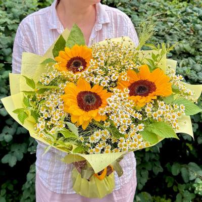 Яркий и красочный букет, который станет отличным подарком для любого человека. В его составе — 11 пушистых ромашек (танацетум, камила), три величественных подсолнуха и четыре стебля паникума. Всё это гармонично дополнено свежей зеленью, которая придаёт букету естественность и лёгкость.