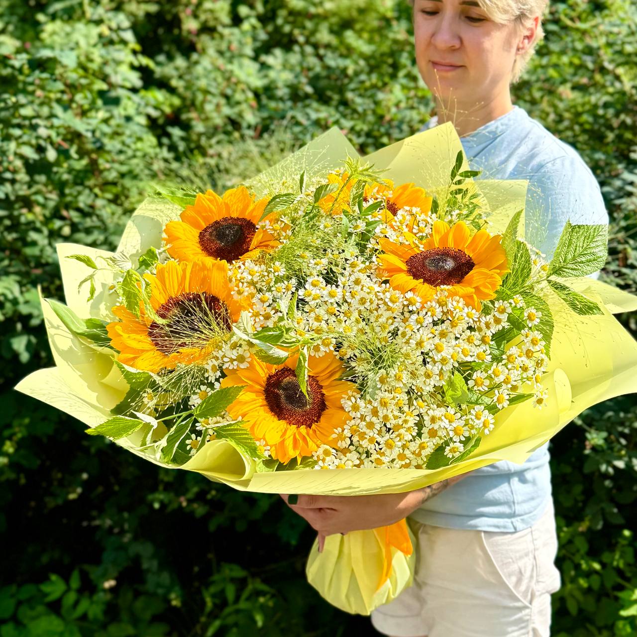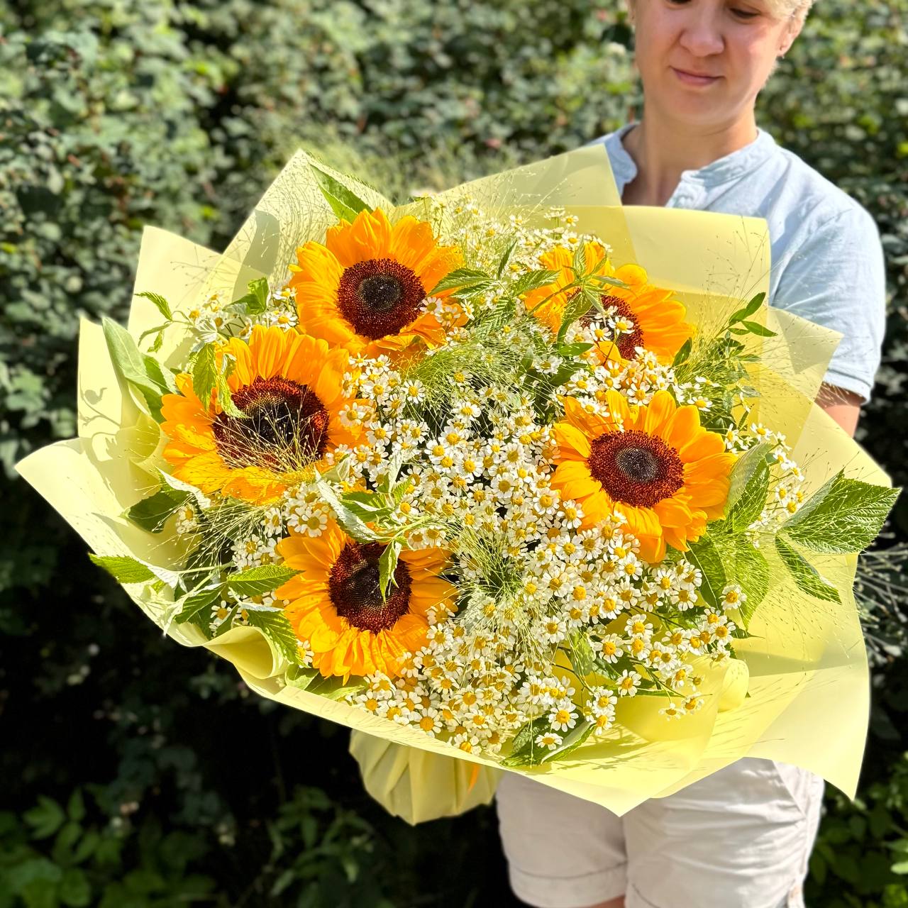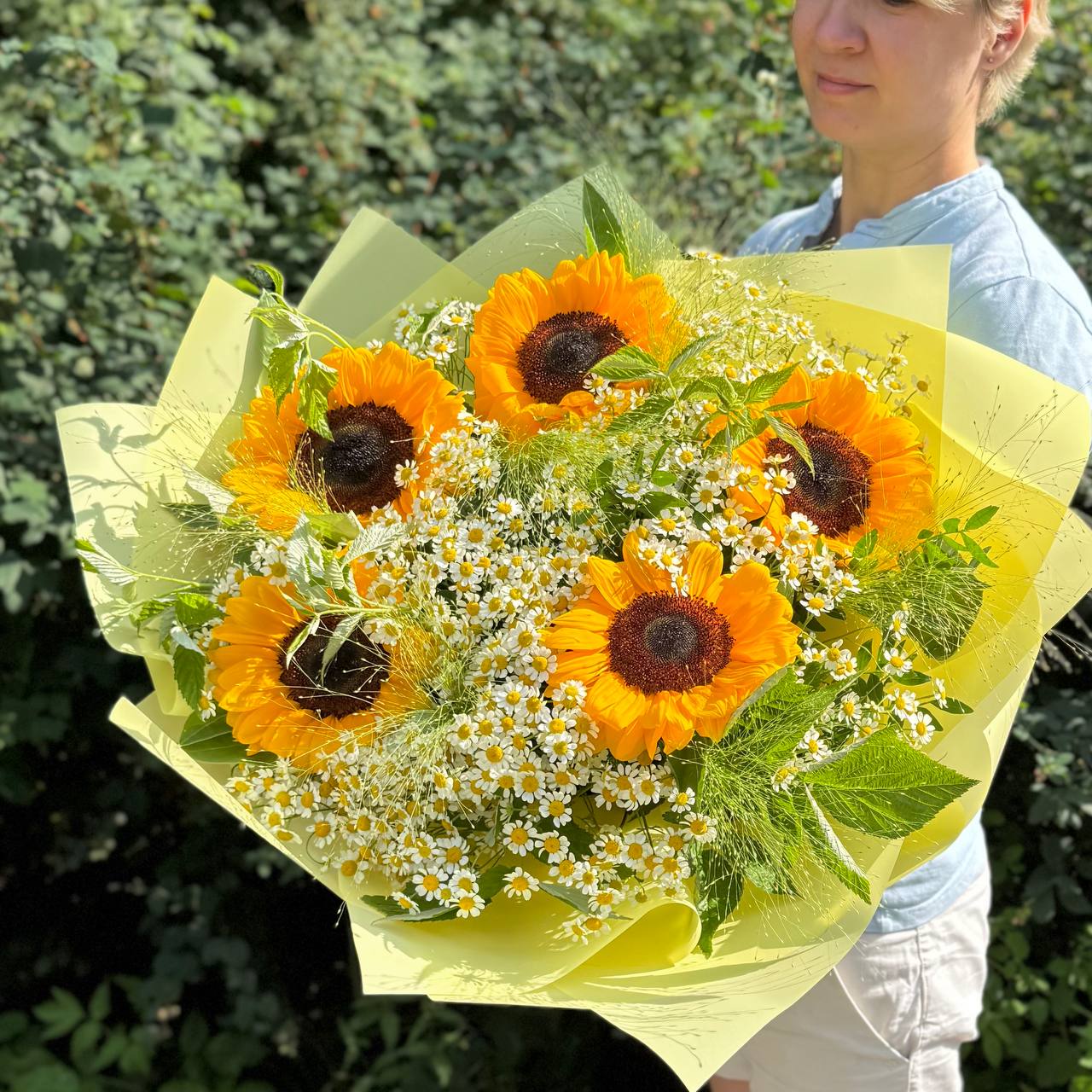 Подсолнух — 5 шт., ромашка (танацетум, камила) — 20 шт., паникум — 7 шт., зелень, фирменная упаковка, атласная лента.