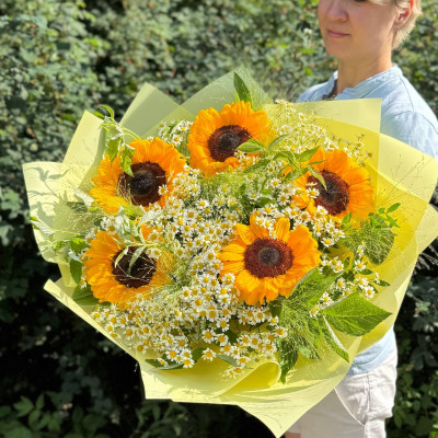 Яркий и жизнерадостный букет, который станет прекрасным подарком для любого человека. В нём собраны 20 нежных ромашек, 5 пышных подсолнухов и 7 стеблей паникума. Зелень добавляет букету свежести и объёма....