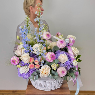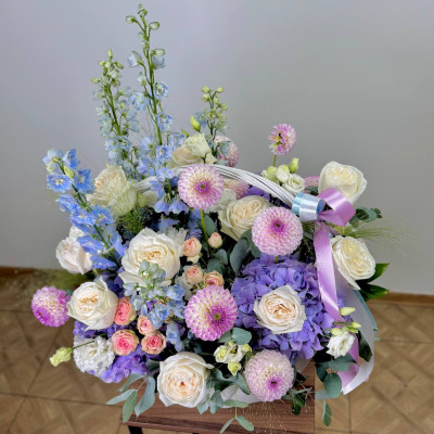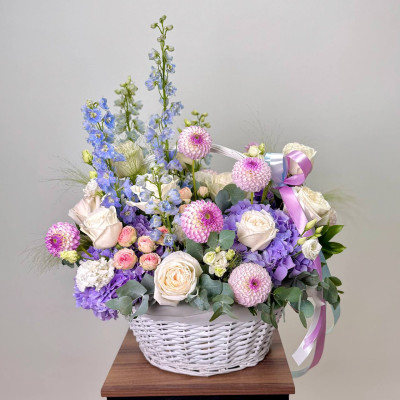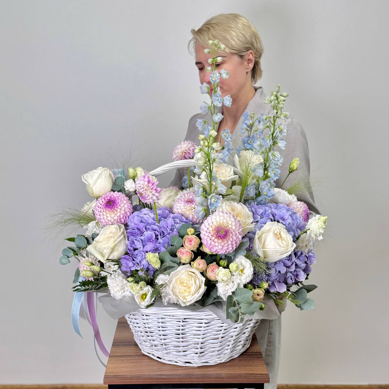 Гортензия фиолетовая «Галандия» — 4 шт., георгина — 10 шт., дельфиниум голубой — 5 шт., роза пионовидная «Экватор Вайт Охара» — 15 шт., роза пионовидная кустовая «Мадам Бомбастик» — 5 шт., эустома «Алиса Вайт» — 5 шт., паникум — 7 шт., зелень, корзина, флористическая губка, атласная лента.