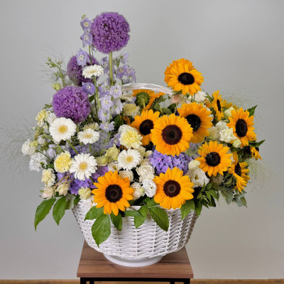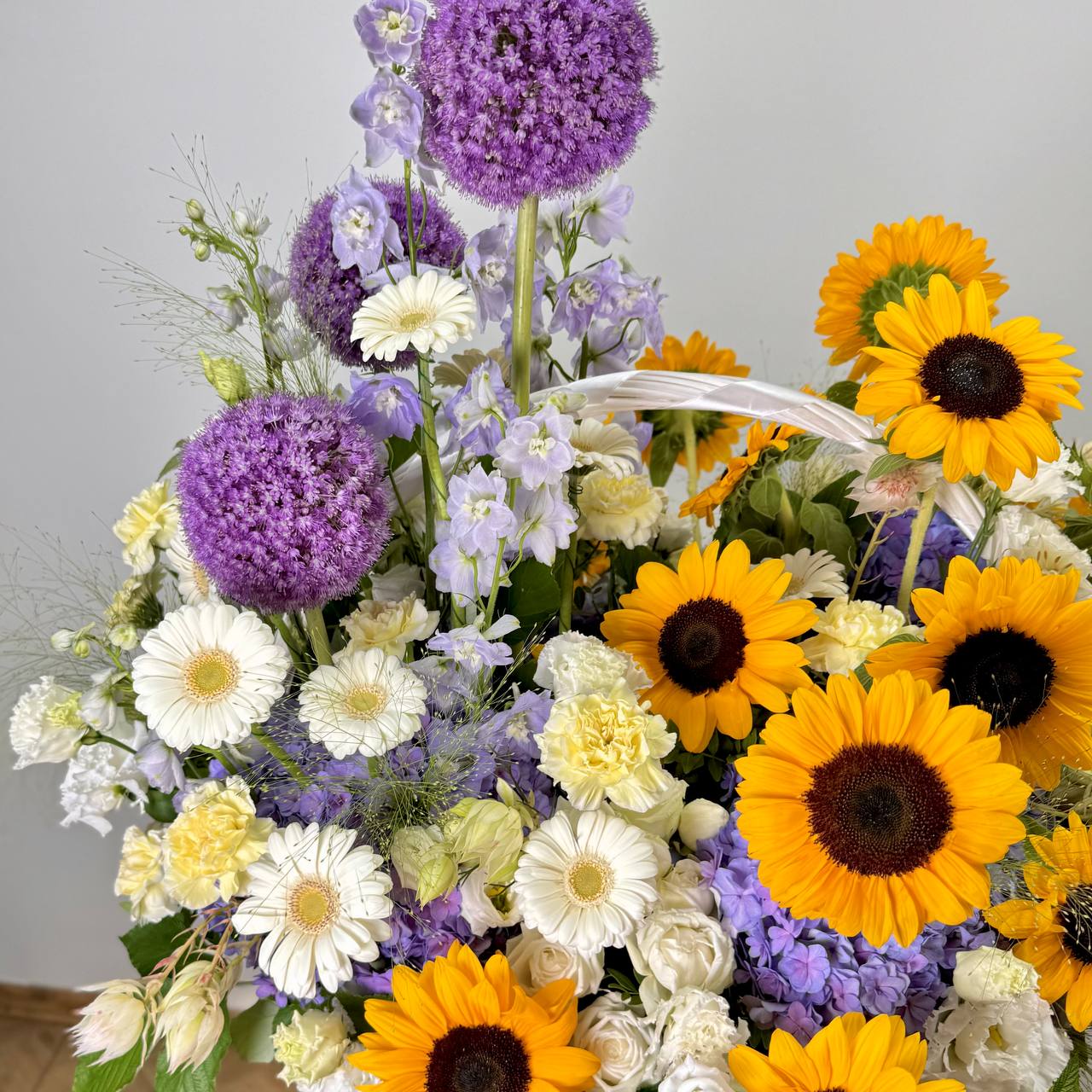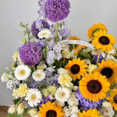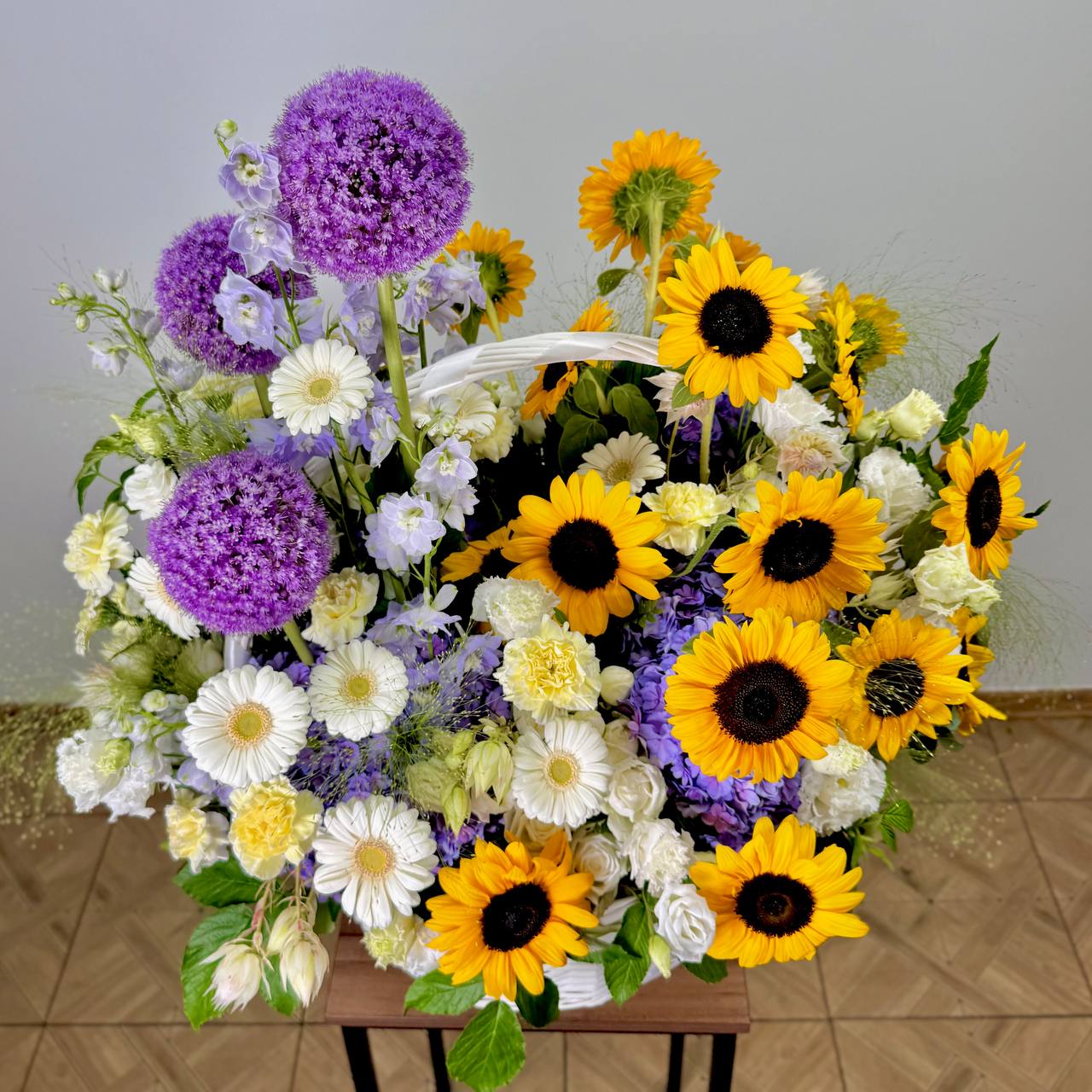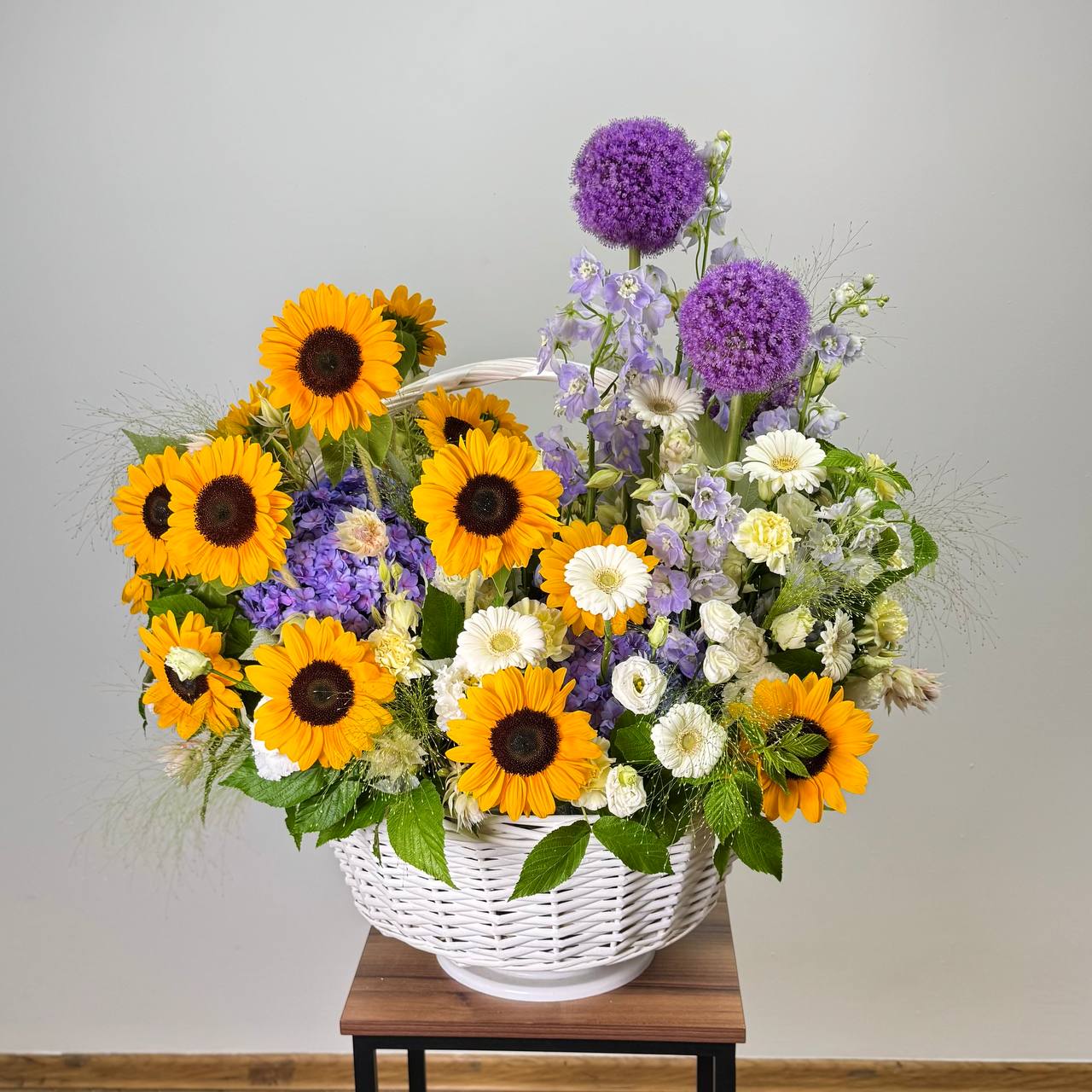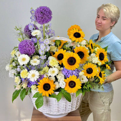 Подсолнух — 21 шт., гортензия фиолетовая «Галандия» — 4 шт., эустома «Алиса Вайт» — 10 шт., дельфиниум голубой — 7 шт., гермини белая — 15 шт., паникум — 15 шт., аллиум фиолетовый — 3 шт., серурия — 10 шт., диантус (гвоздика) желтый — 15 шт., зелень, корзина, флористическая губка.