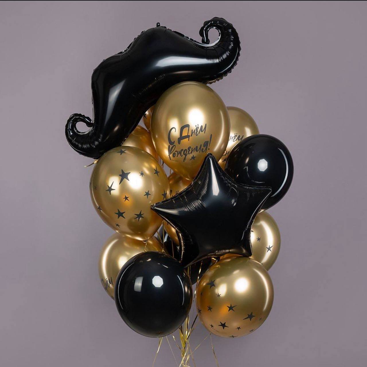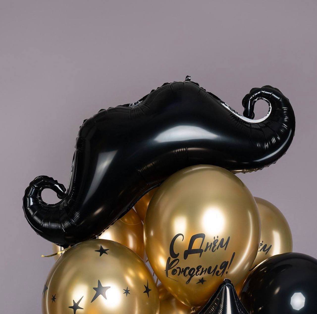 Фольгированный шар «Усы» — 1 шт., фольгированный шар «Звезда» — 1 шт., латекс черный — 5 шт., латекс «С днем рождения» — 8 шт., лента, грузик.