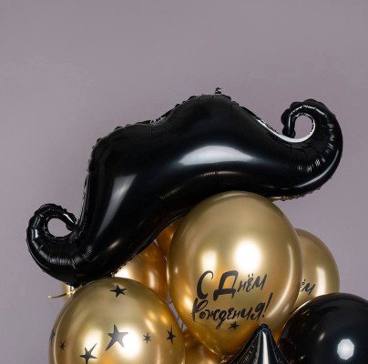 Связка шаров — это великолепный подарок для создания незабываемой атмосферы на дне рождения мужчины. В центре композиции величественно возвышаются фольгированные шары «Усы» и «Звезда». Они словно символизируют радость и праздничное настроение.