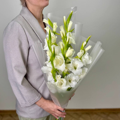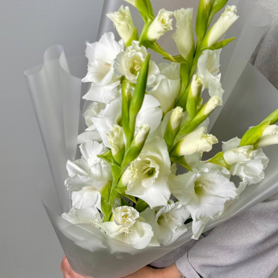 Изысканная композиция из пяти величественных гладиолусов словно устремляется ввысь, подобно колоннам белоснежного храма. Их стройные стебли, облаченные в атласную ленту, создают атмосферу торжественности и чистоты, даря окружающим ощущение возвышенной красоты.