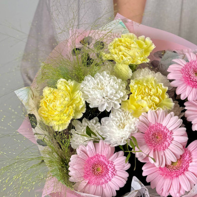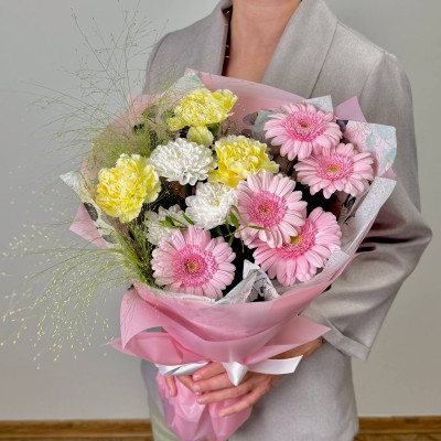 Гермини розовые — 5 шт., хризантема кустовая — 1 шт., диантус желтый — 3 шт., паникум — 1 шт., зелень, фирменная упаковка, атласная лента.