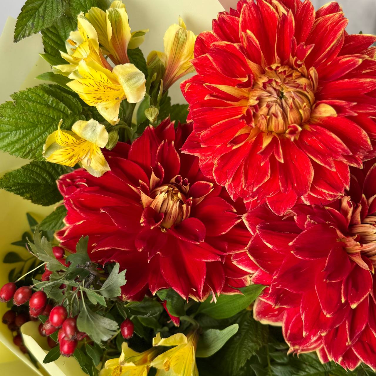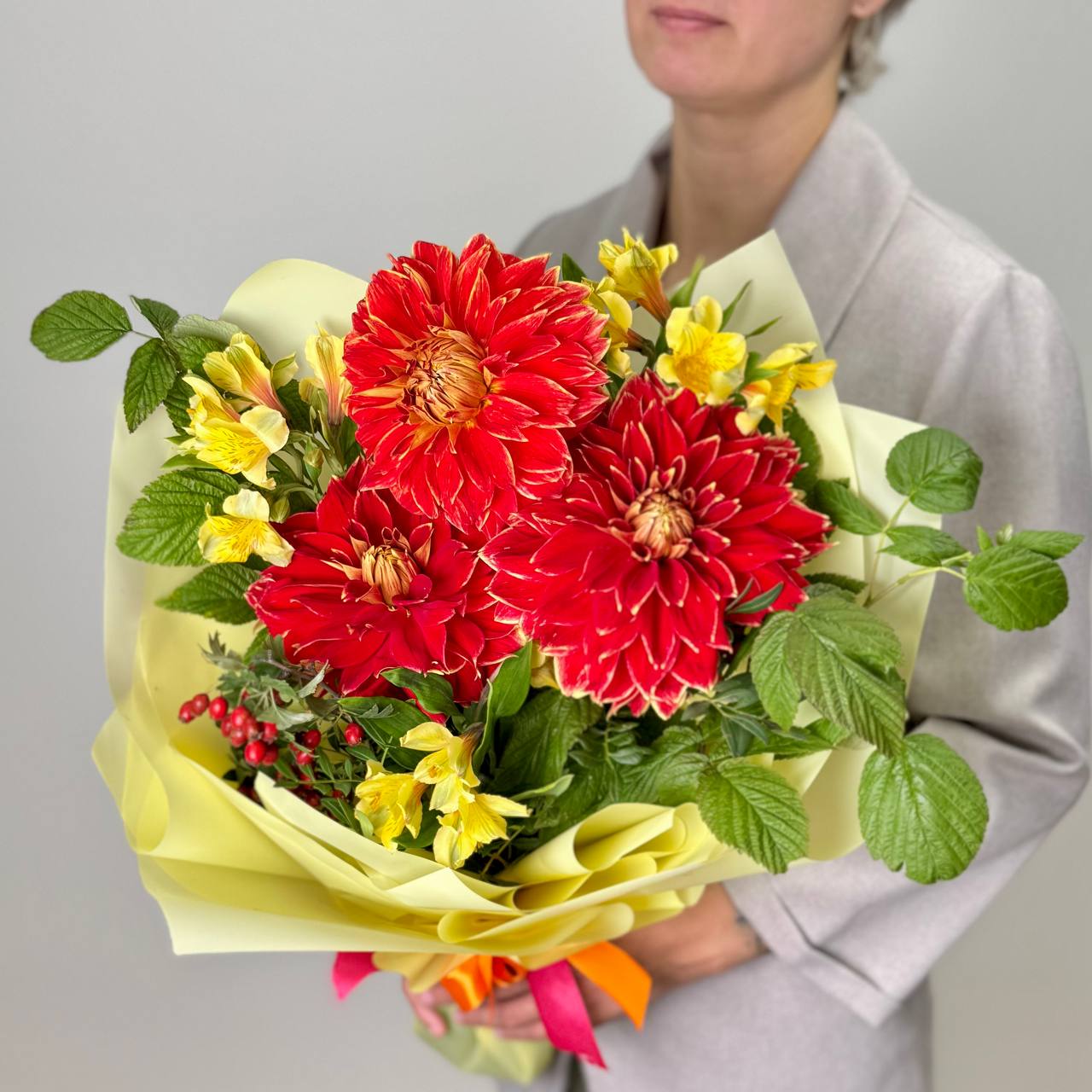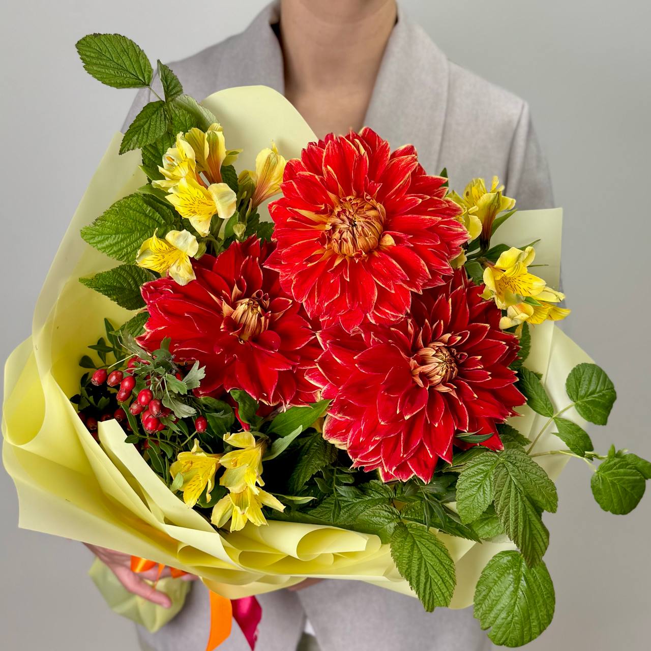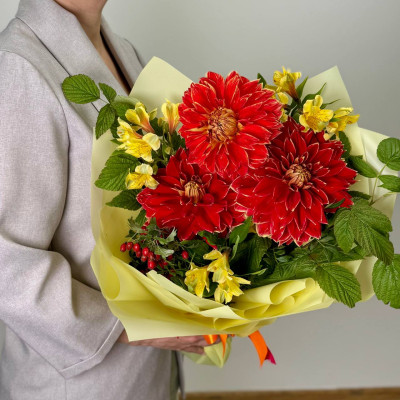 Альстромерия желтая — 3 шт., георгина оранжевая — 3 шт., рябина — 1 шт., зелень, фирменная упаковка, атласная лента.