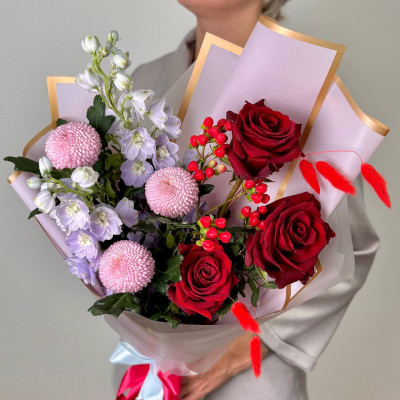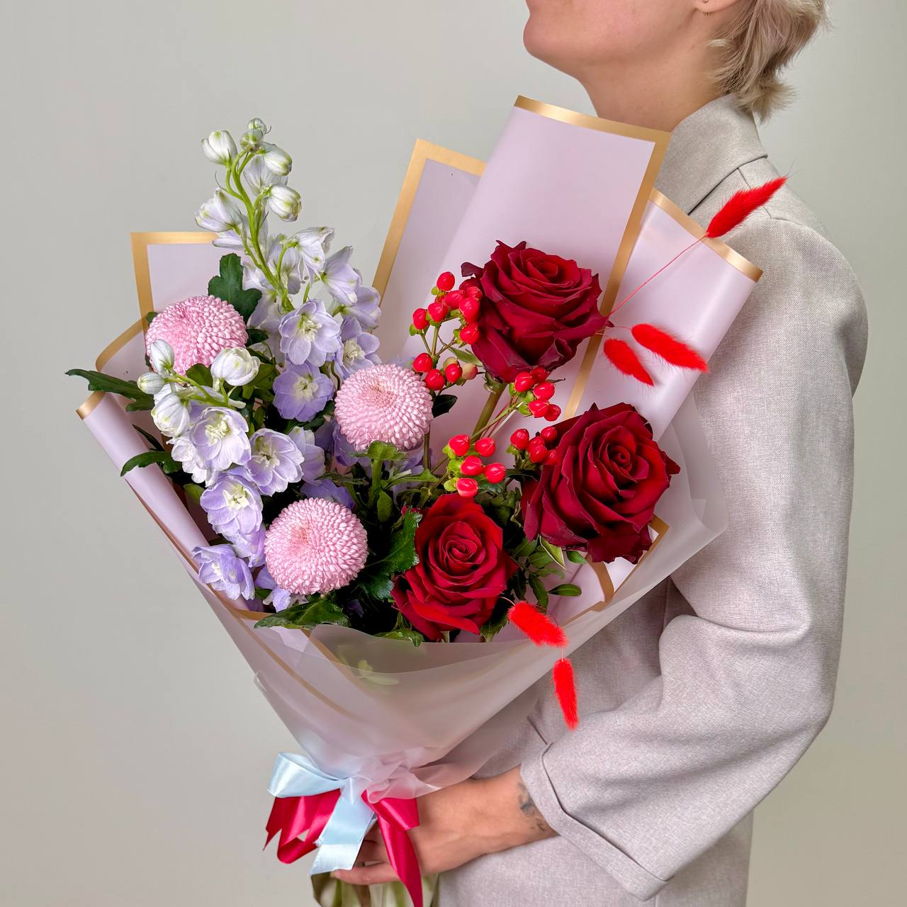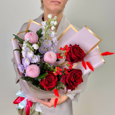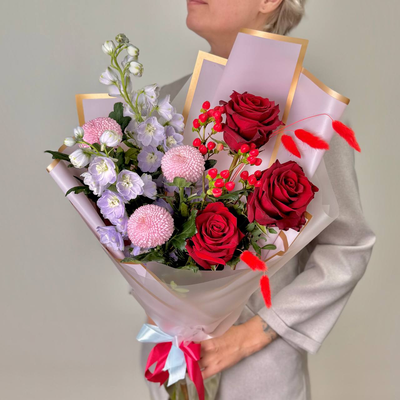 Дельфиниум голубой — 2 шт., хризантема «Момоко» — 3 шт., роза «Россия Ред Наоми» — 3 шт., лагурус красный — 5 шт., гиперикум красный — 1 шт., зелень, фирменная упаковка, атласная лента.