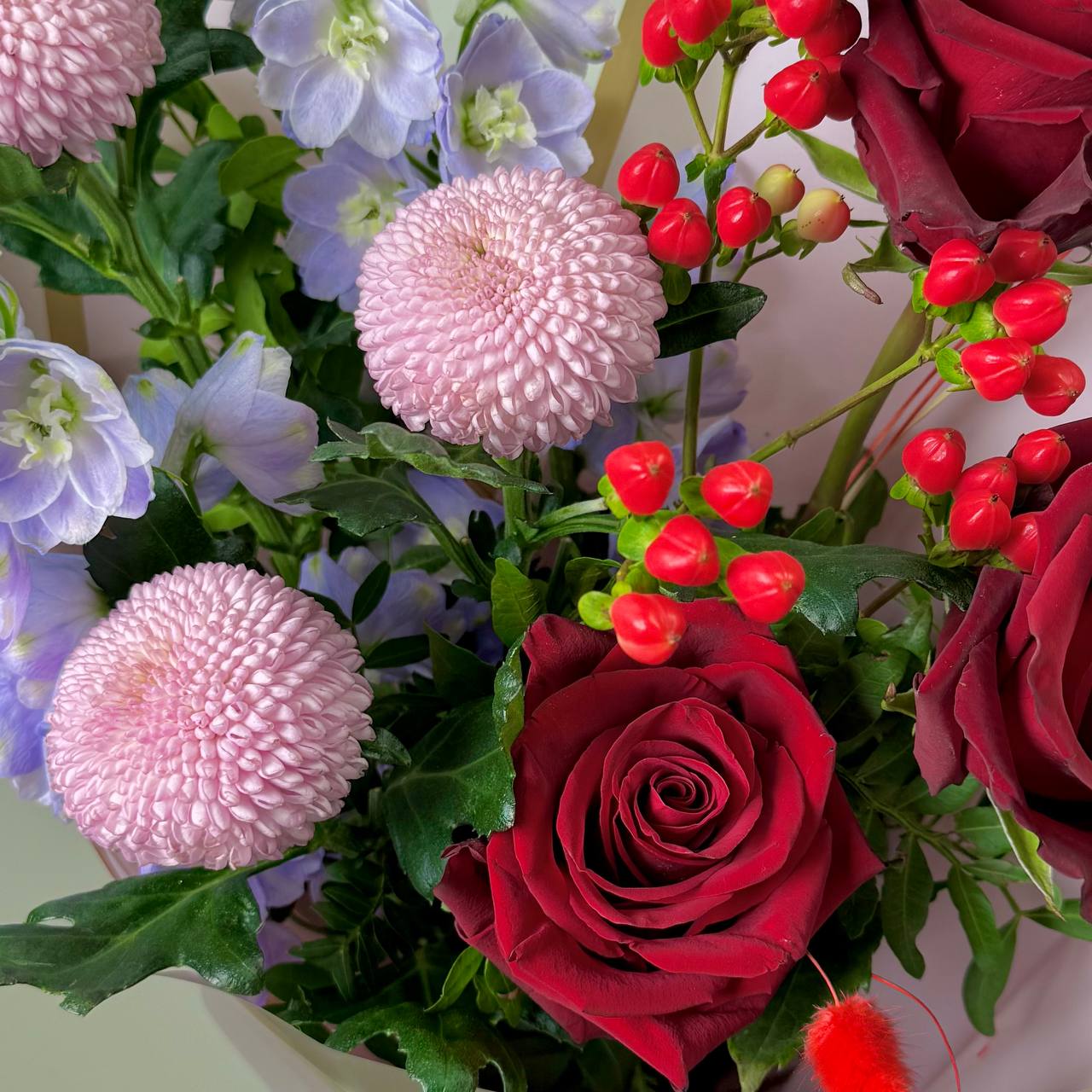 Два голубых дельфиниума возвышаются в букете, как символы верности и преданности. Три благородные хризантемы сорта «Момоко» добавляют букету изысканности и изящества. Три красные розы — символ любви и уважения — гармонично сочетаются с другими цветами.
