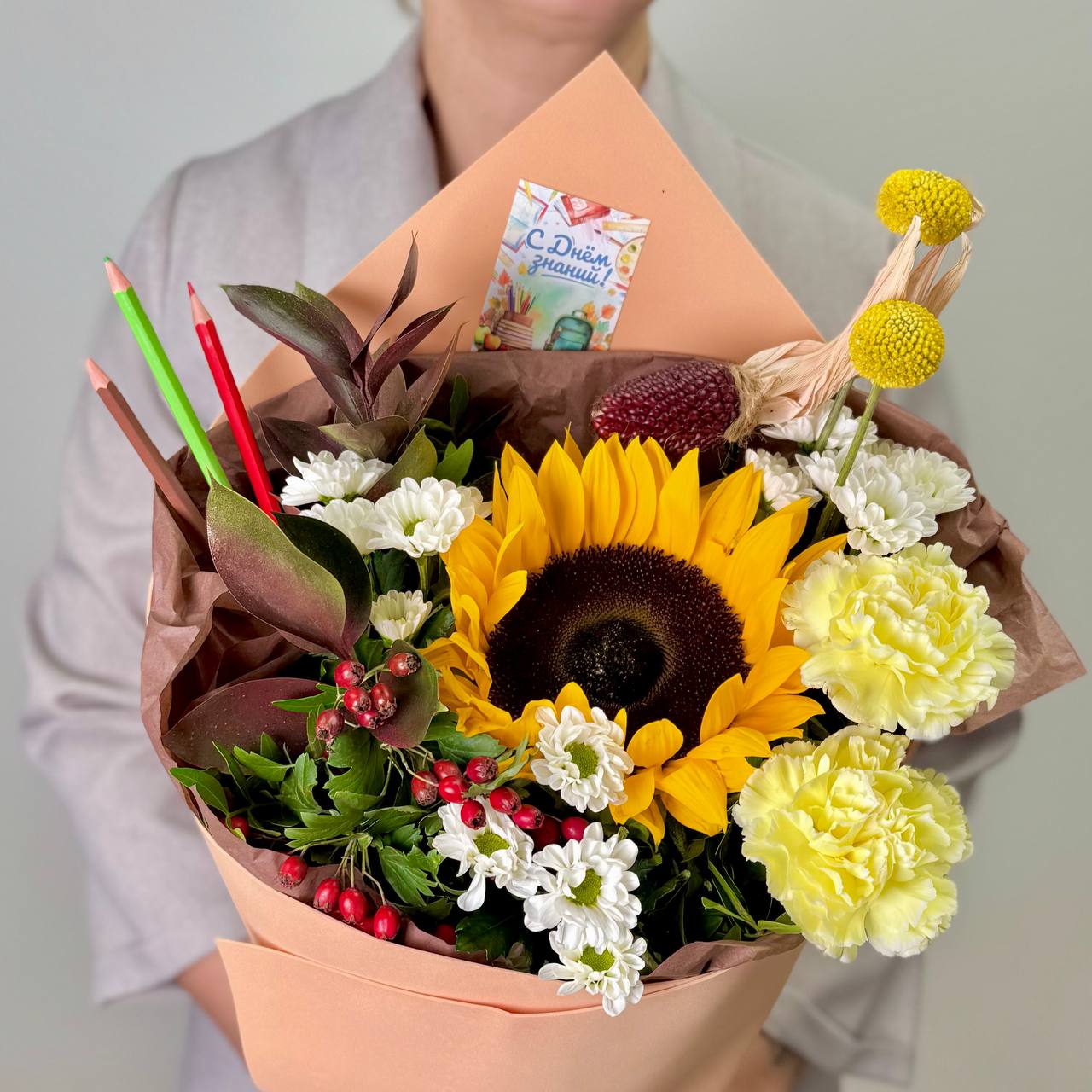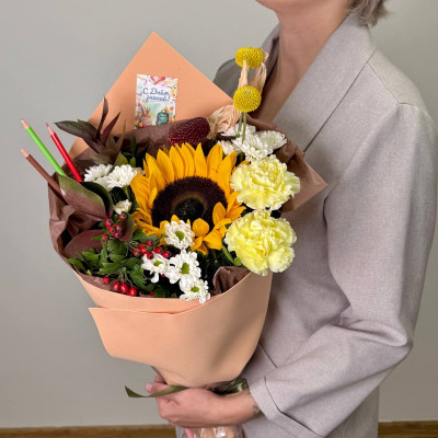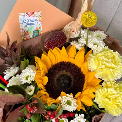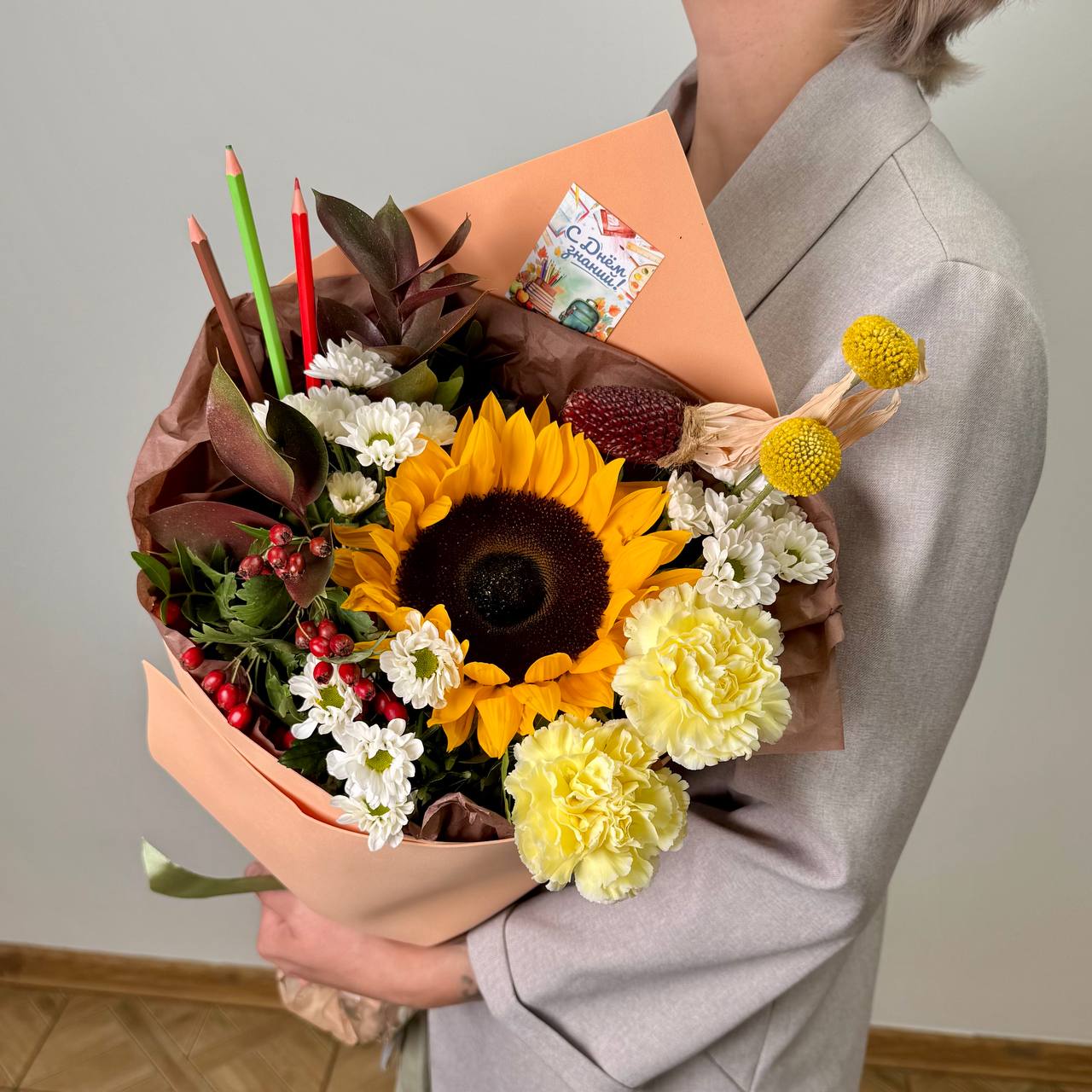 Этот букет — настоящее воплощение тёплых пожеланий и уважения. В его центре гордо возвышается подсолнух, словно обращающий свой взгляд к солнцу знаний. Две нежные жёлтые гвоздики (диантуса) и две краспедии добавляют букету яркие акценты, наполняя его радостью и оптимизмом.