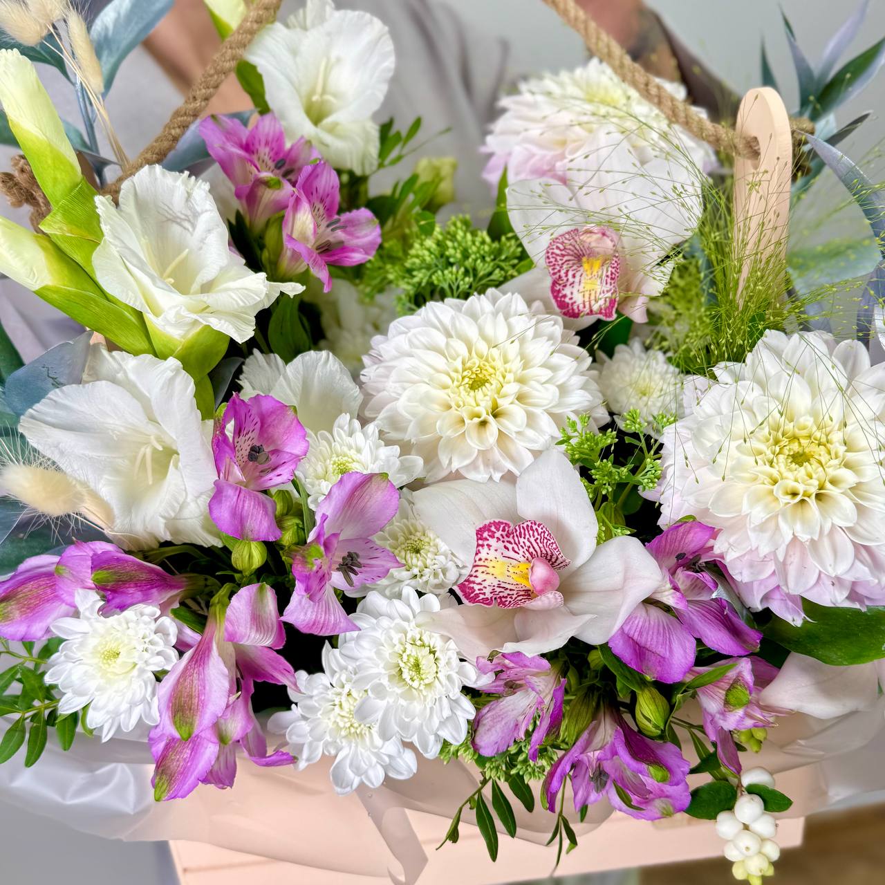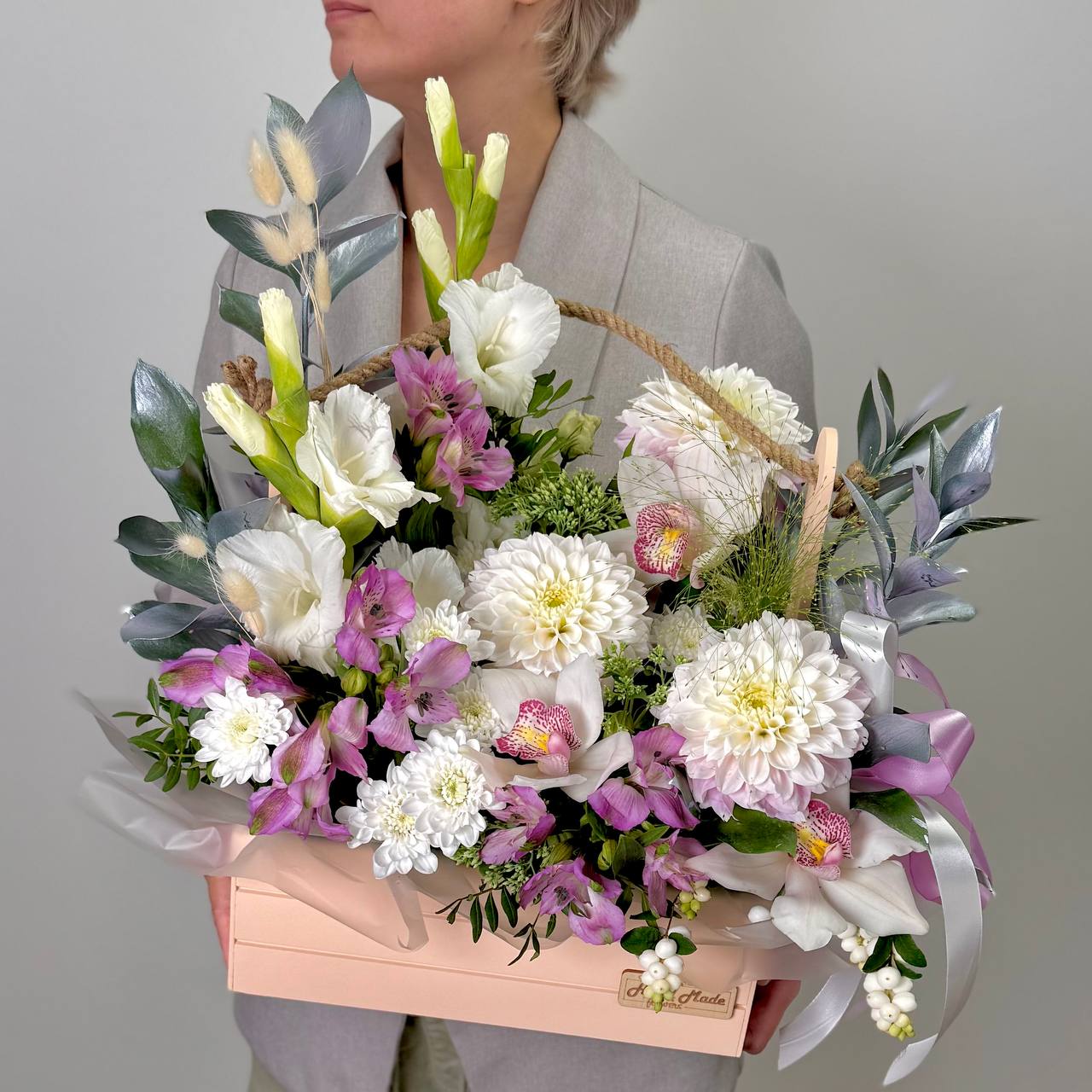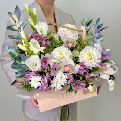 Георгина — 3 шт., гладиолус — 2 шт., альстромерия фиолетовая — 3 шт., трахелиум — 2 шт., хризантема кустовая — 1 шт., паникум — 1 шт., цимбидиум (орхидея) — 3 шт., зелень, ящик, юбочка, флористическая губка, атласная лента.