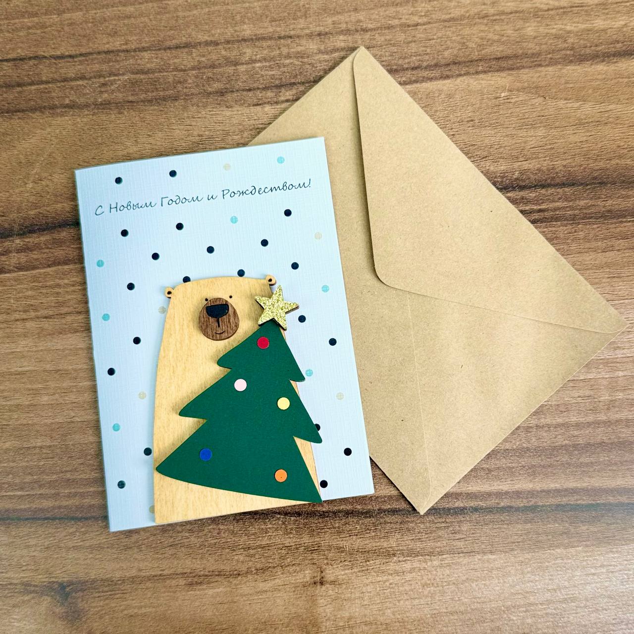 Объёмные элементы создают игру света и тени, превращая обычную открытку в миниатюрный праздничный мир. Кажется, будто сквозь неё проглядывает заснеженный пейзаж или мерцают огни новогодней ёлки — остаётся лишь додумать сказку, которую она обещает рассказать.