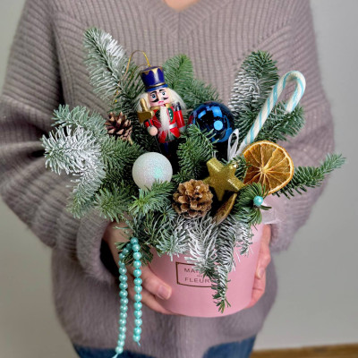 Нобилис — 1 шт., туя — 1 шт., новогодние игрушки — 15 шт., игрушка девочка — 1 шт., гирлянда — 1 шт., серебрянные ветви, бархатная шляпная коробка 18х20 см., флористическая губка, атласная лента.