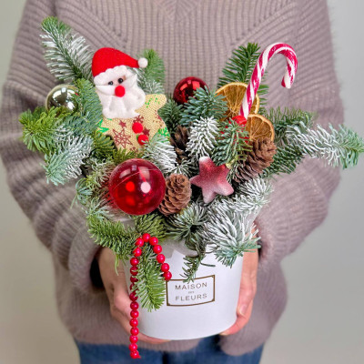 Нобилис — 1 шт., туя — 3 шт., свеча «Зайка» — 1 шт., карамельная трость (съедобная) — 2 шт., гирлянда с огоньками — 1 шт., новогодние игрушки — 8 шт., шишки — 3 шт., снежинка — 1 шт., флористическая губка, фирменная упаковка, атласная лента.